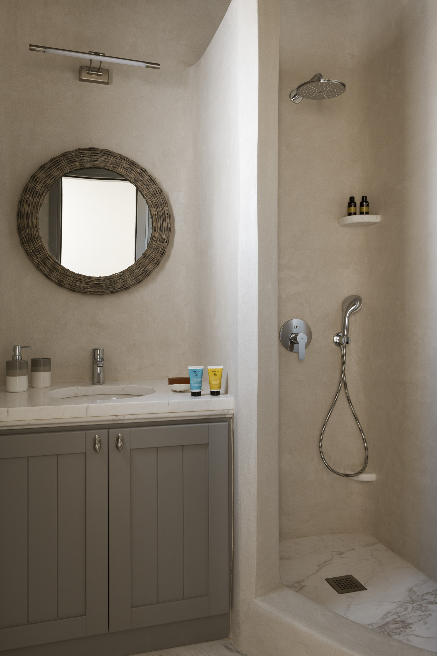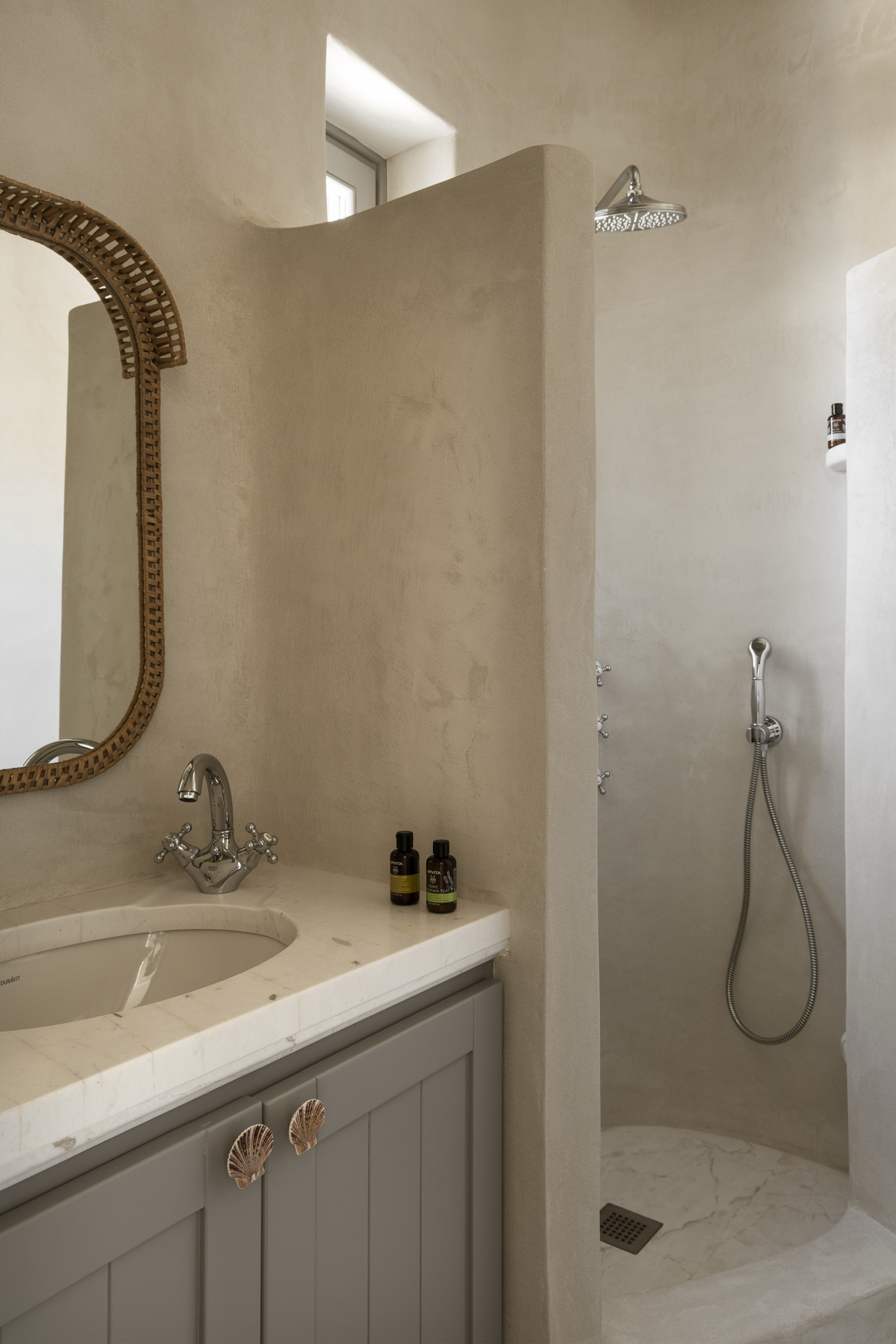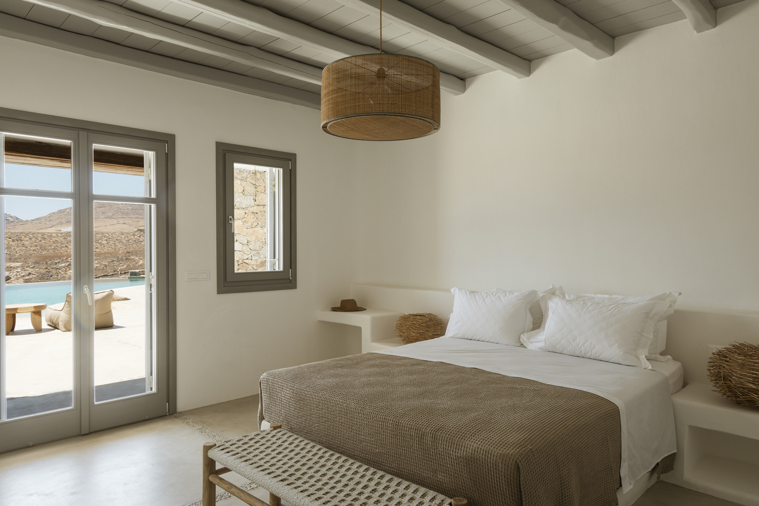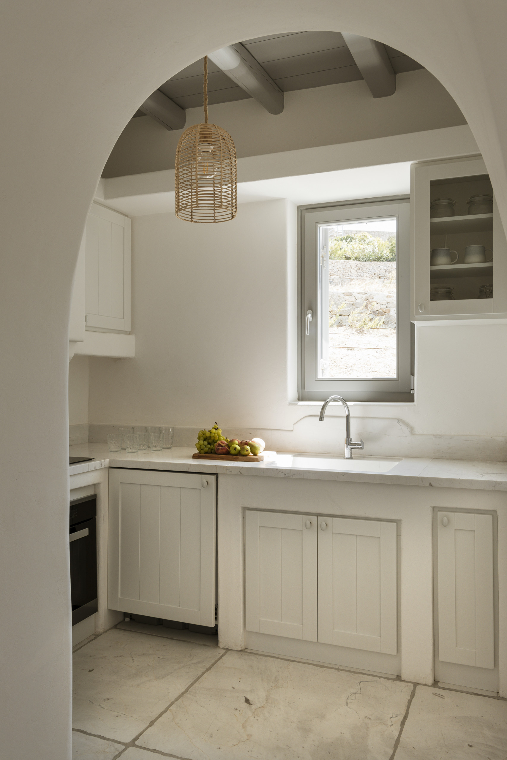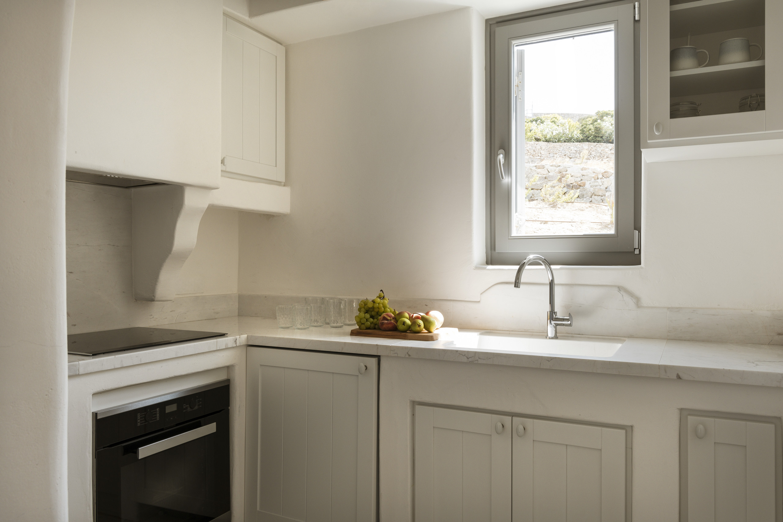 All the houses feature their own equipped kitchen, a cozy, relaxing living room and dining furnishings. In one of the houses, the dining and living room are a bit larger in case the whole group needs to gather inside. The bathrooms also bear the essence of the Cyclades with their traditional shower rooms and sinks while the bedrooms are elegantly decorated in bright white and beige hues with soft colour touches to let the natural light travel freely throughout all corners.