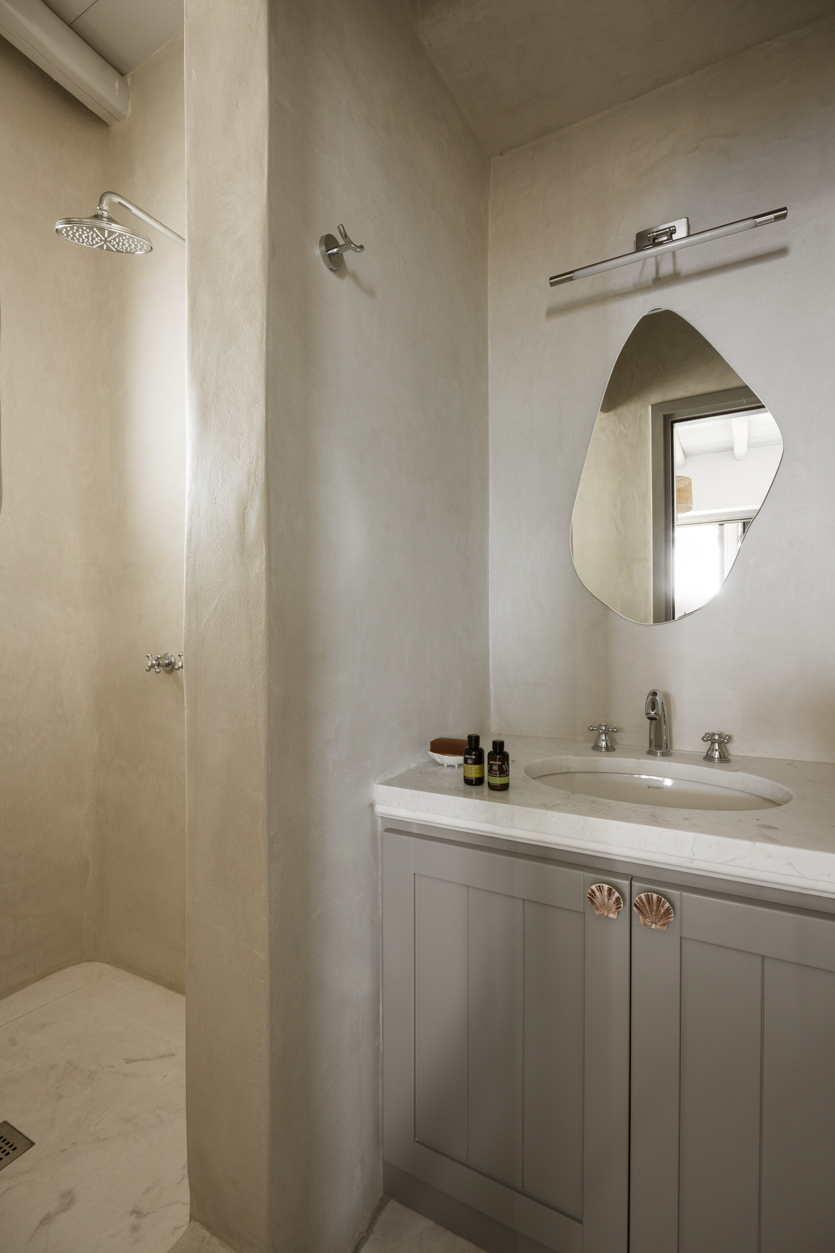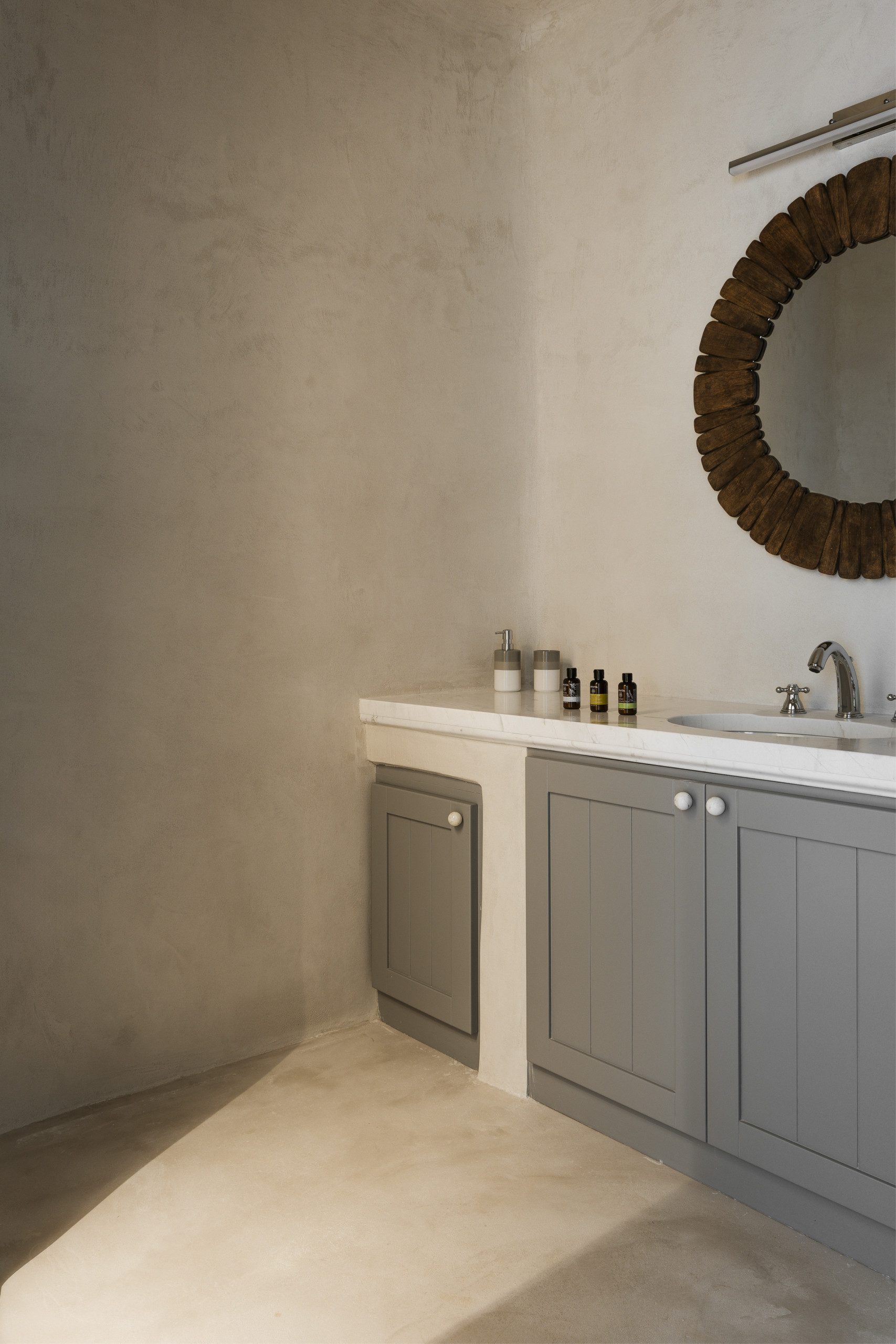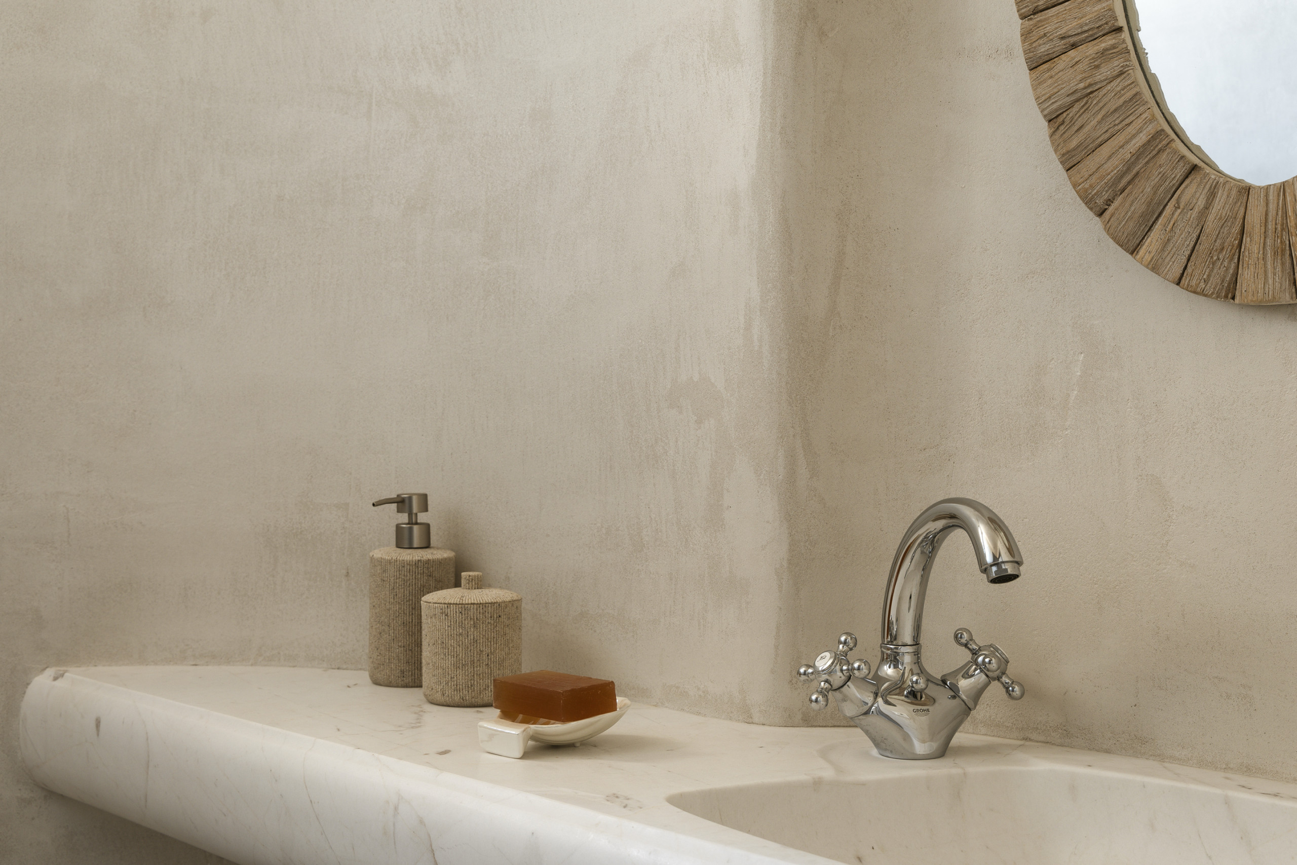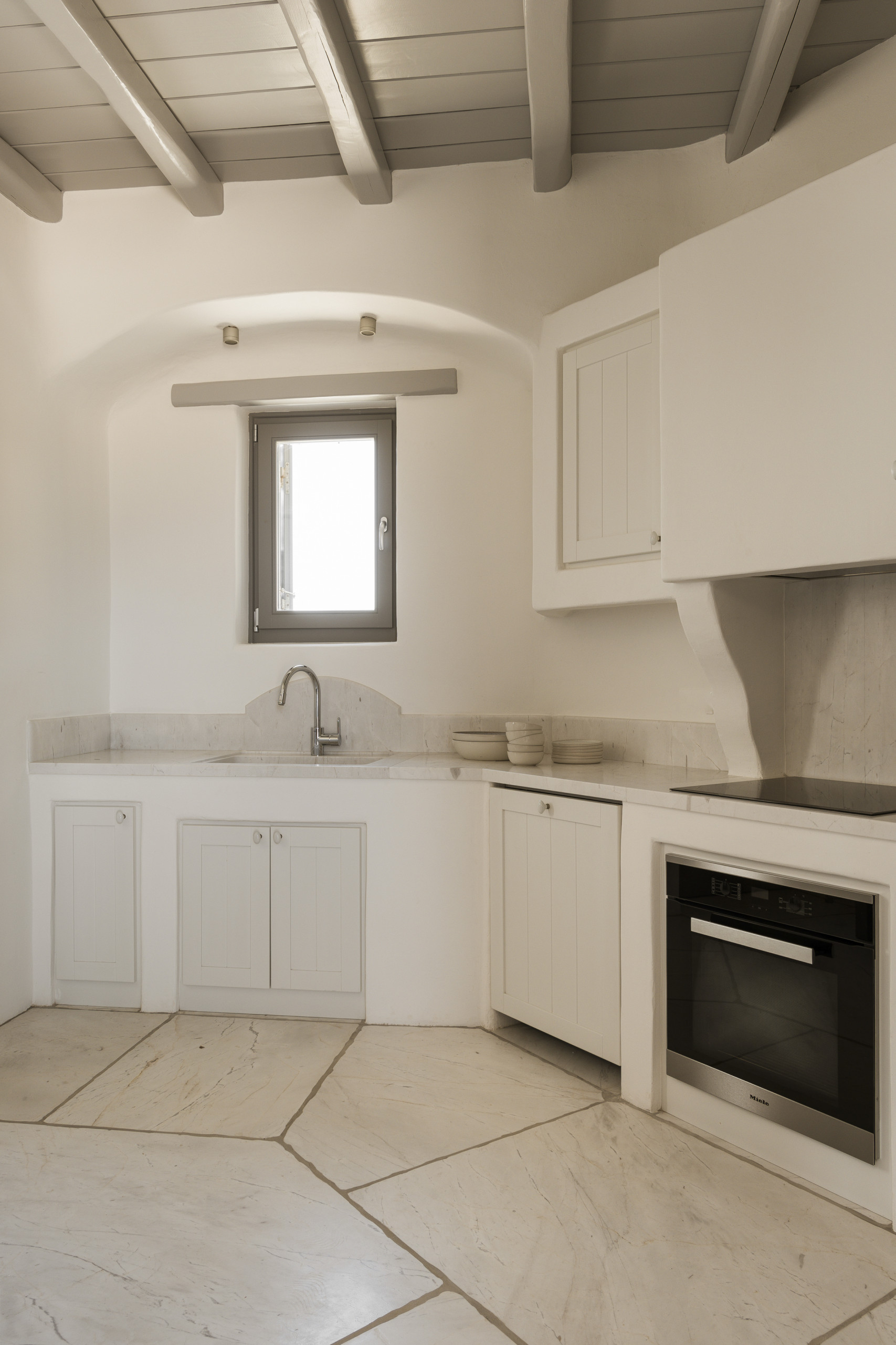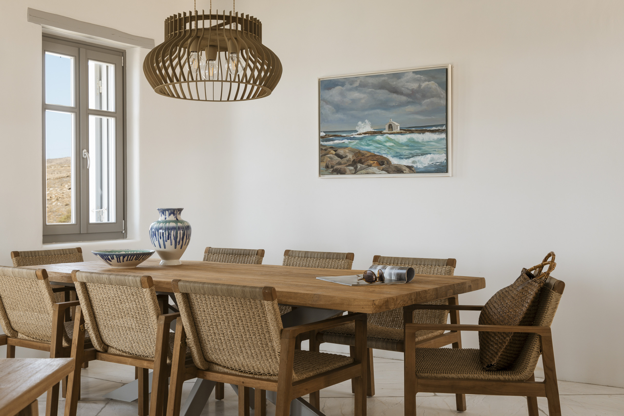 All the houses feature their own equipped kitchen, a cozy, relaxing living room and dining furnishings. In one of the houses, the dining and living room are a bit larger in case the whole group needs to gather inside. The bathrooms also bear the essence of the Cyclades with their traditional shower rooms and sinks while the bedrooms are elegantly decorated in bright white and beige hues with soft colour touches to let the natural light travel freely throughout all corners.