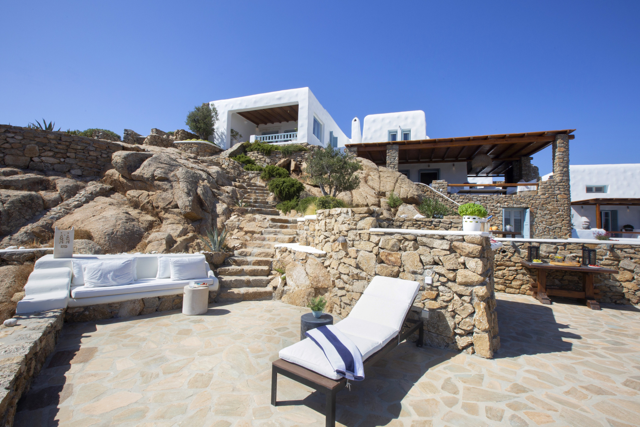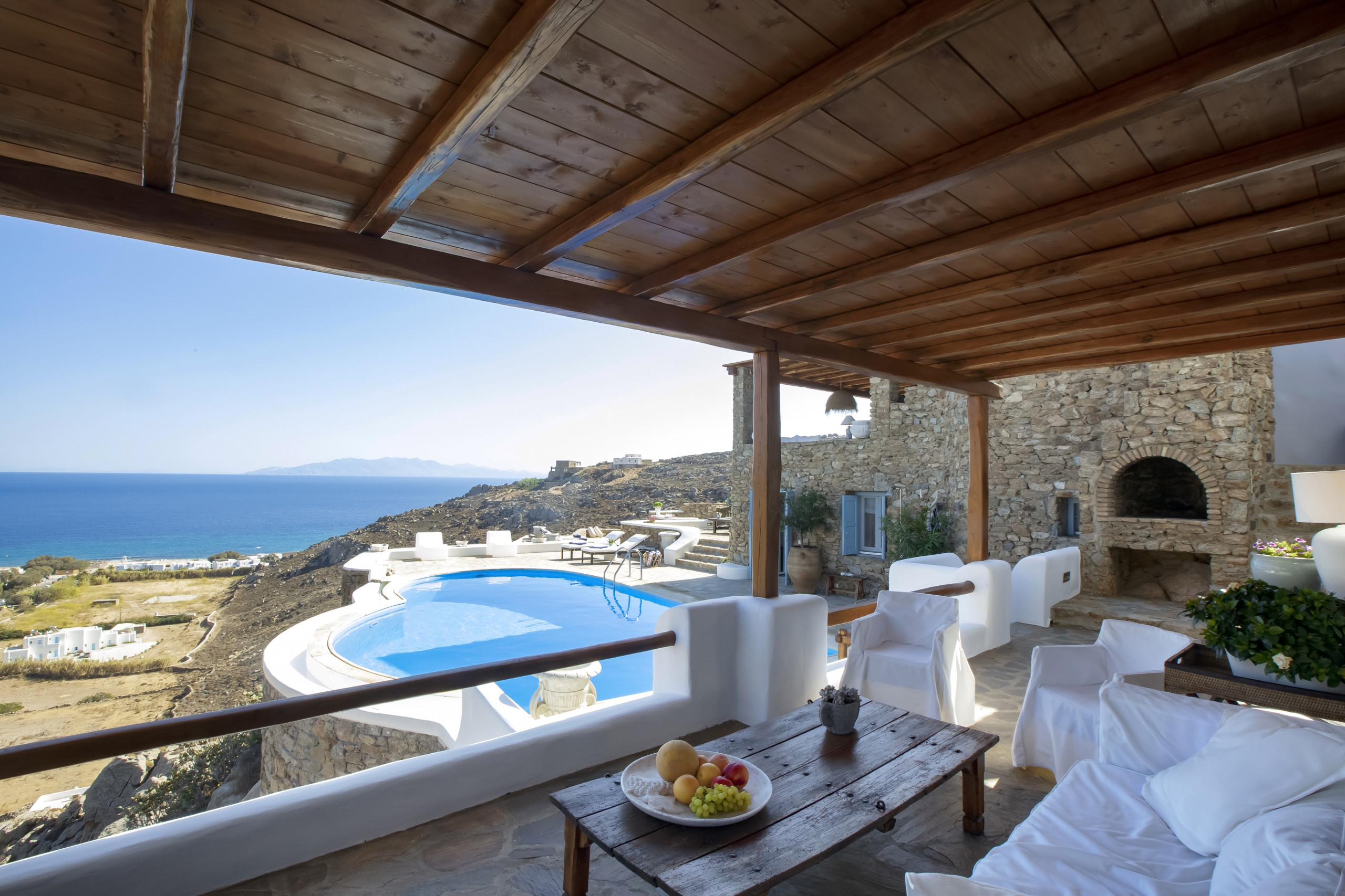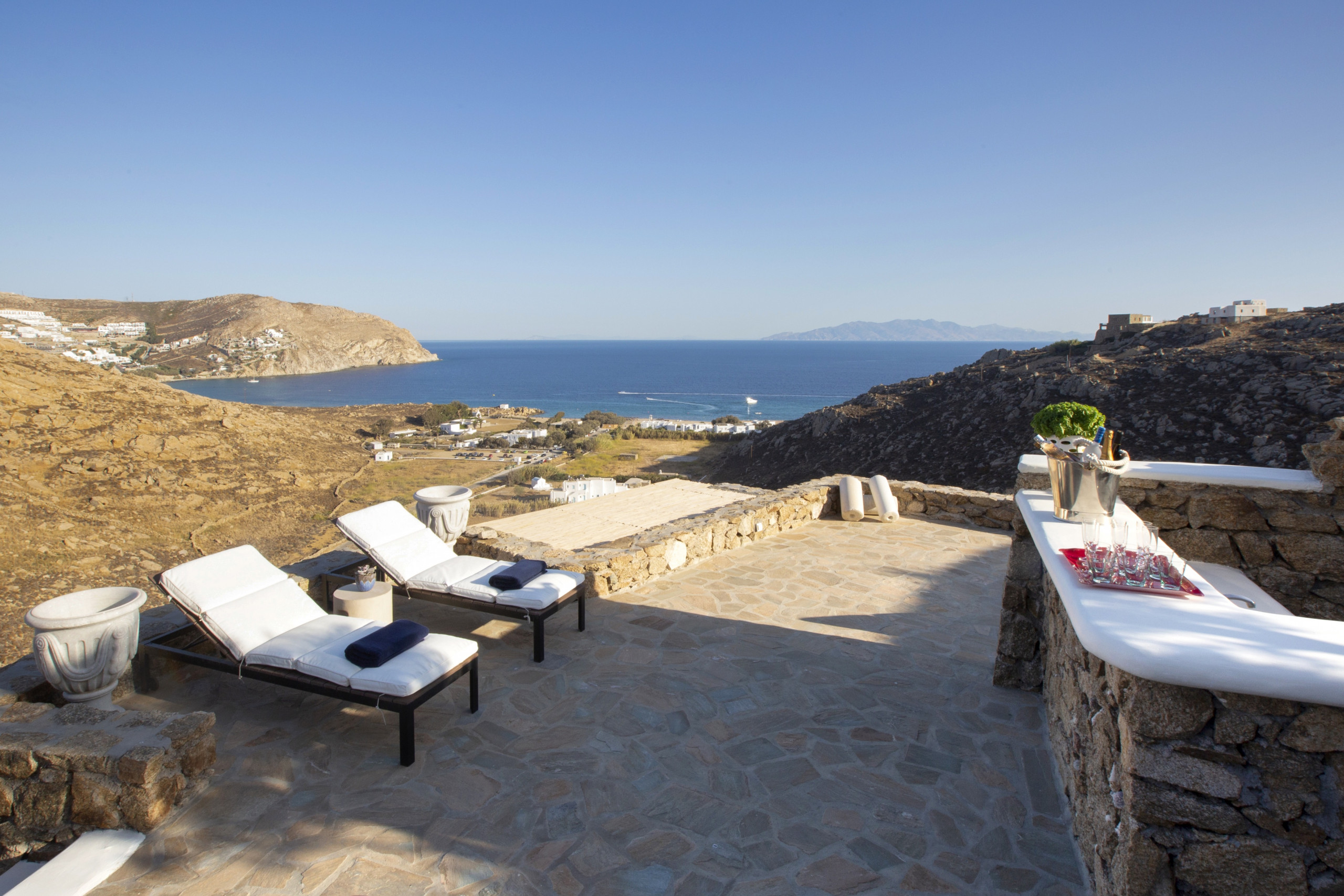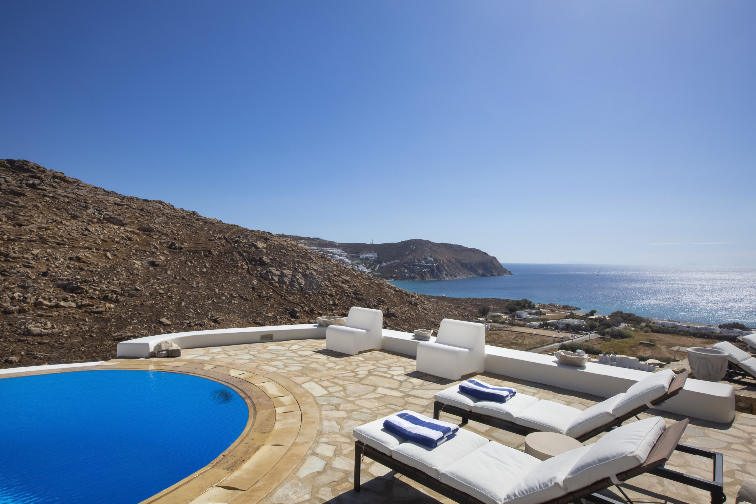 Perched on a hilltop with an encompassing and commanding view, you will relax by the pool, take pleasure in the outdoor bar or on one of its distinctively tiered verandas, delight in open-air dining, while enjoying discreet living areas in total privacy; then head out and enjoy all that Mykonos has to offer, like astounding beaches, Cycladic architecture and all facets of summer island life.