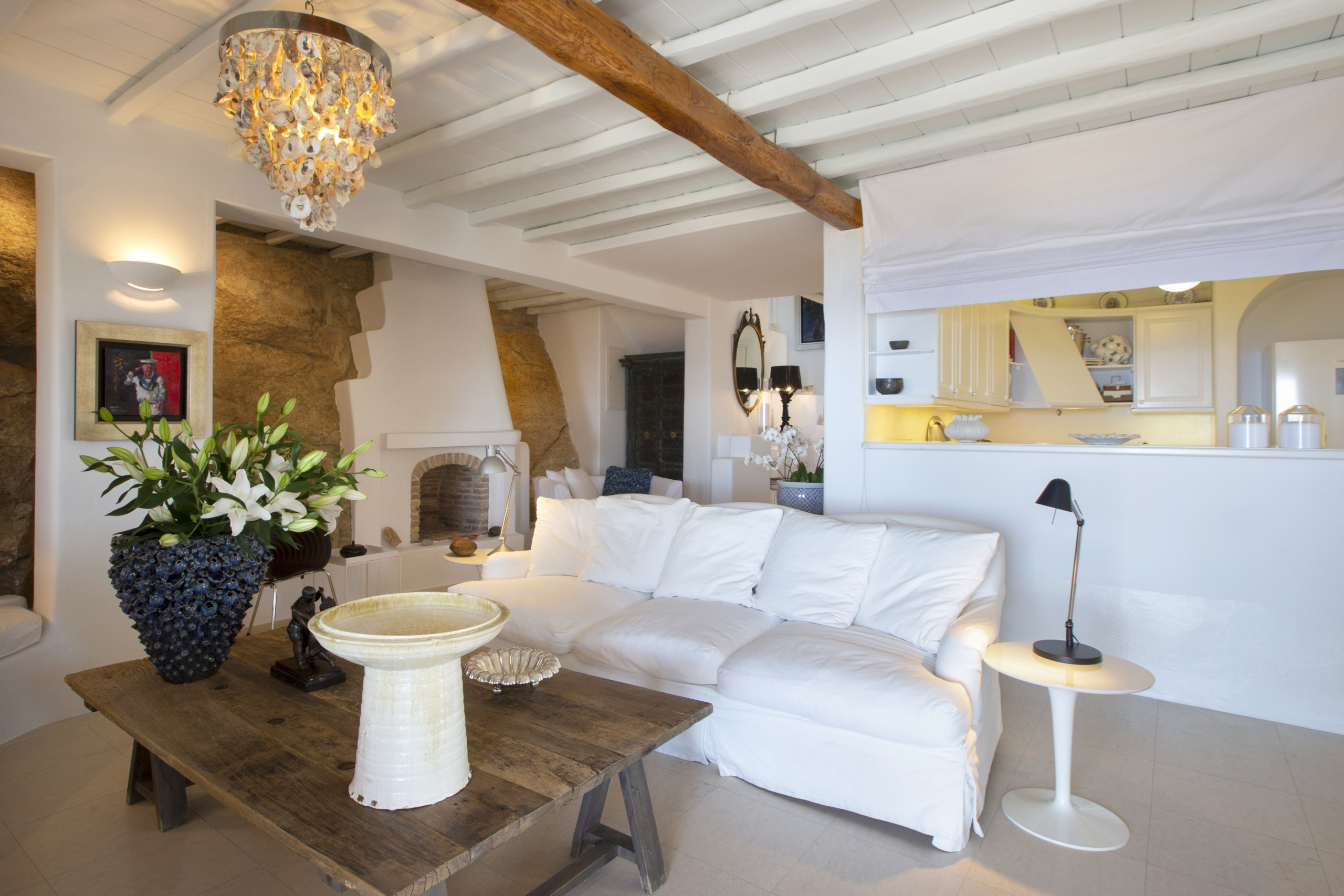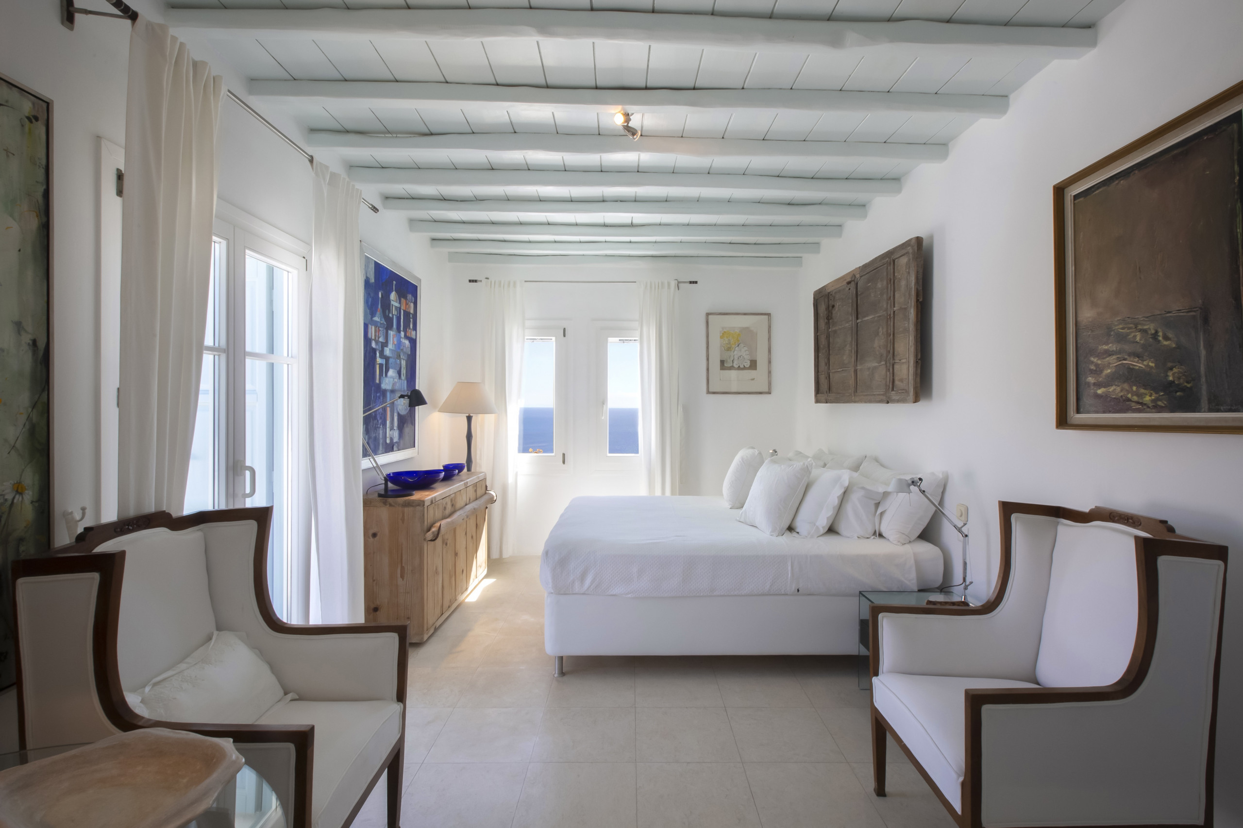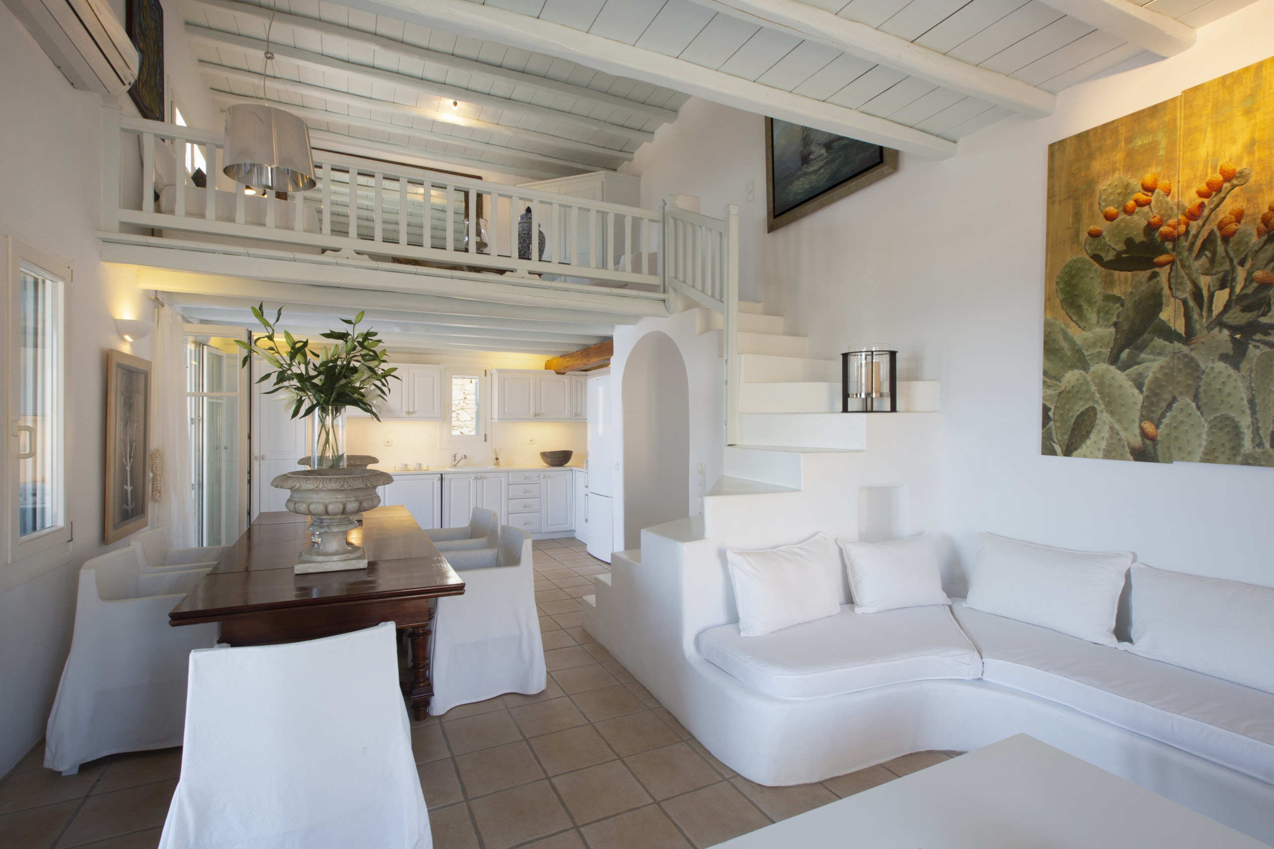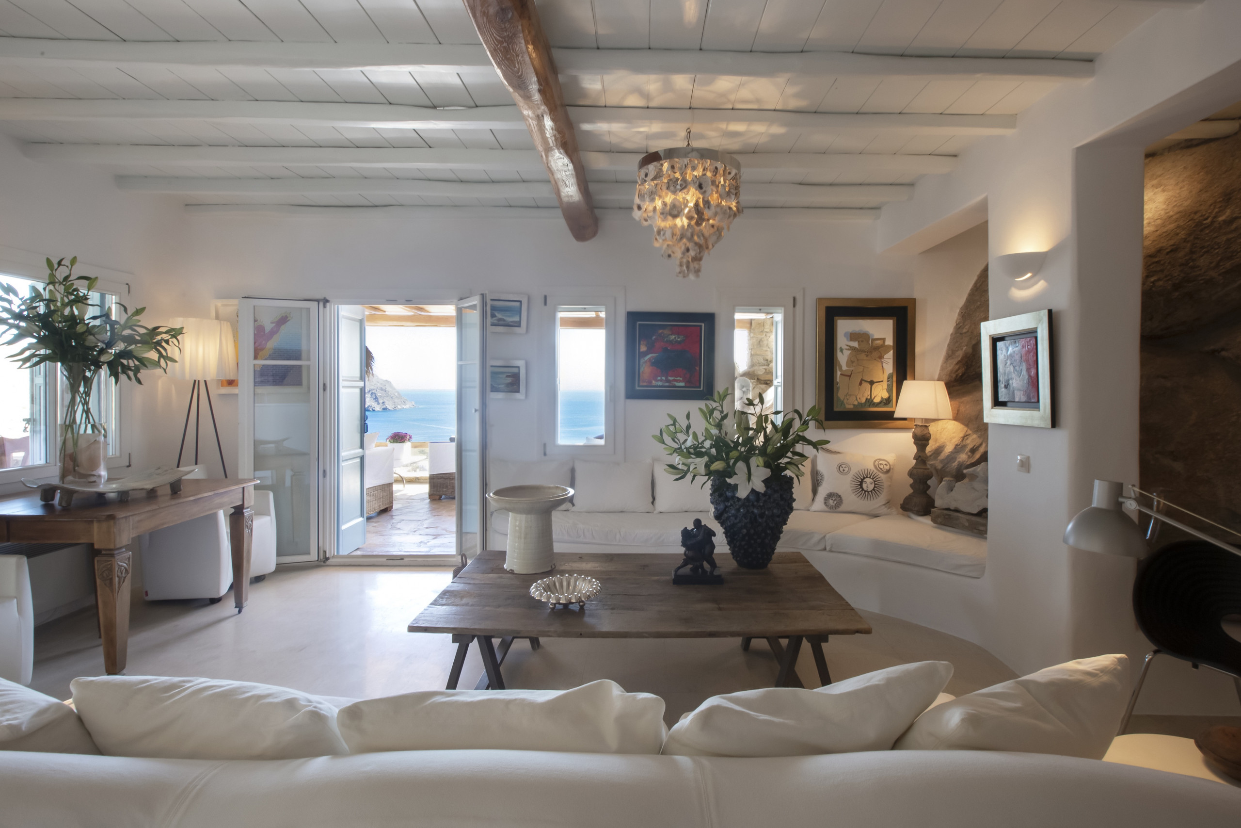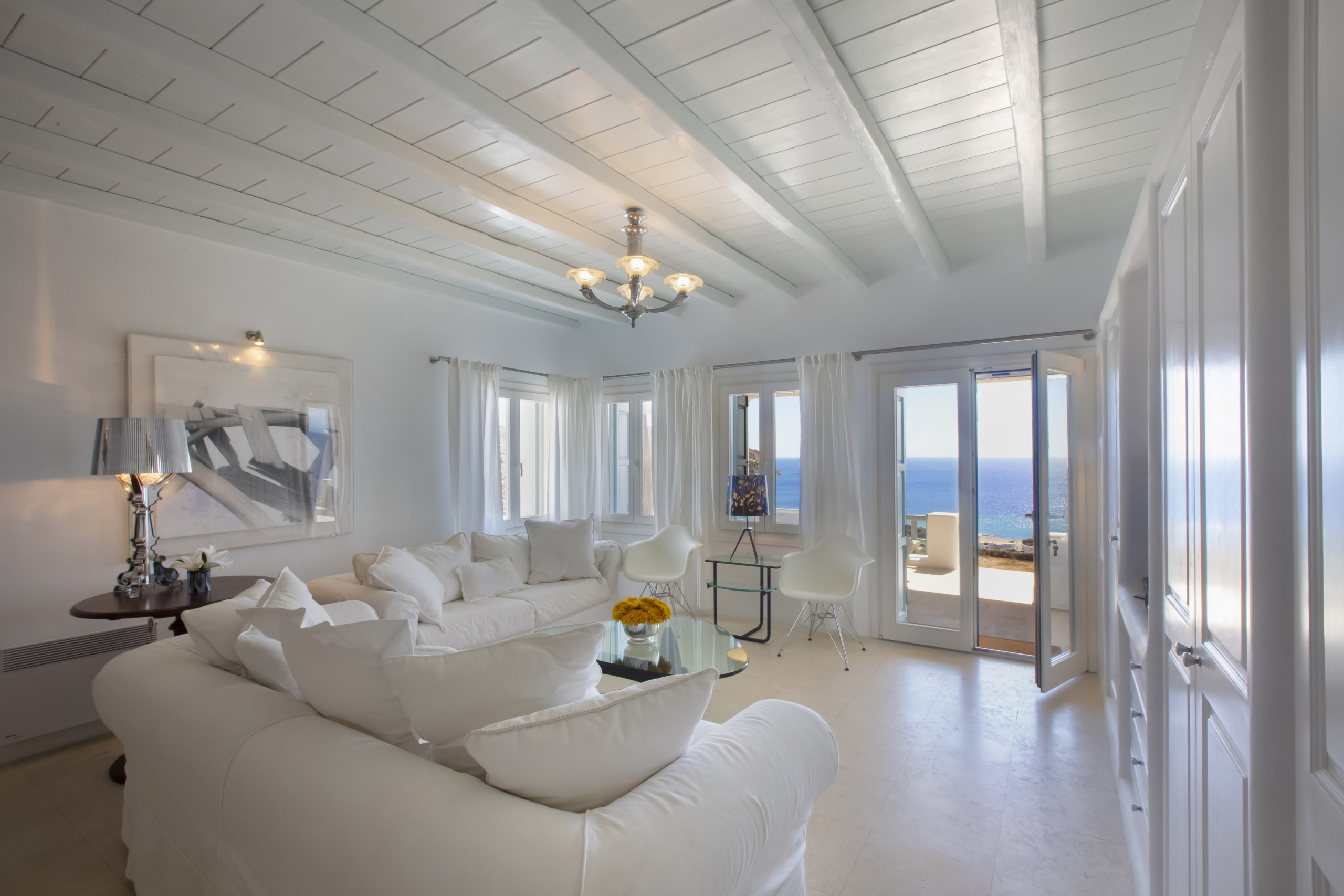 Villa Aerie’s indoor offering spans five levels, guaranteeing ample space and desired privacy for each of its residents. All are Aegean-white, elegant, opulent, and comfortable, with plenty of cozy nooks and corners in which to socialize or seclude yourself. All rooms and areas promote plenty of sunshine, allowing the Greek sun to look in as you look out onto the Aegean-blue waters.