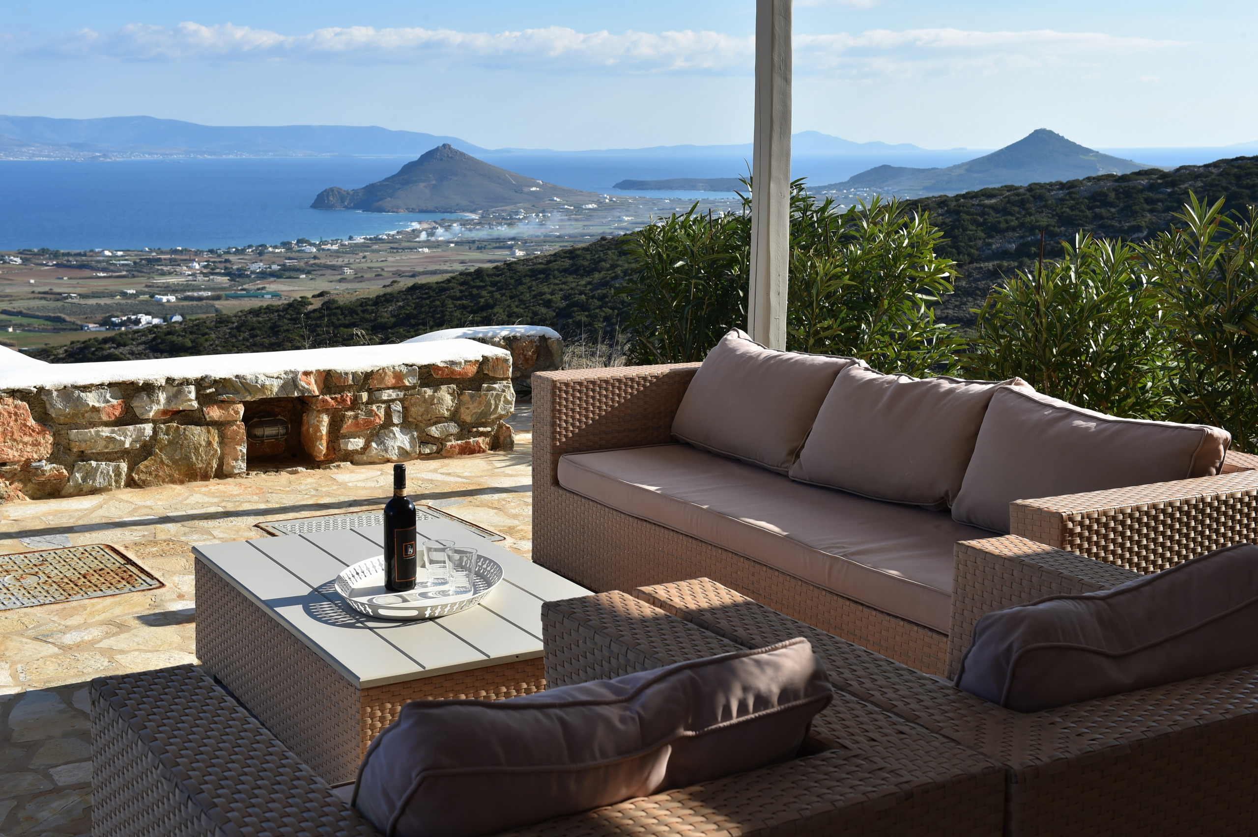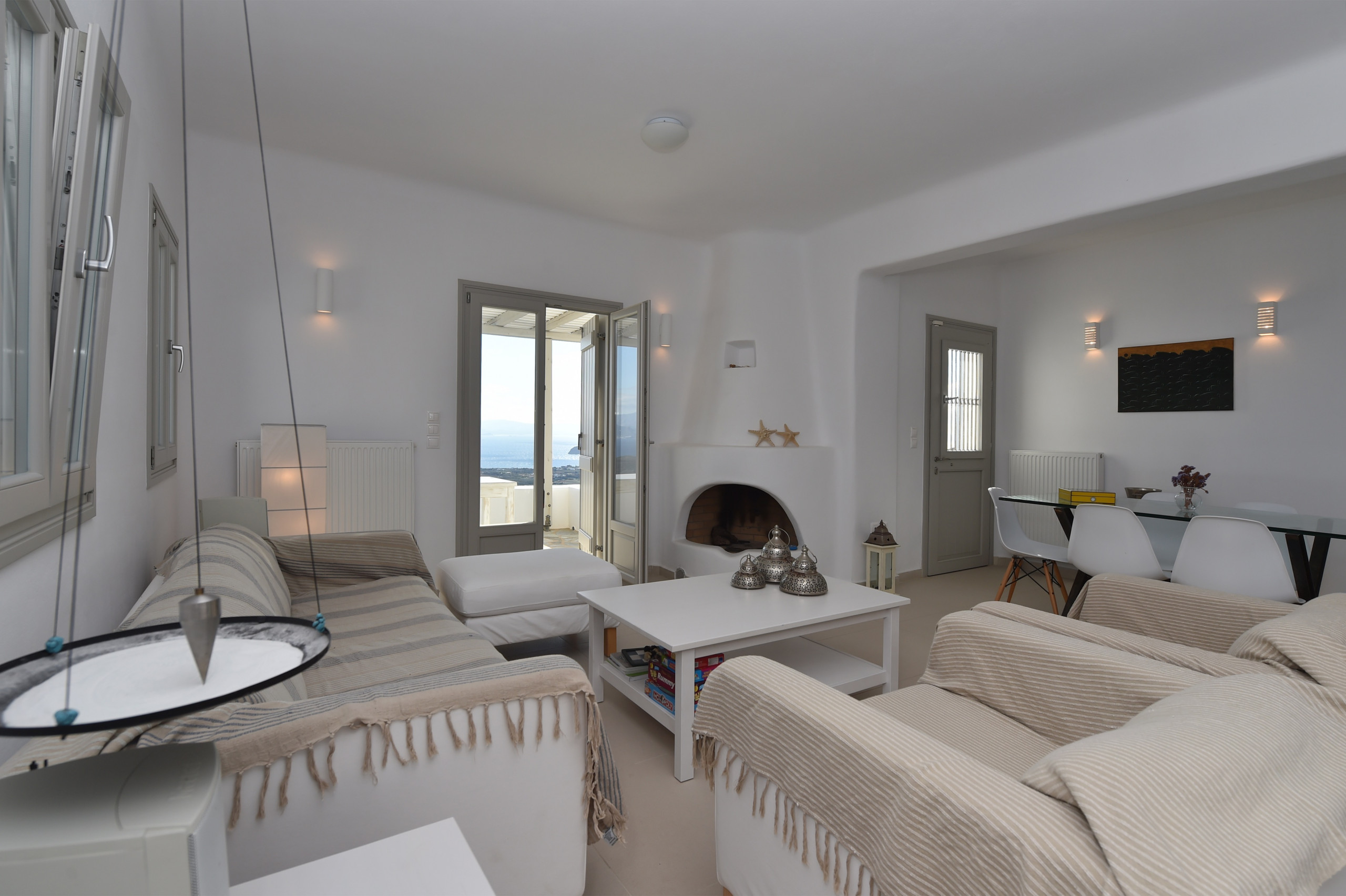 The open plan living, dining and kitchen area looks out onto the Paros landscape and the Aegean Sea. There are comfy sofas and a second reception area, along with a large dining table with designer chairs and a modern, fully equipped kitchen.
