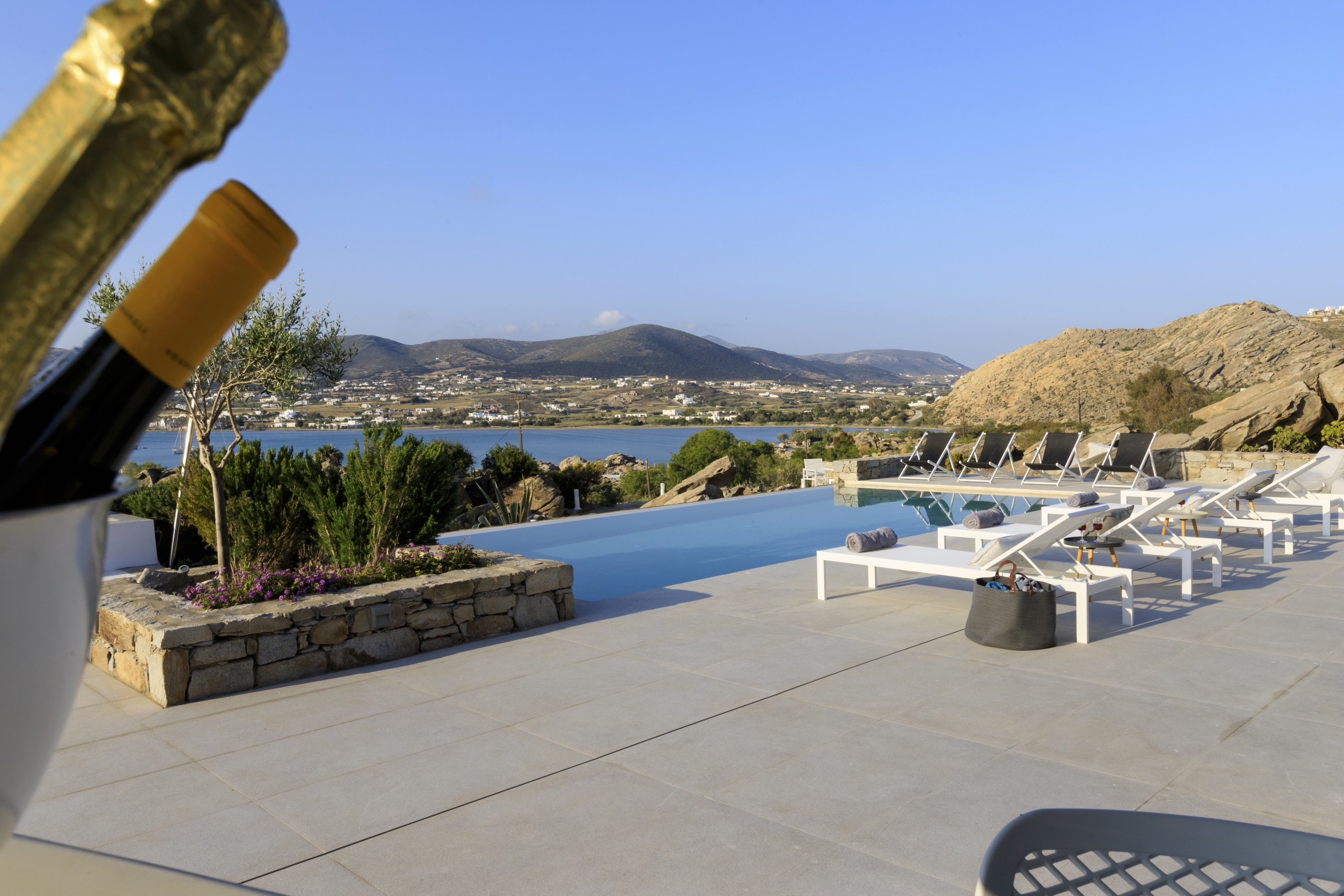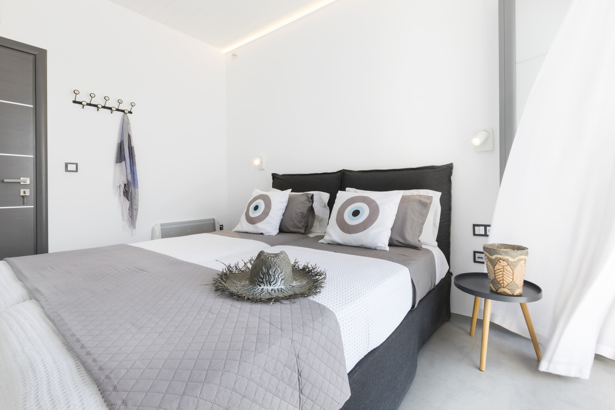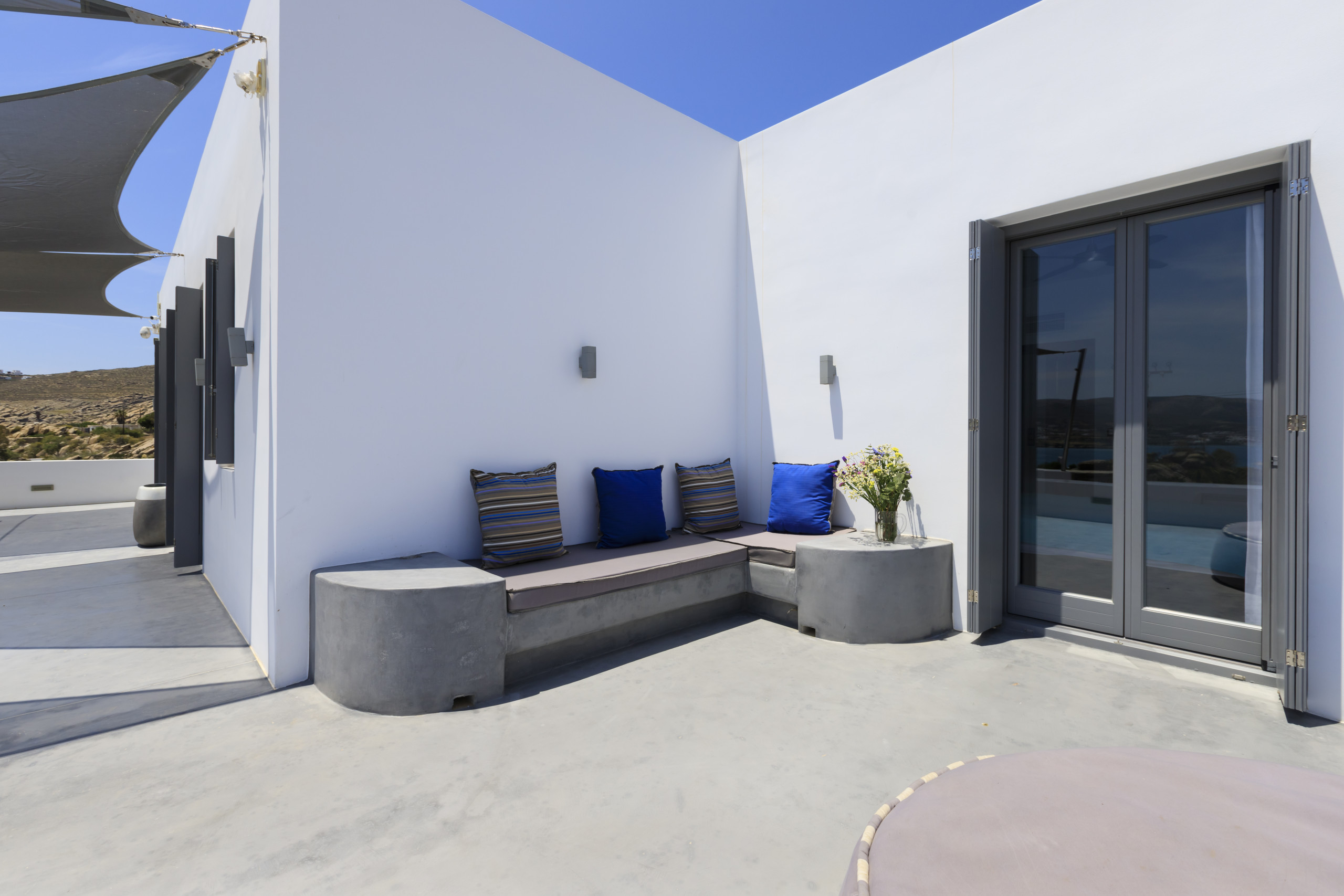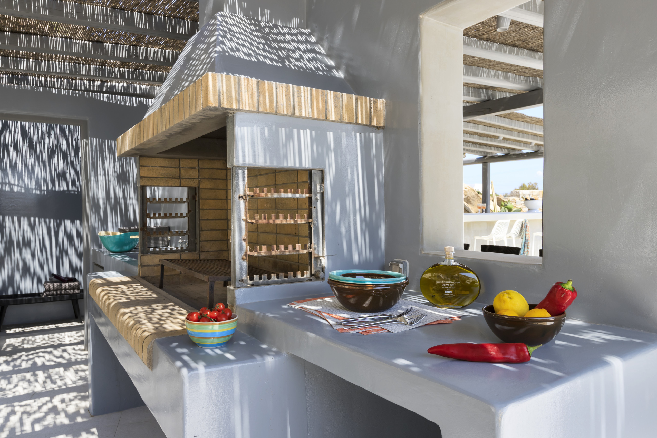 Outdoors, amenities like an infinity pool, a pool bar, shaded dining and lounge areas, and a BBQ enhance the quintessential Greek island experience.