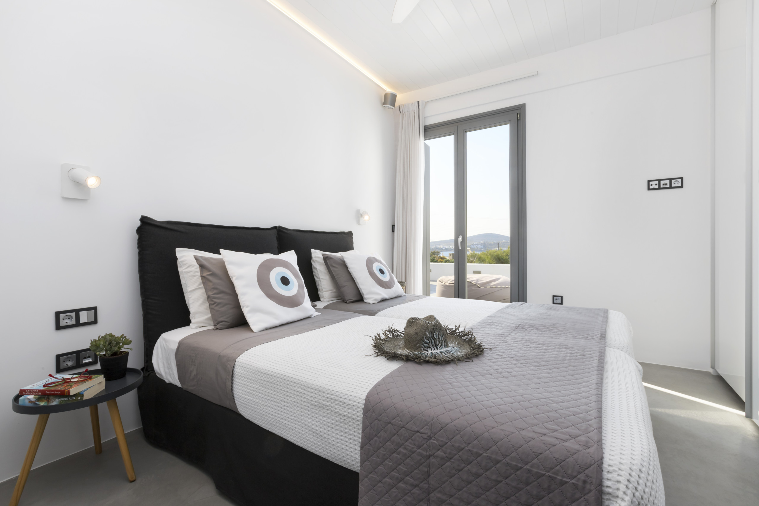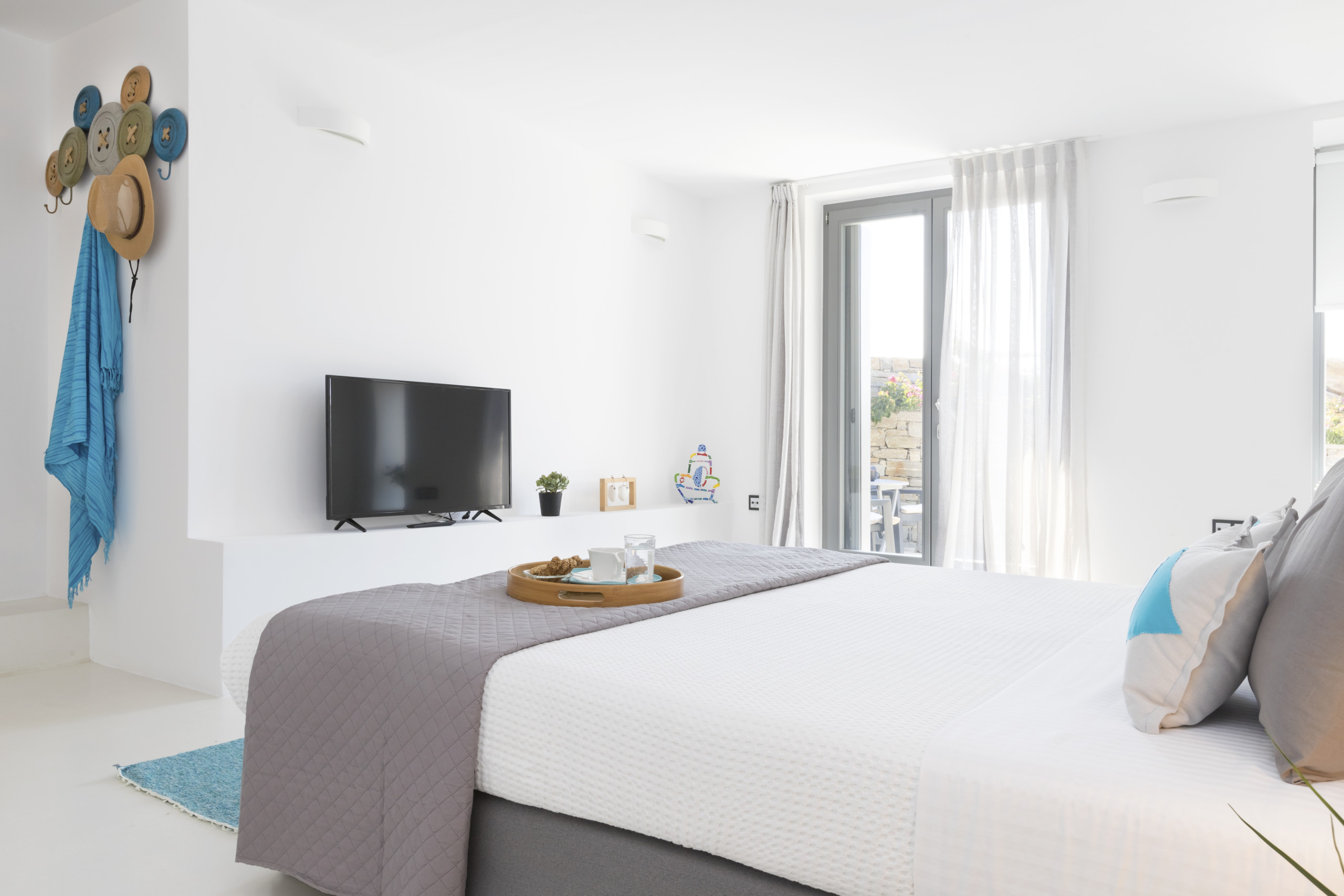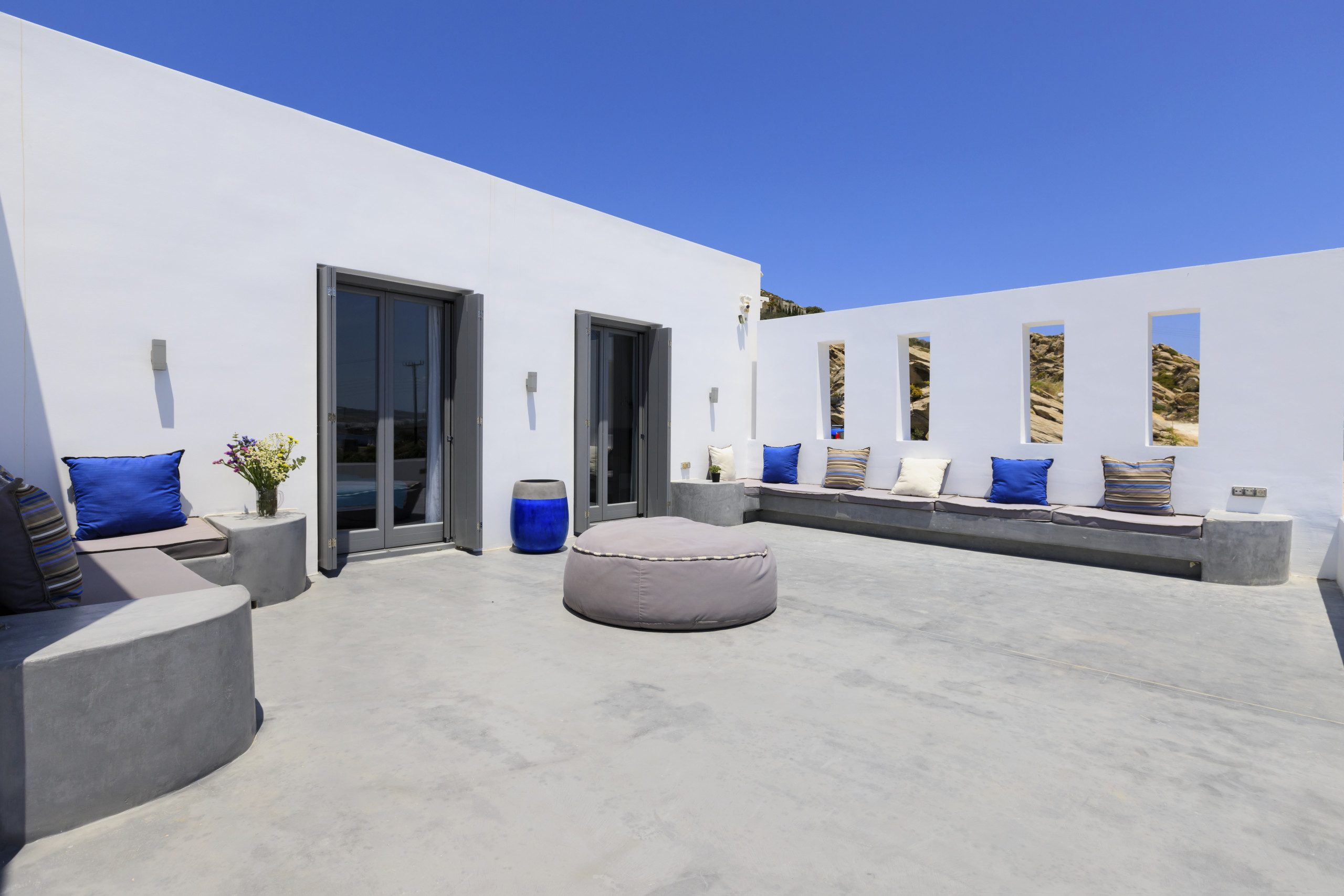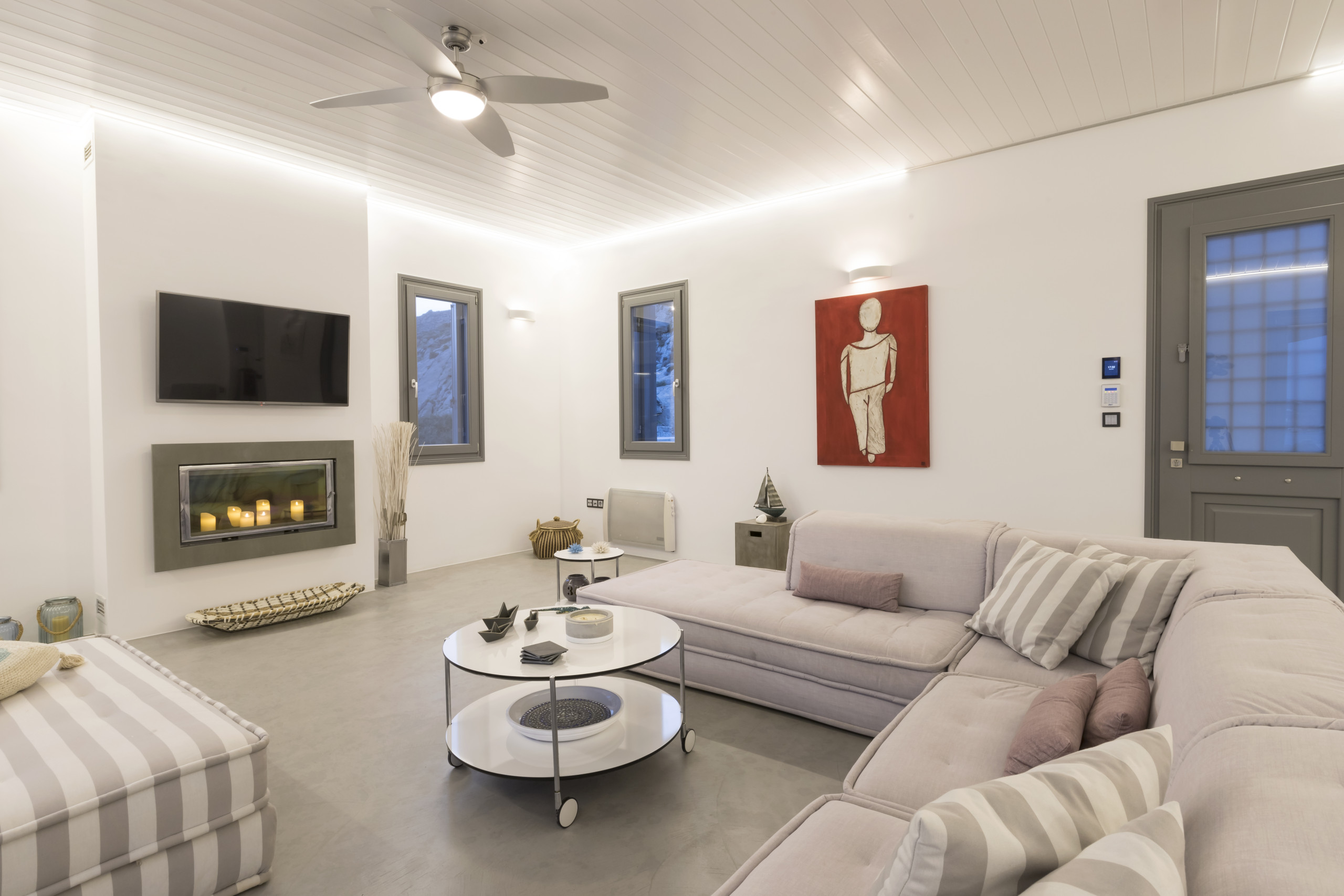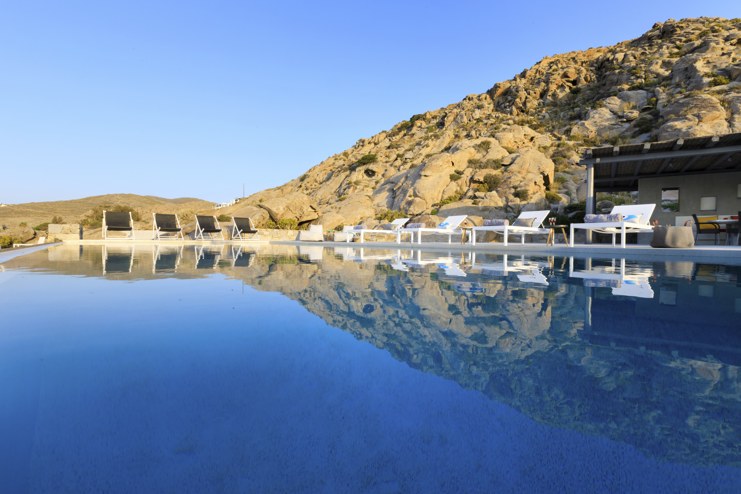 Outdoors, amenities like an infinity pool, a pool bar, shaded dining and lounge areas, and a BBQ enhance the quintessential Greek island experience.