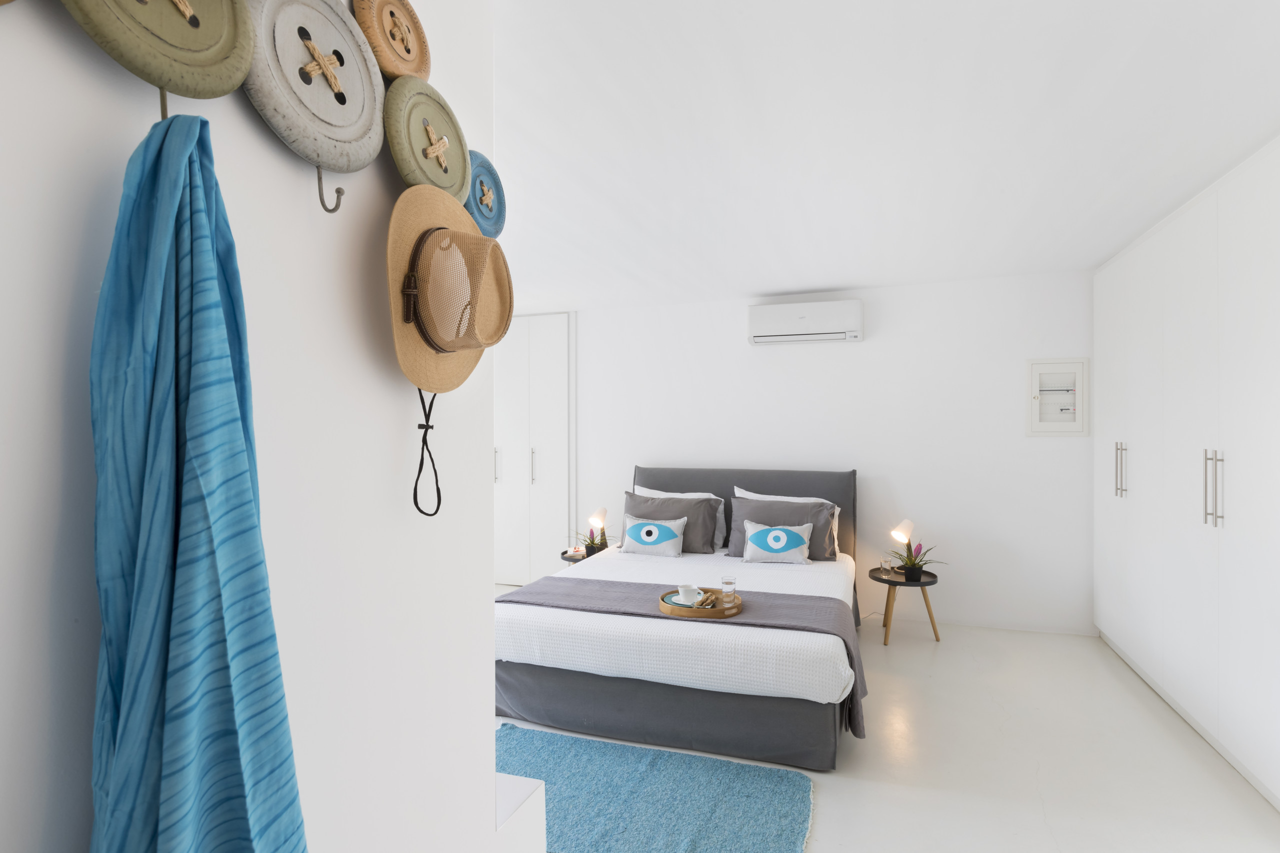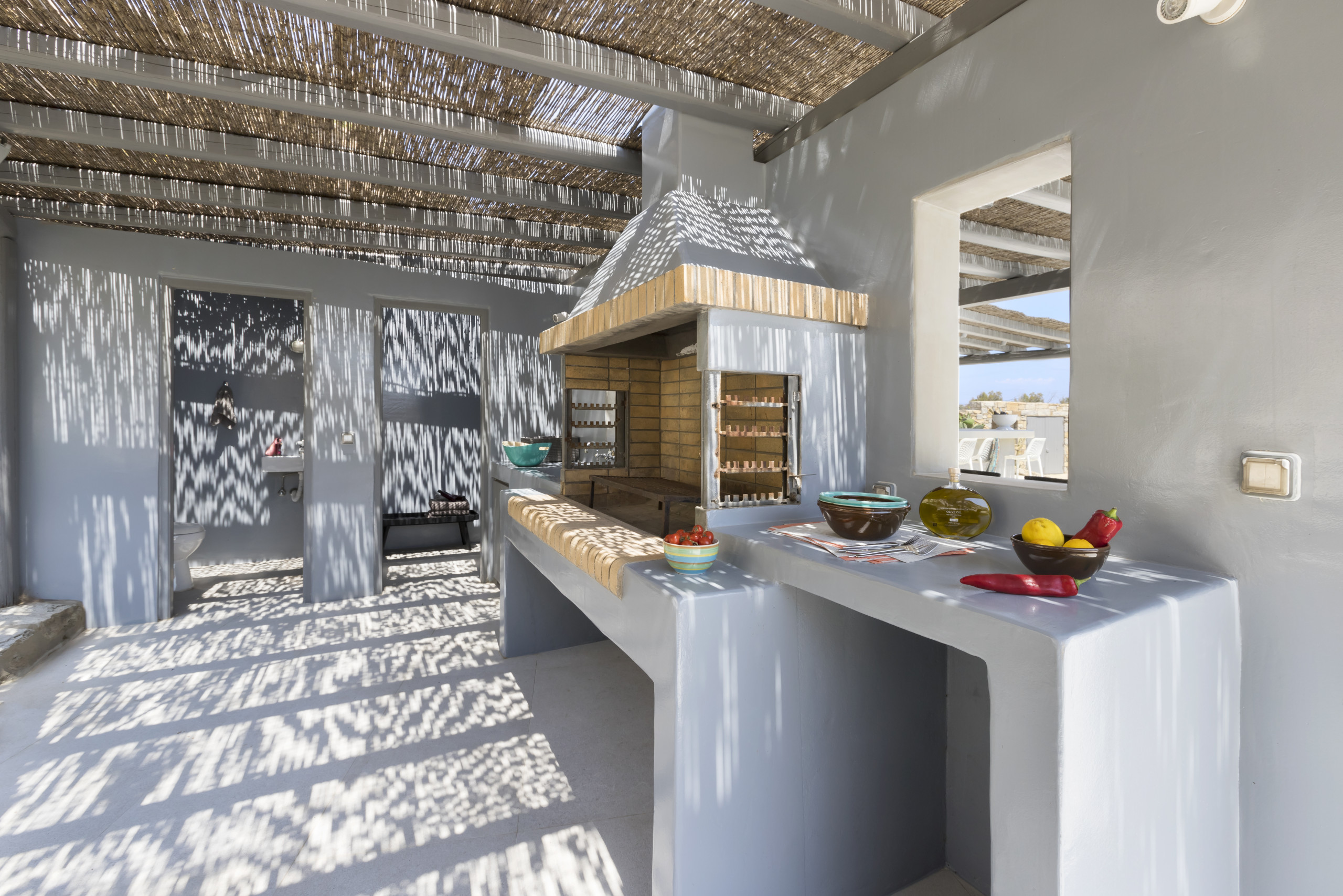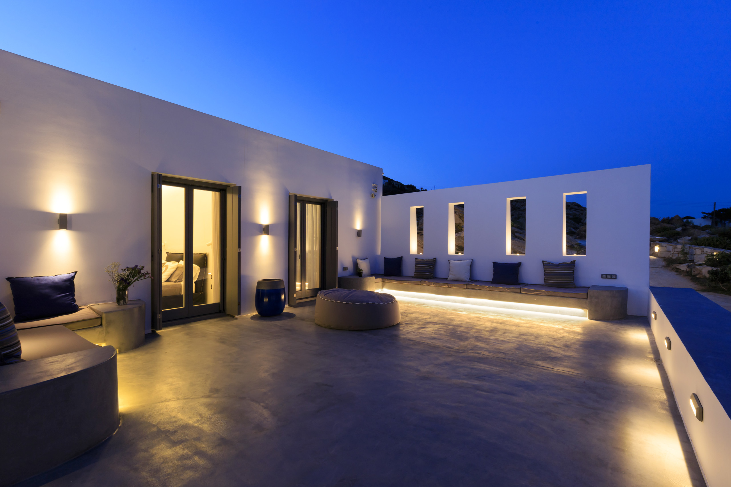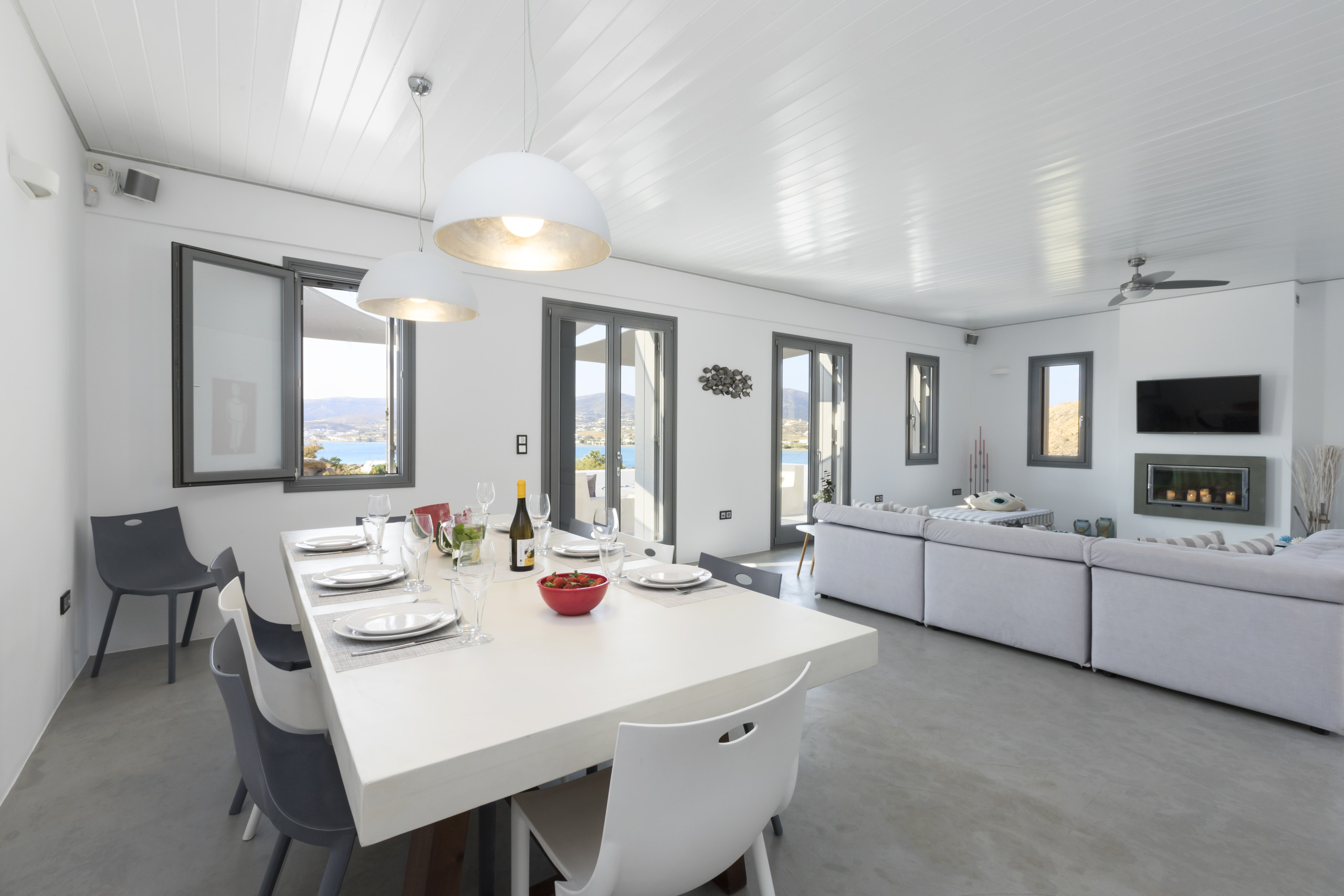 Outdoors, amenities like an infinity pool, a pool bar, shaded dining and lounge areas, and a BBQ enhance the quintessential Greek island experience.