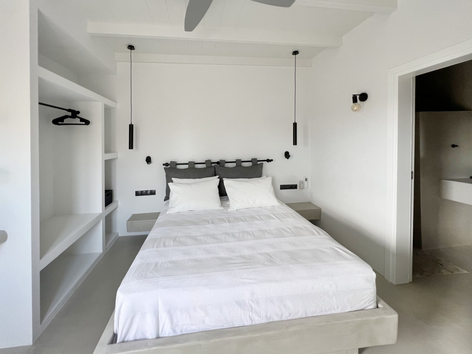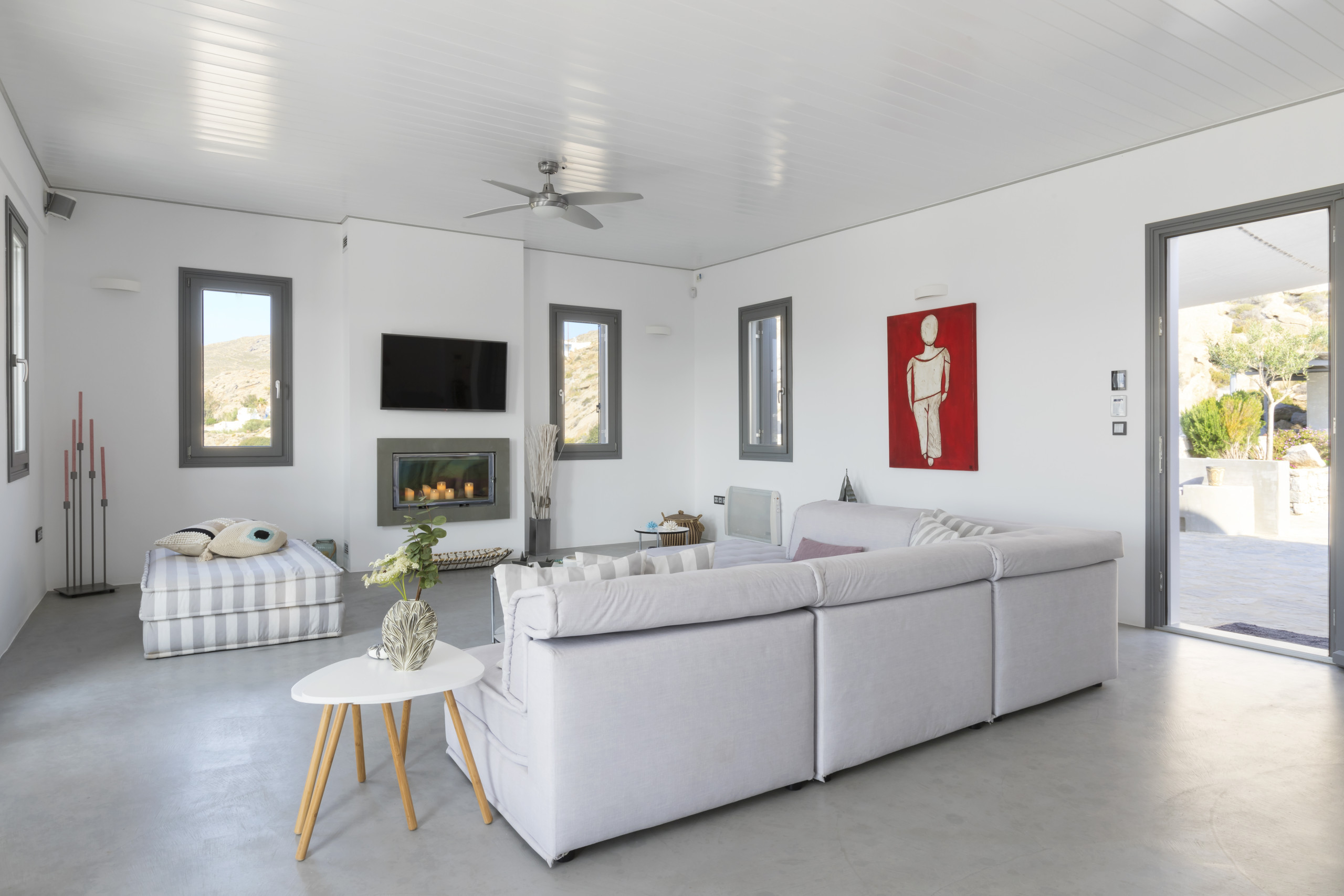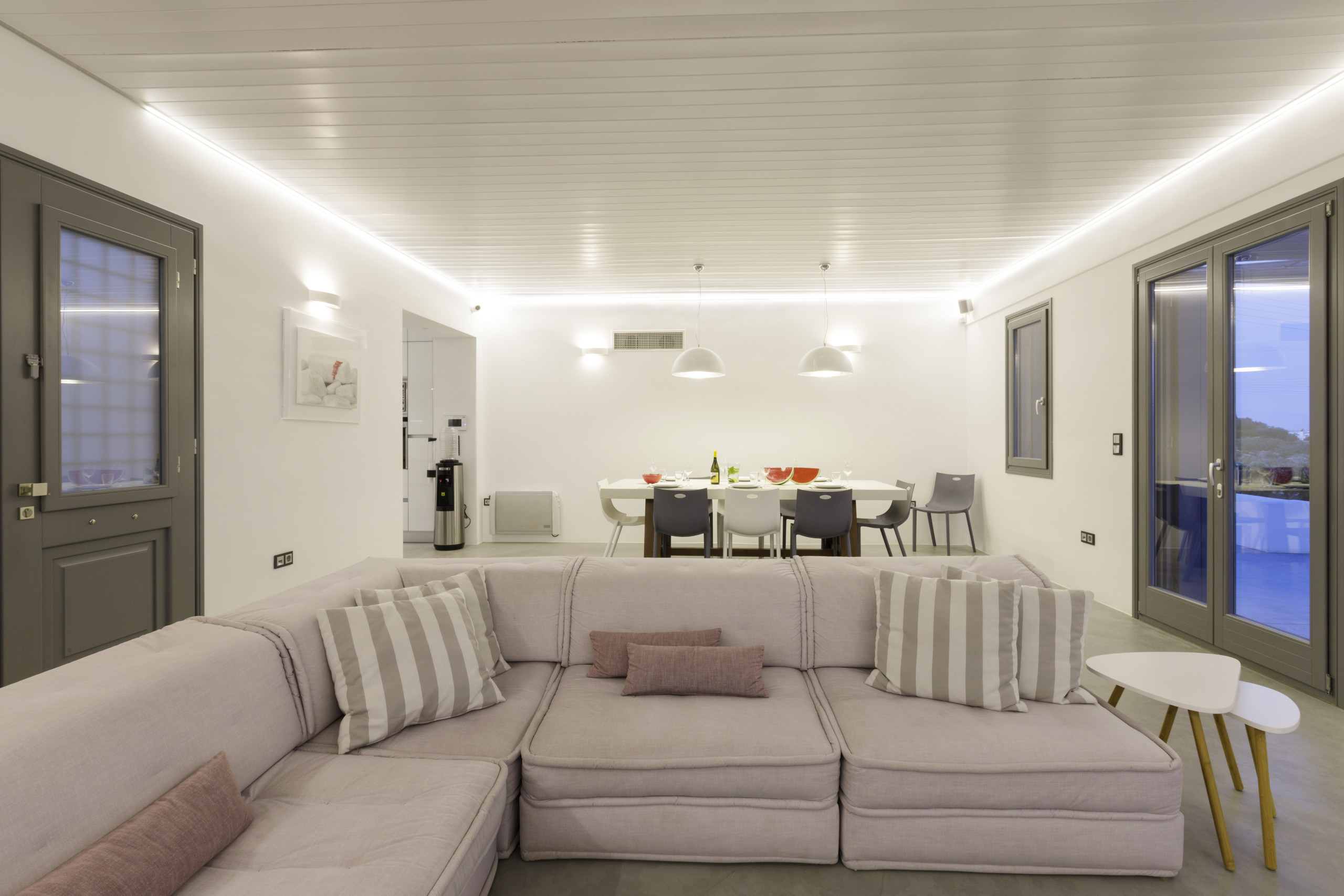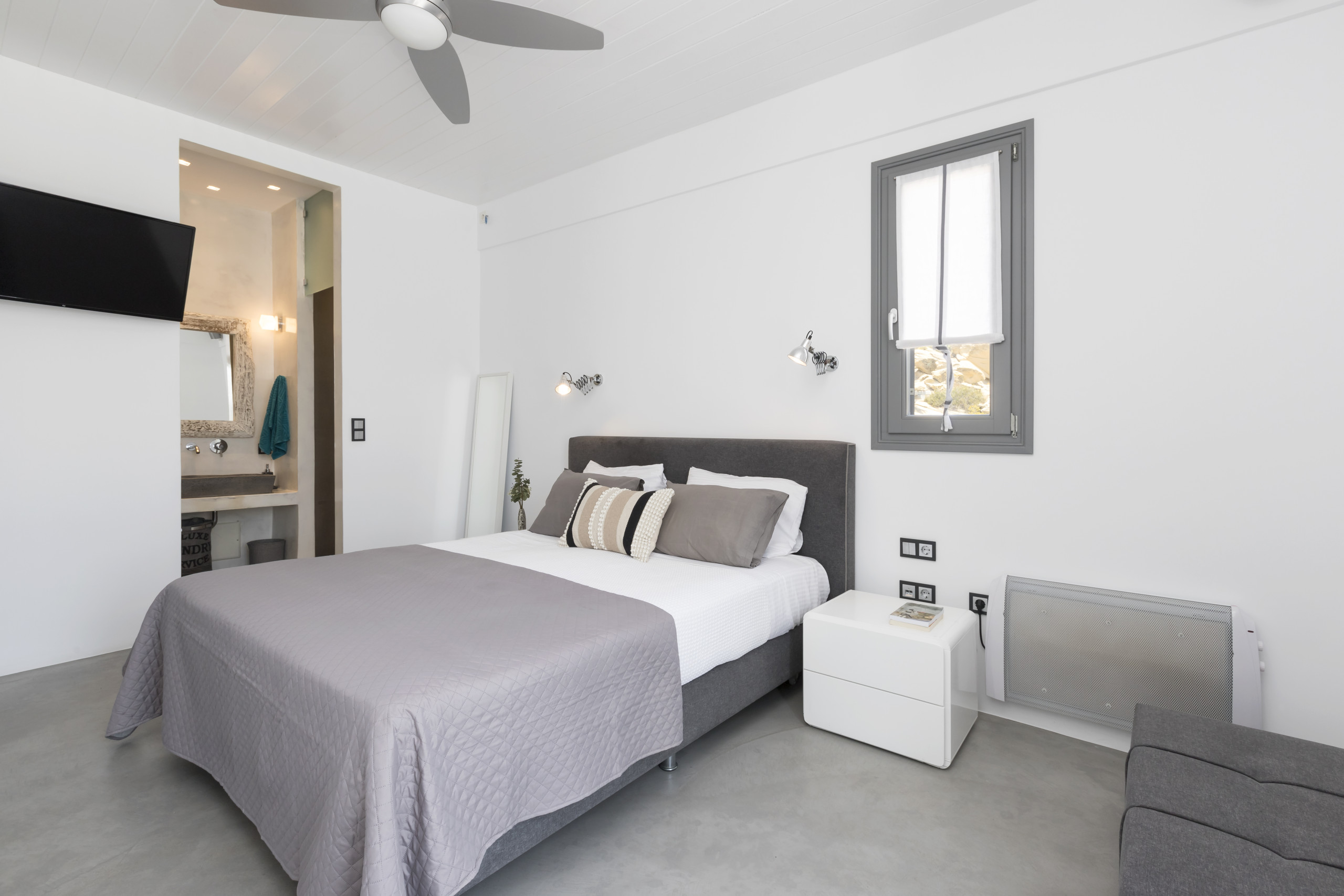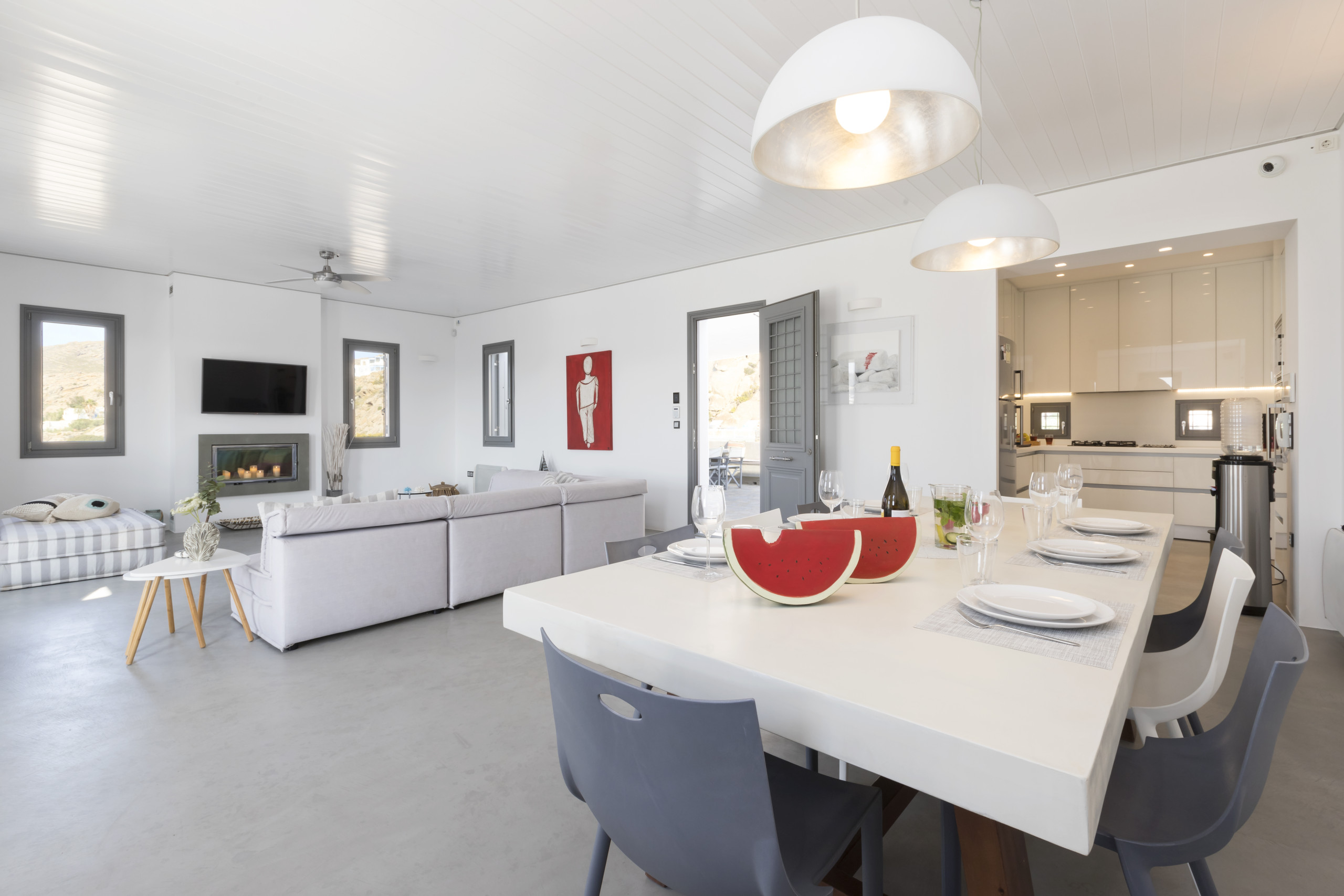 Outdoors, amenities like an infinity pool, a pool bar, shaded dining and lounge areas, and a BBQ enhance the quintessential Greek island experience.