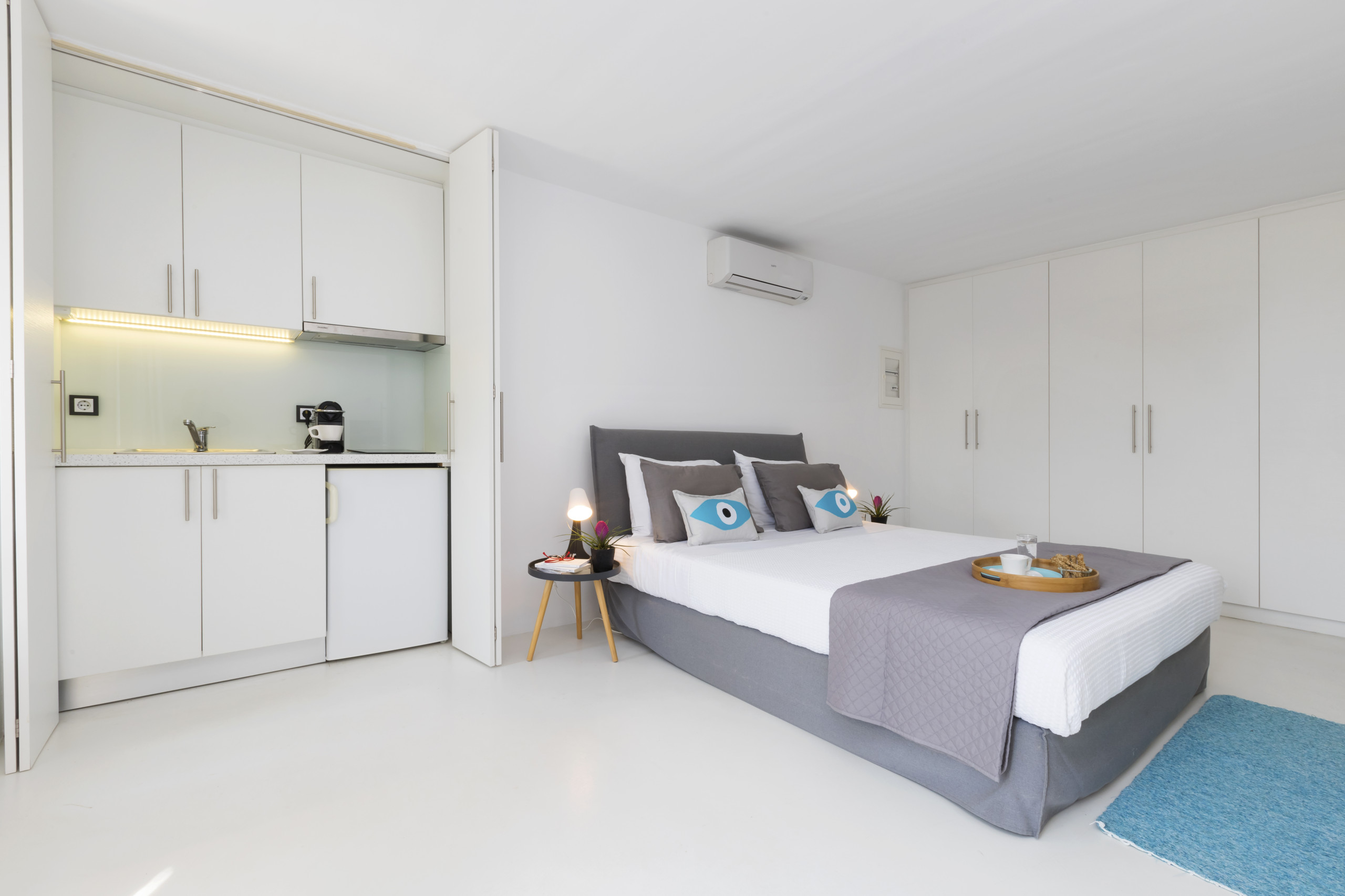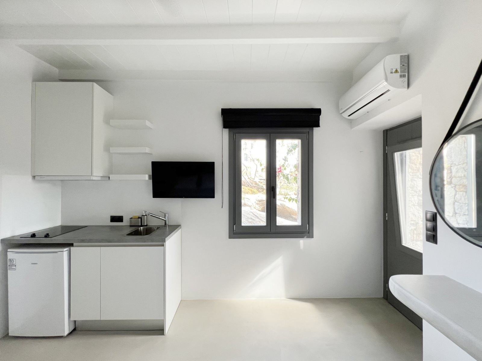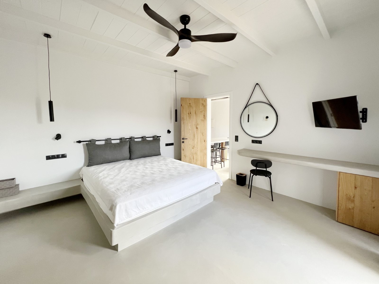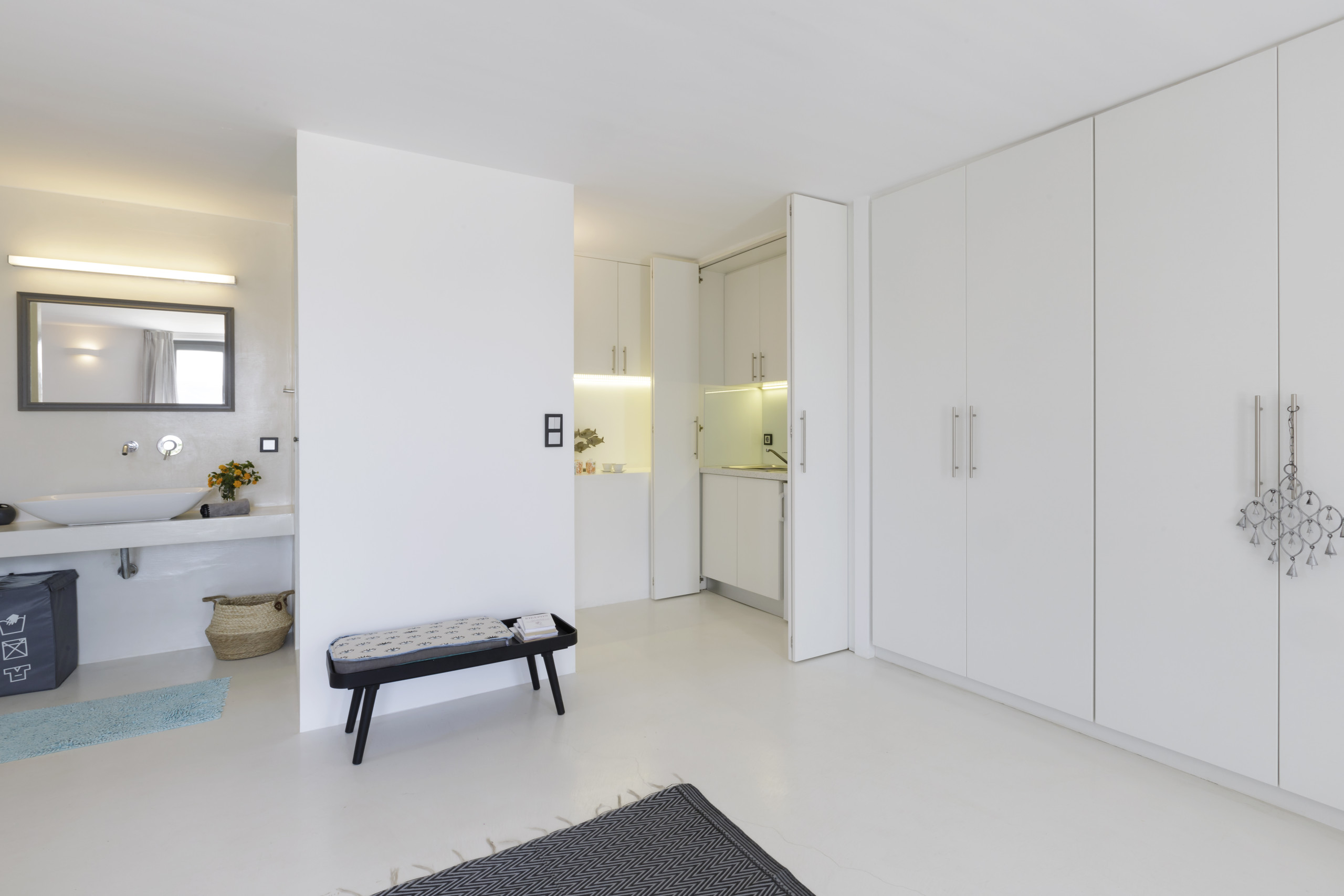 Outdoors, amenities like an infinity pool, a pool bar, shaded dining and lounge areas, and a BBQ enhance the quintessential Greek island experience.
