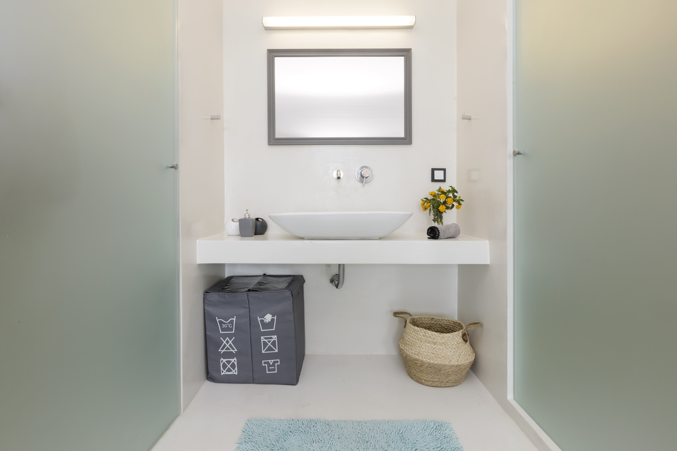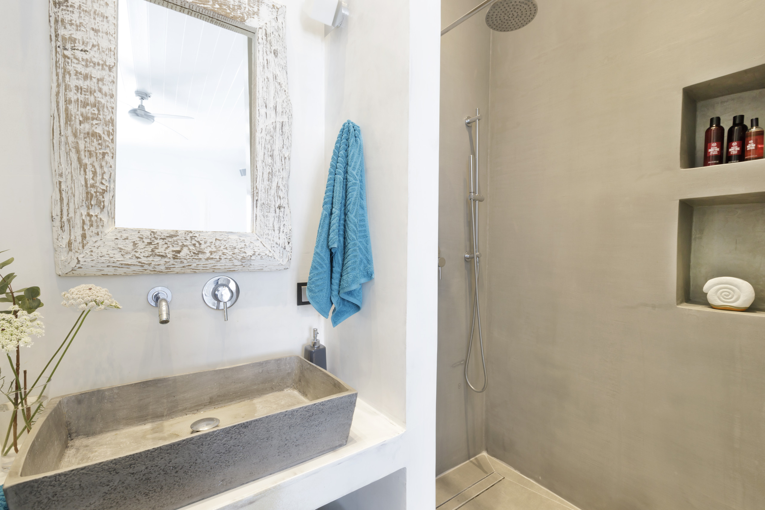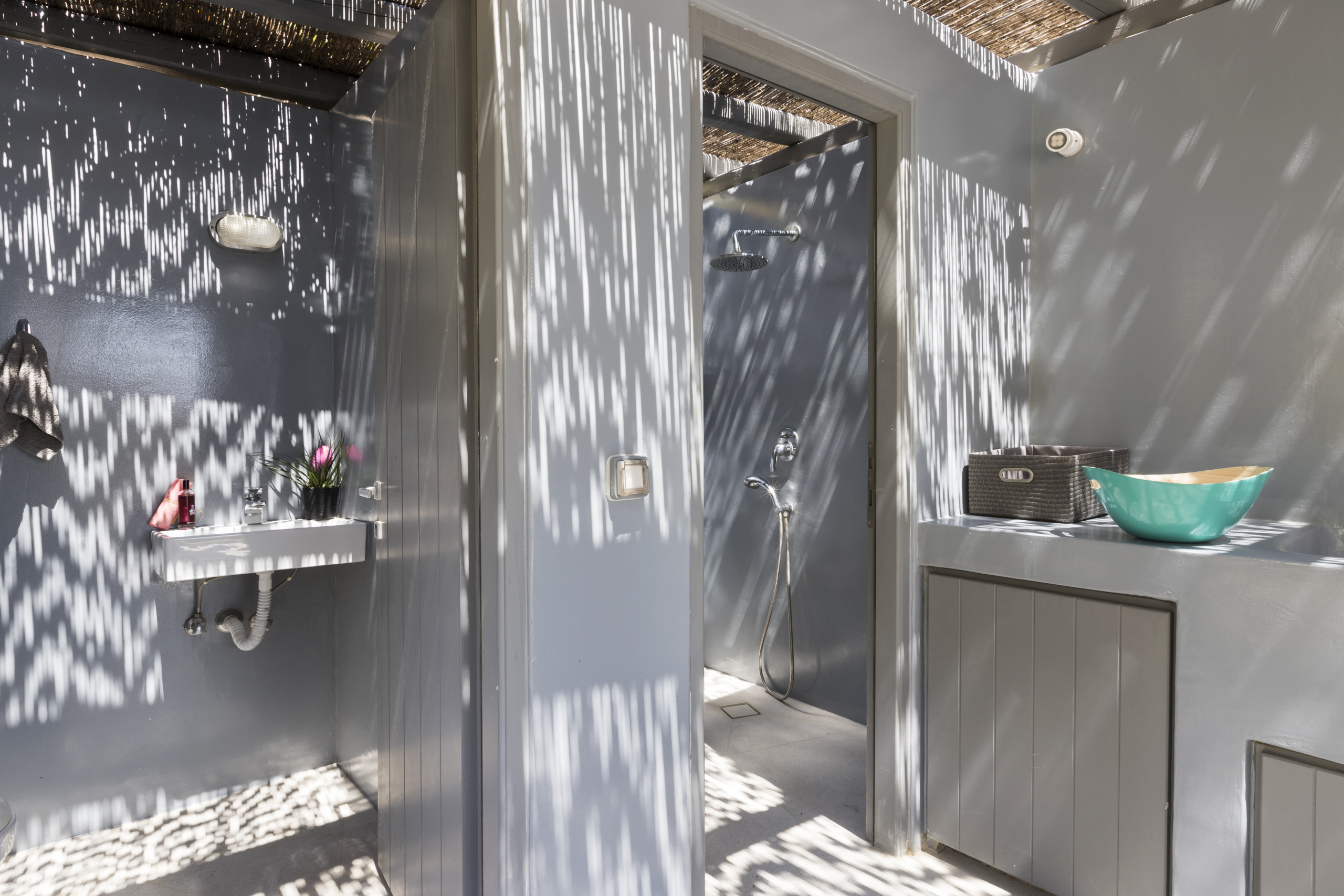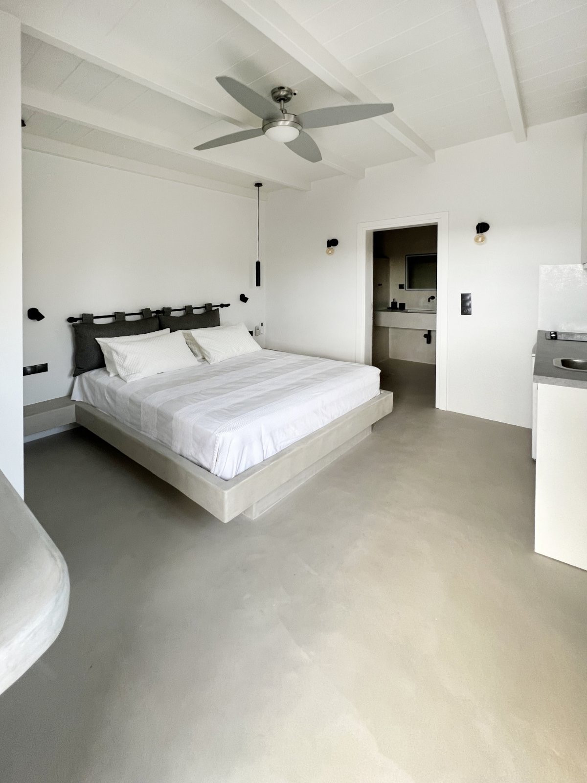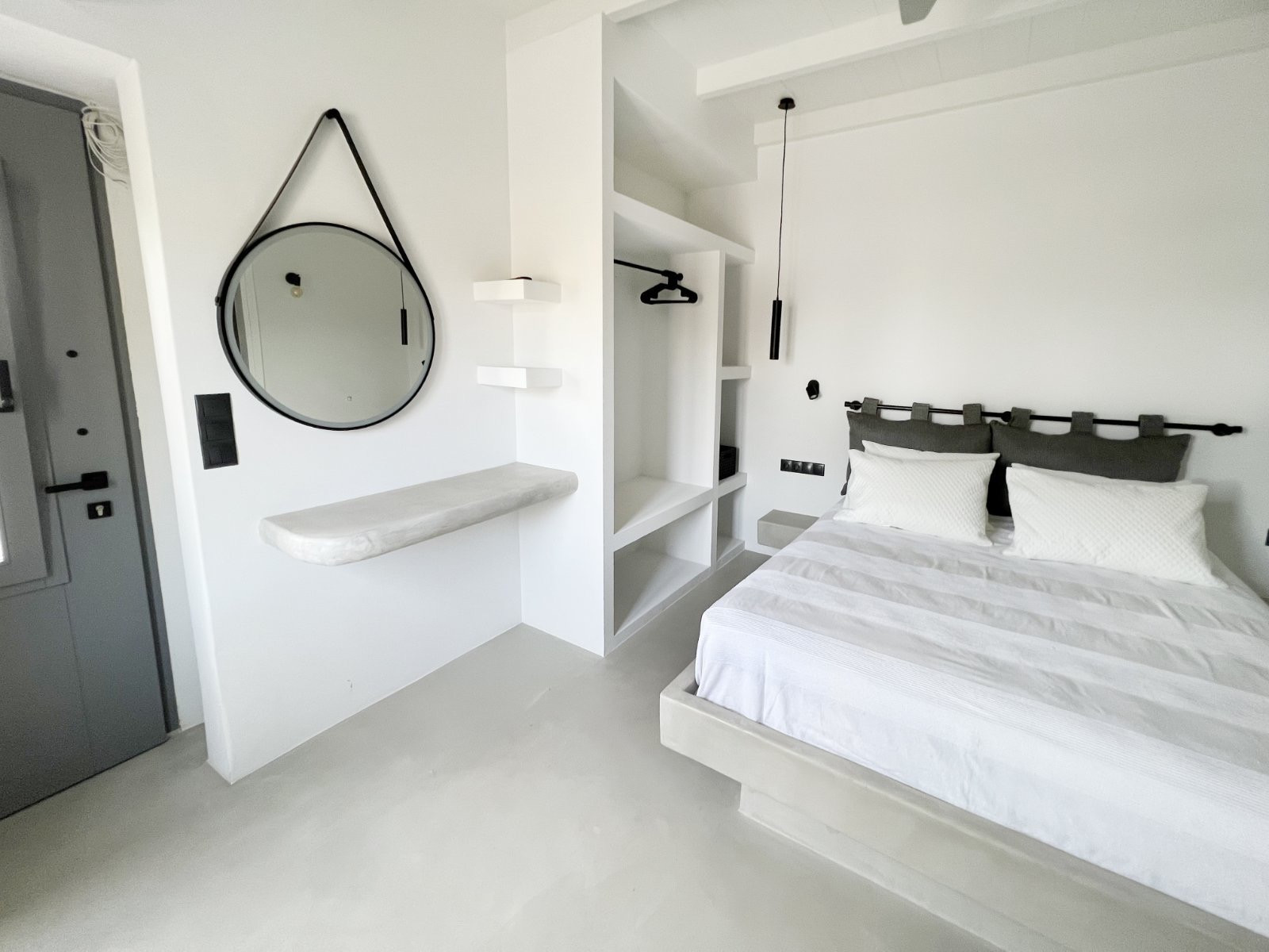 Outdoors, amenities like an infinity pool, a pool bar, shaded dining and lounge areas, and a BBQ enhance the quintessential Greek island experience.