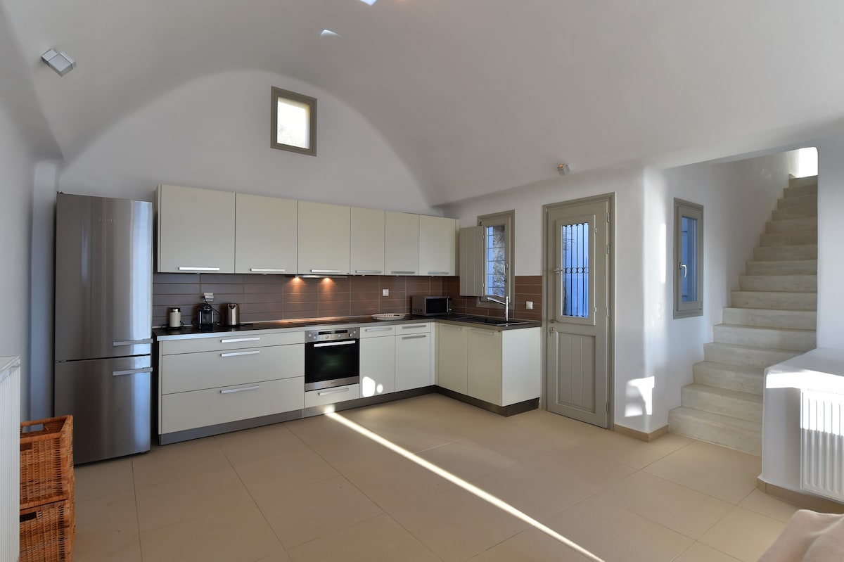 All villas offer open plan living, dining, and kitchen areas with stunning views of the the Paros landscape and the Aegean Sea.