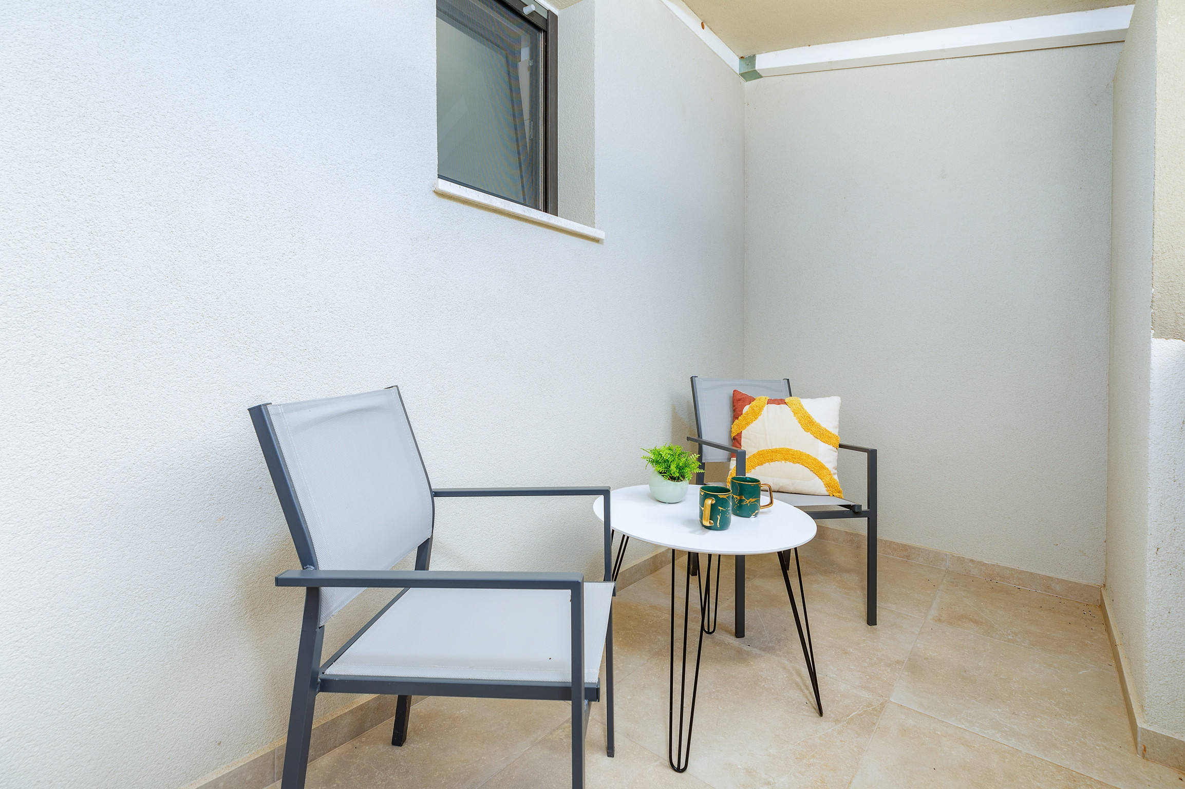 Surrounded by a beautiful garden and featuring a terrace and balcony, this property offers ample opportunities to enjoy the outdoors. The location is ideal for families, with a sandy beach just a short distance away and a supermarket within a 300-meter radius. Nearby, you'll find a rock beach, a bus stop, and a selection of restaurants, all within easy reach.