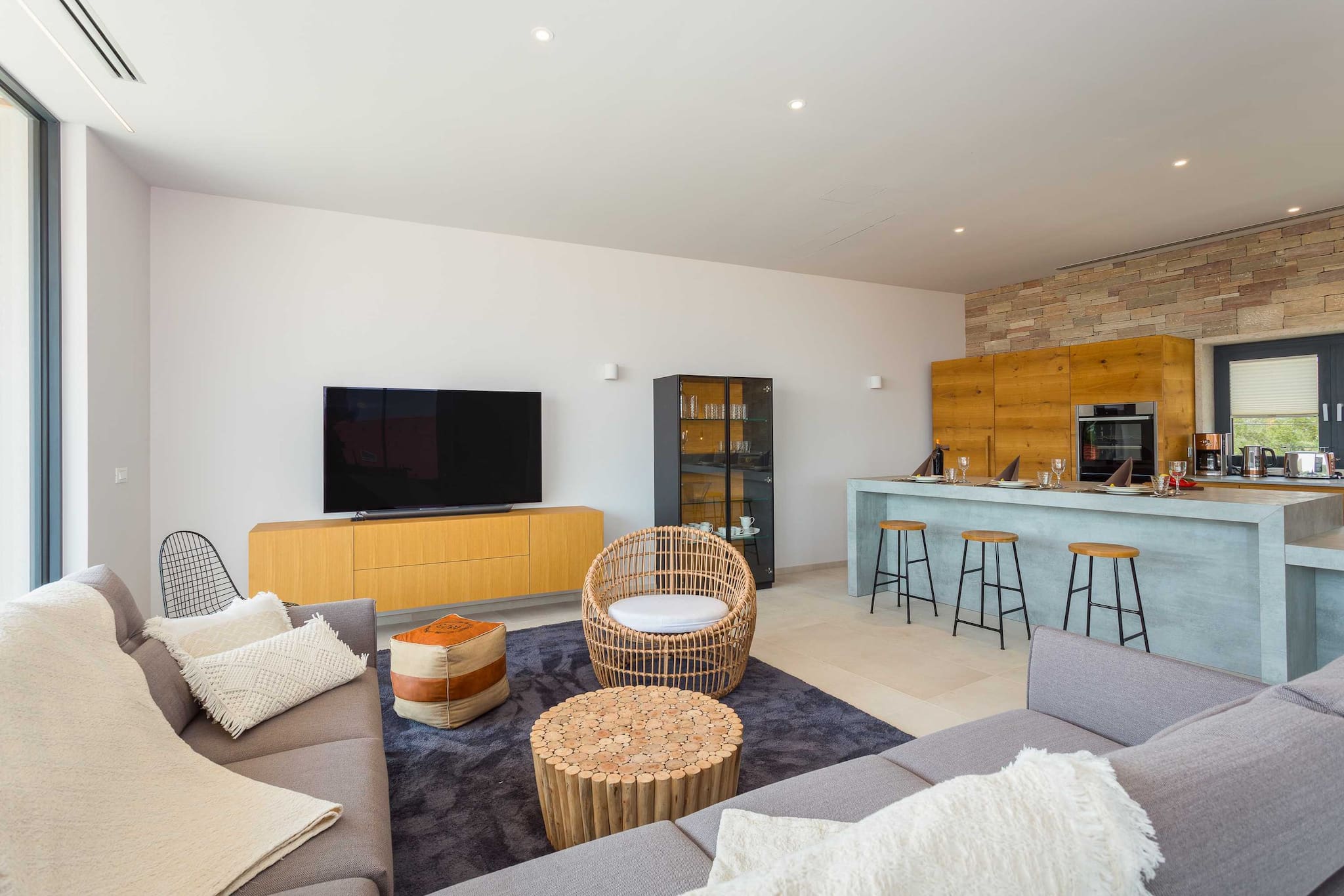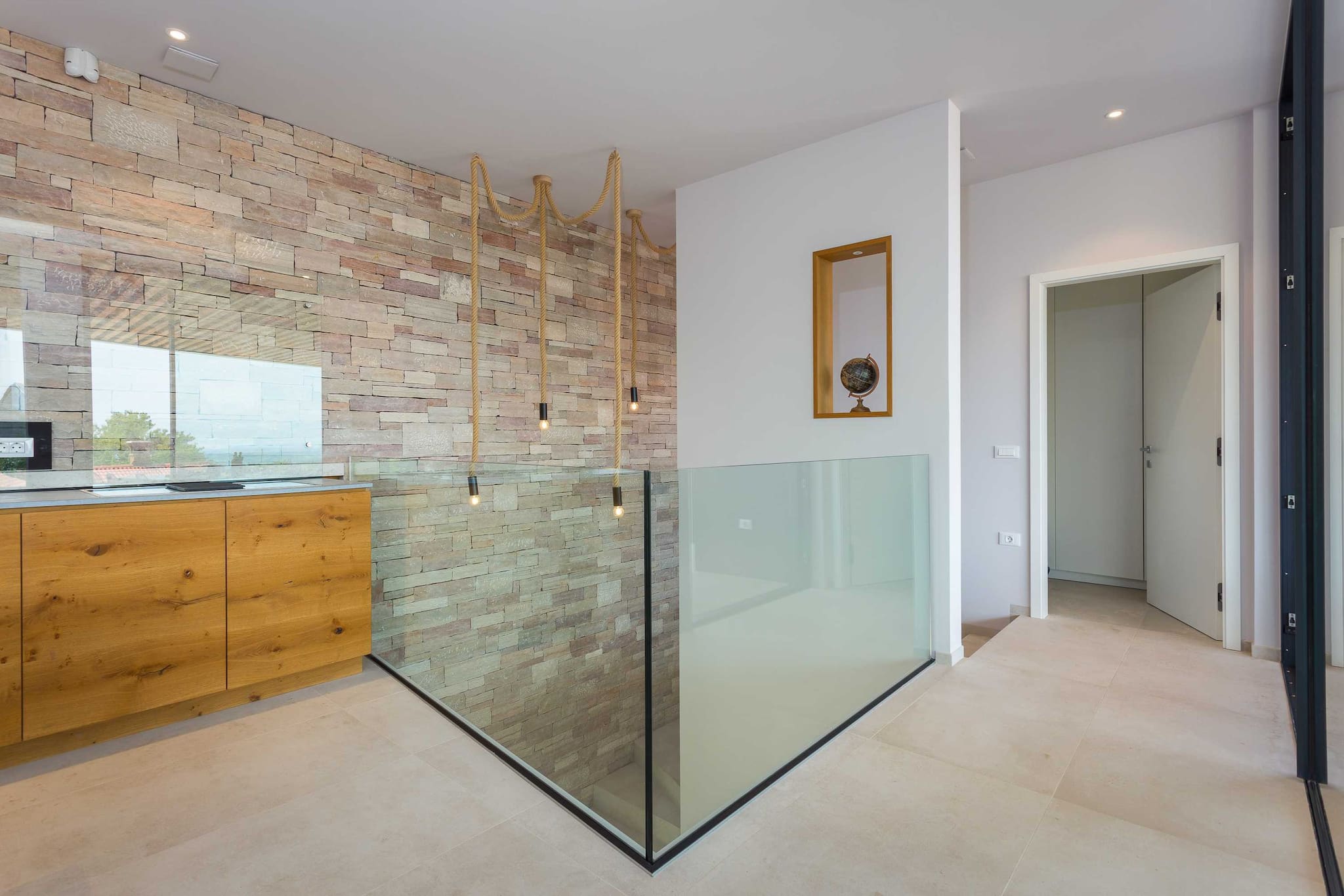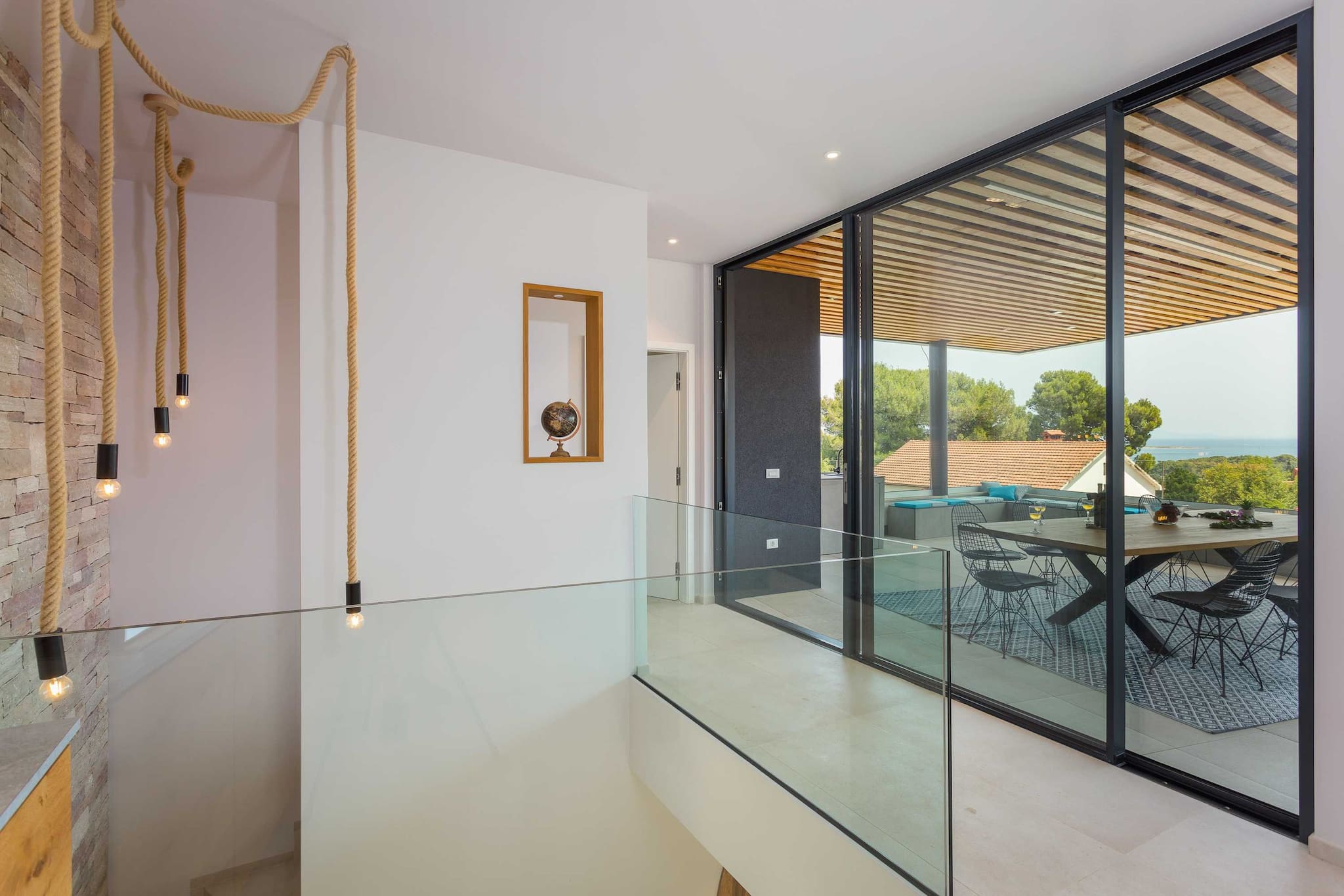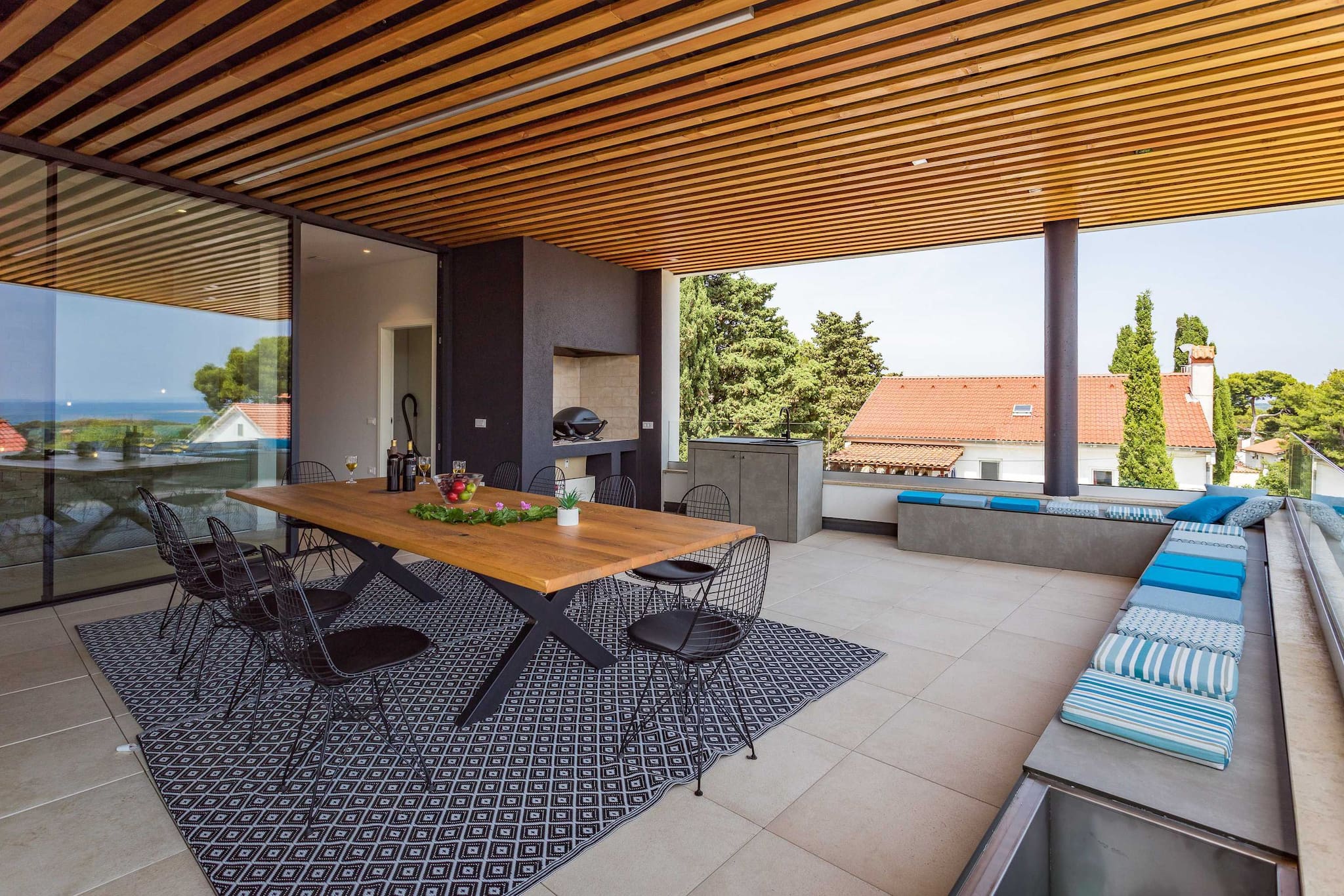 Beautifully designed staircase leads to a living room with sea view and lounge area, big kitchen with dining area and a big terrace with outdoor dining area and outstanding view. Guests can use BBQ facilities and dine enjoying the sea breeze.