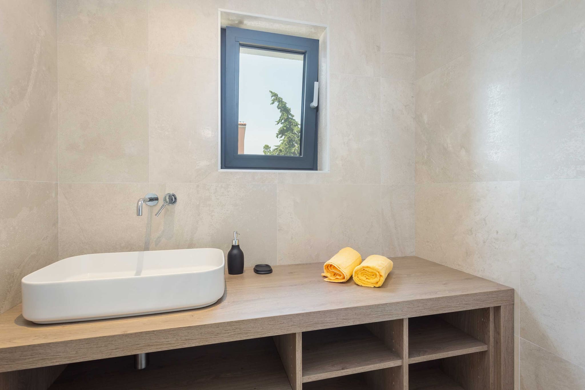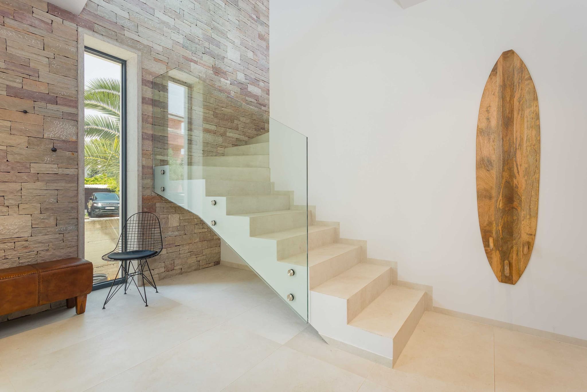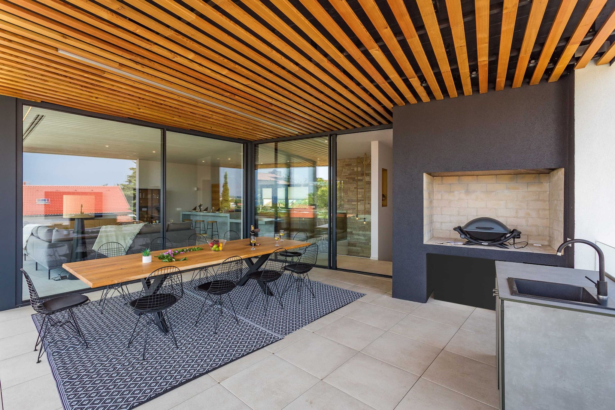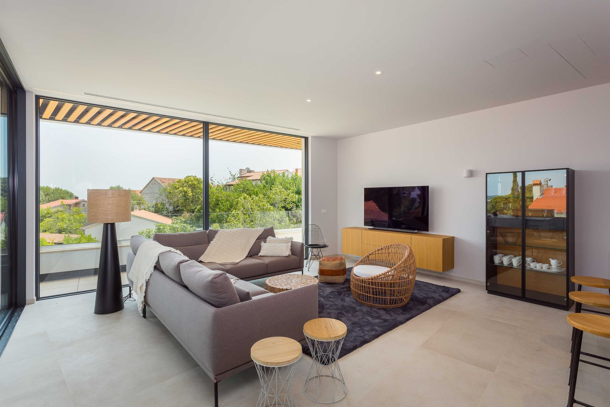 Beautifully designed staircase leads to a living room with sea view and lounge area, big kitchen with dining area and a big terrace with outdoor dining area and outstanding view. Guests can use BBQ facilities and dine enjoying the sea breeze.