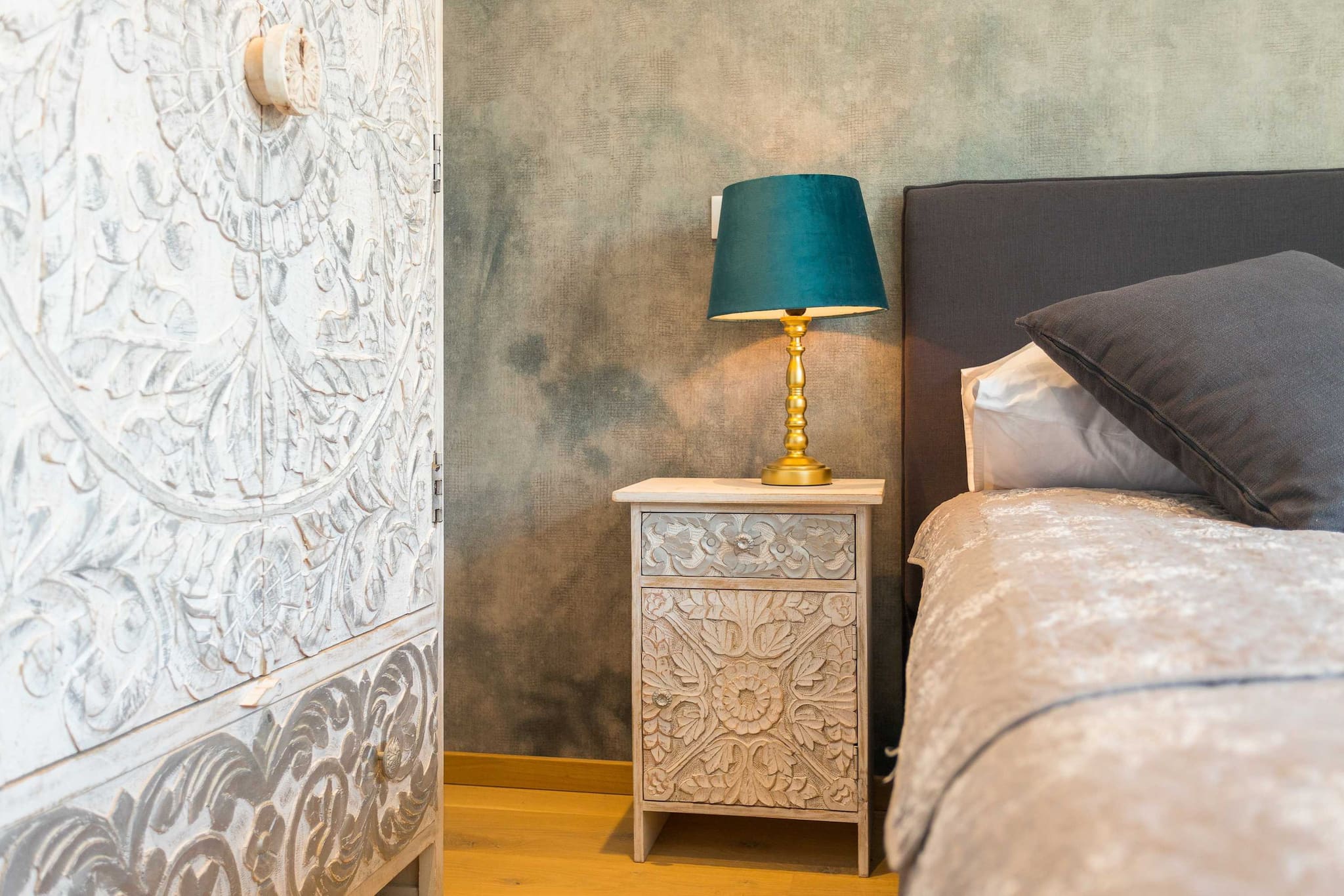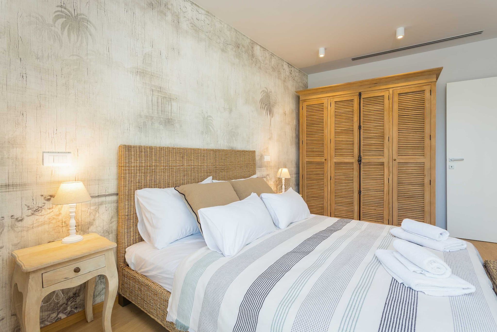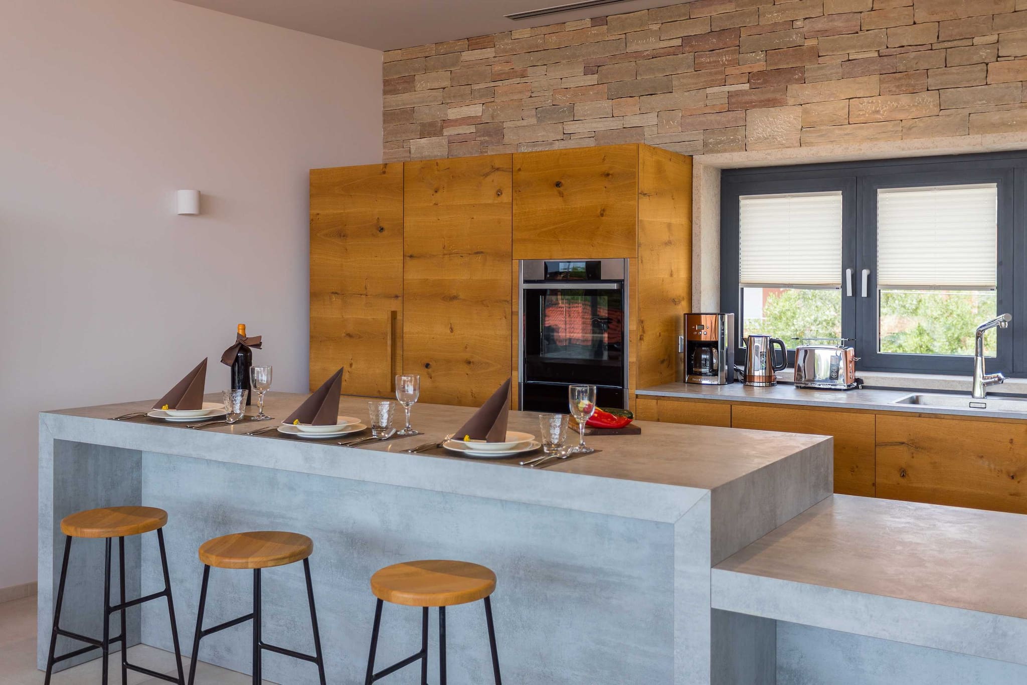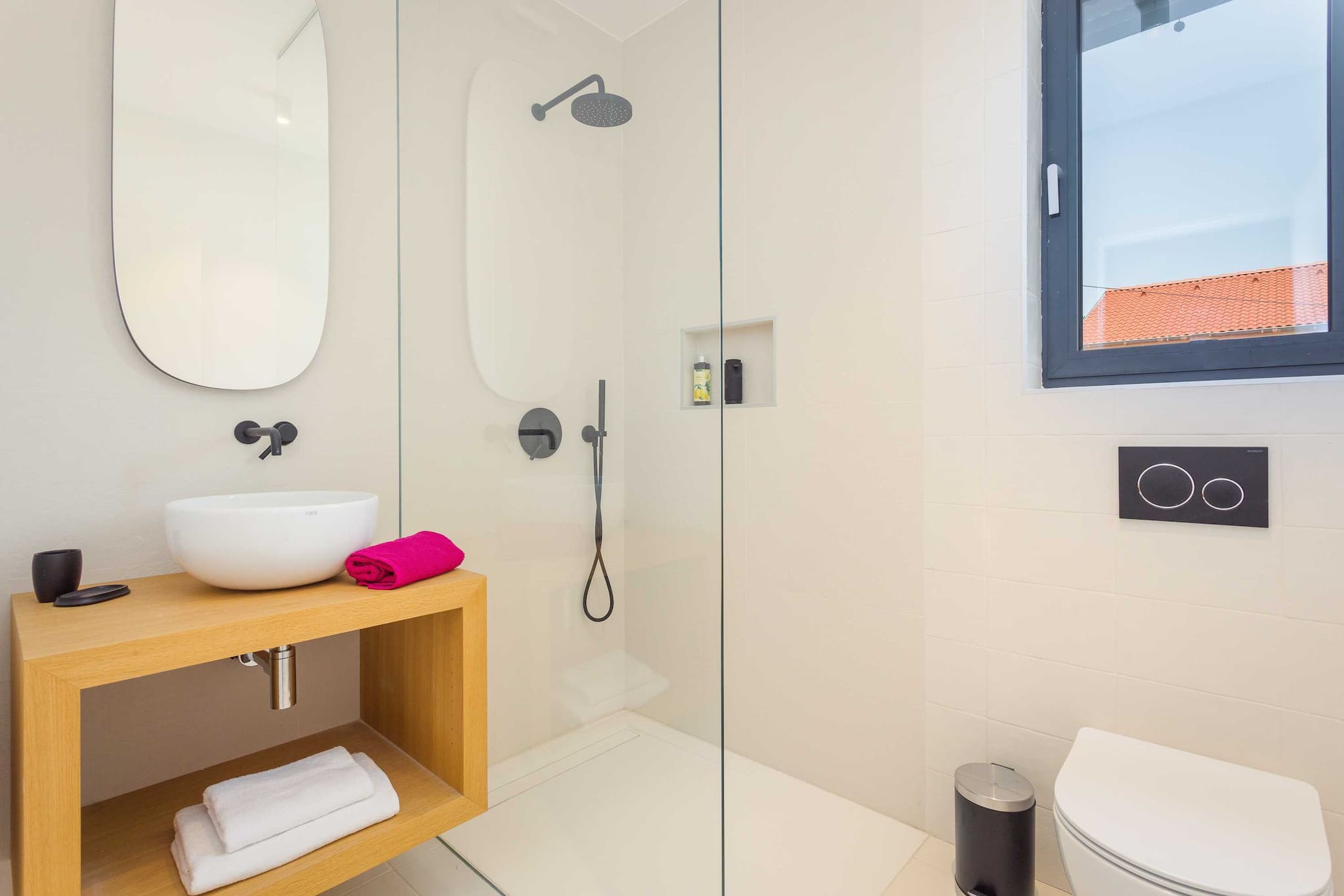 Beautifully designed staircase leads to a living room with sea view and lounge area, big kitchen with dining area and a big terrace with outdoor dining area and outstanding view. Guests can use BBQ facilities and dine enjoying the sea breeze.