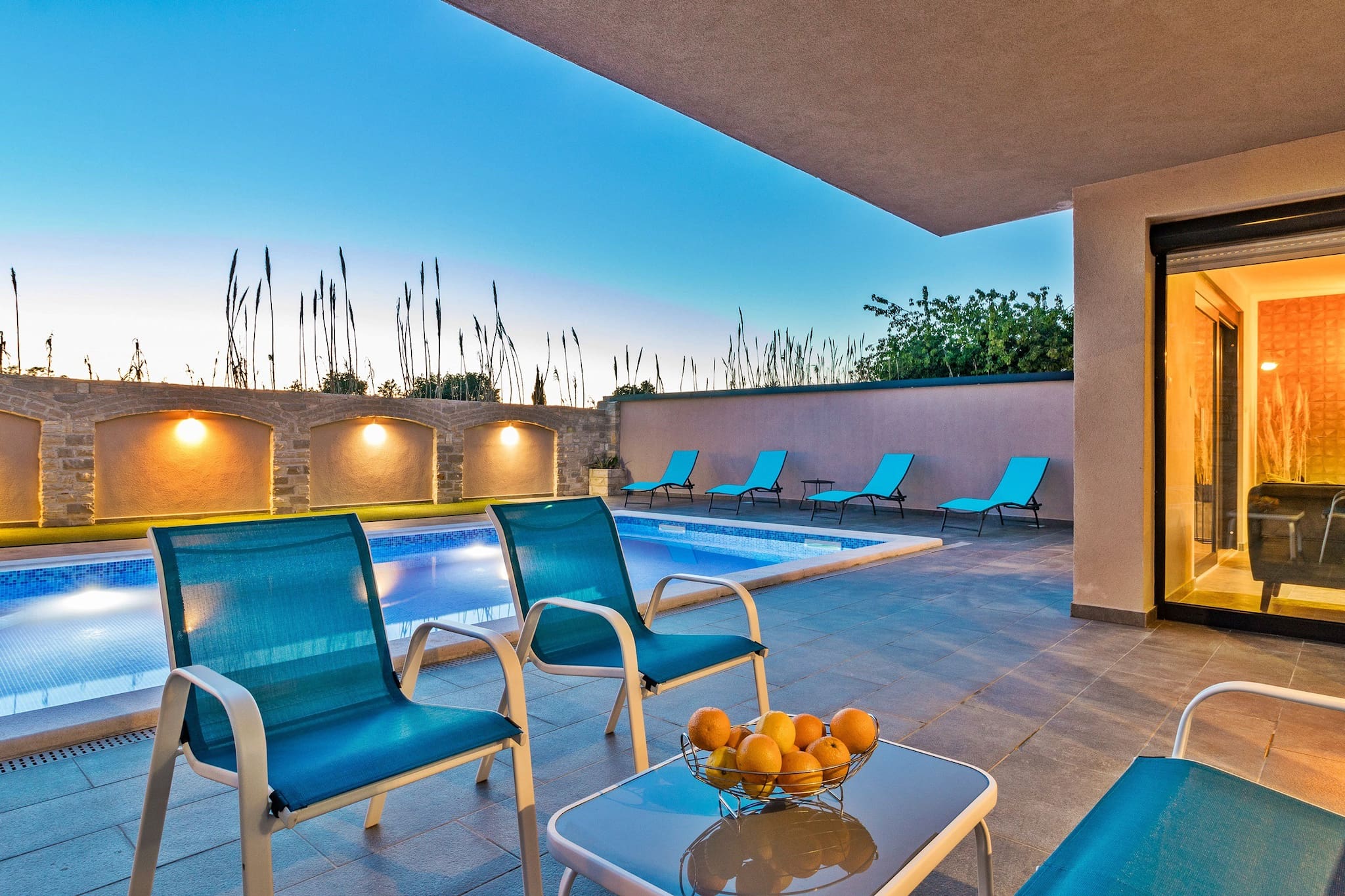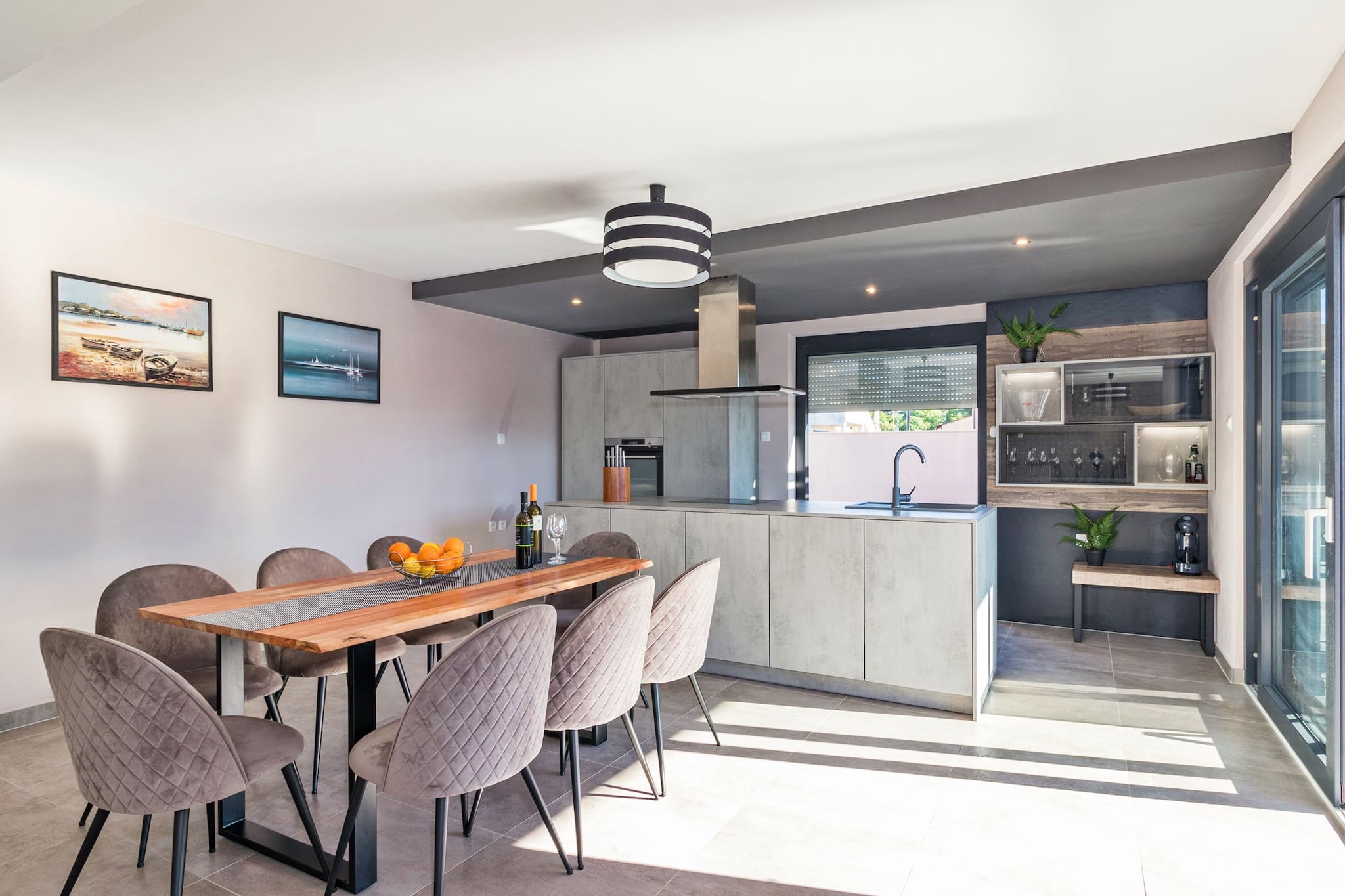 Outdoor space provides a lovely terrace with dining area and pool. The pool can be heated in pre-season and post-season upon request, for a fee of 140 EUR per week. If you'd like to use pool heating, please give us a 5-day notice.