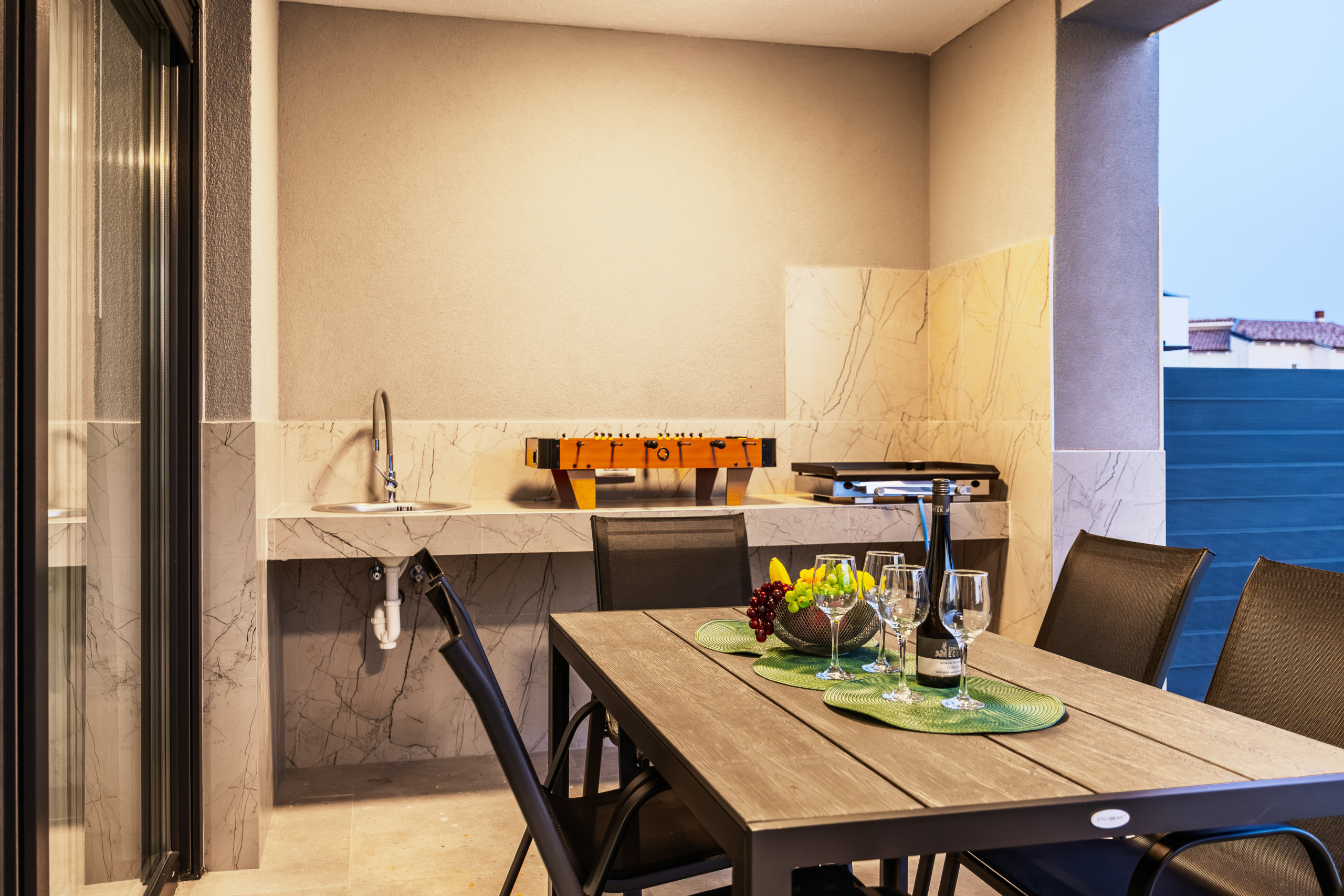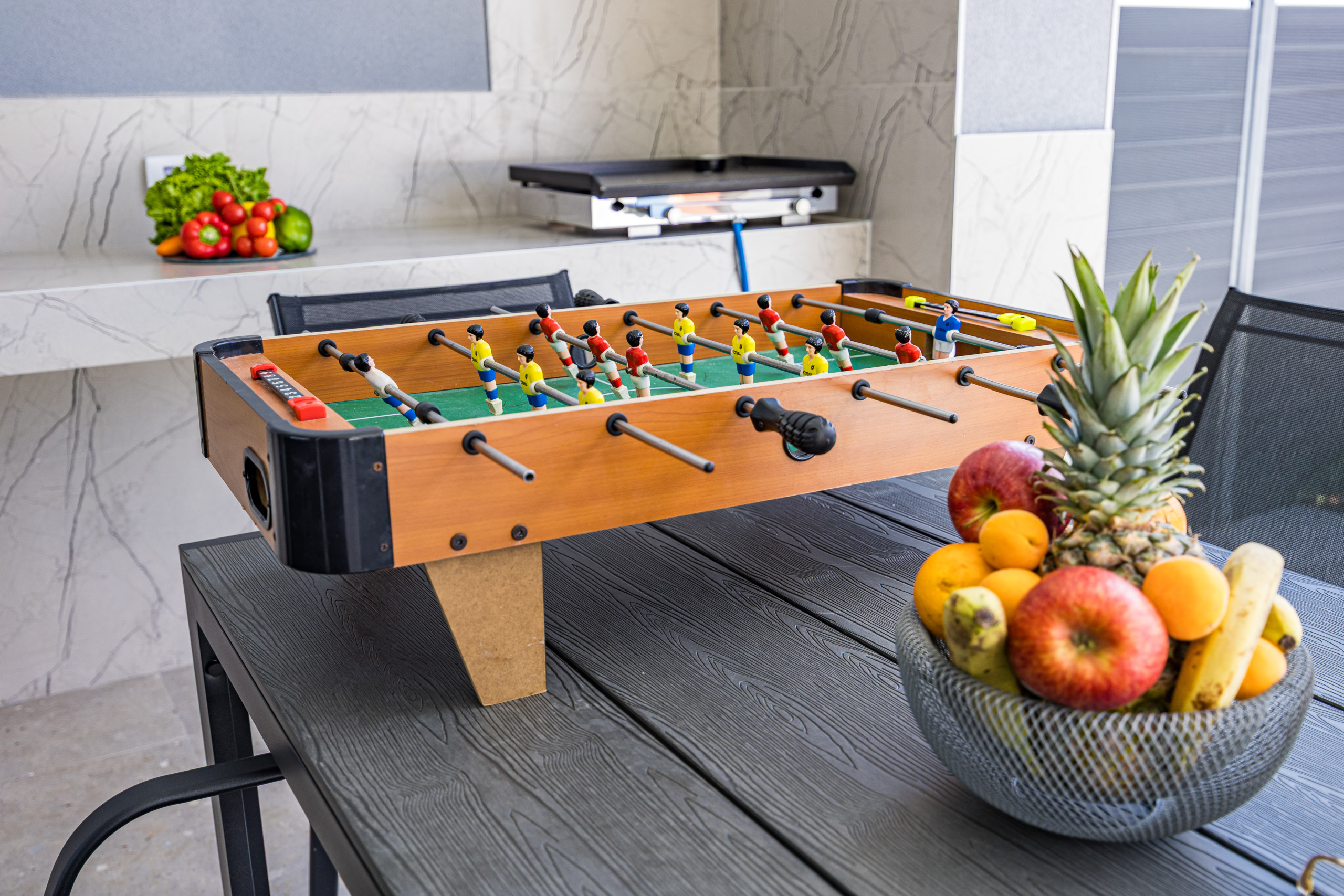 Inside, the villa is equipped with modern amenities to ensure a comfortable stay. The fully-fitted American-style kitchen features induction cooking, a dishwasher, and all necessary kitchenware. Entertainment is covered with three TVs, including a smart satellite option, and a small foosball table for family game nights.