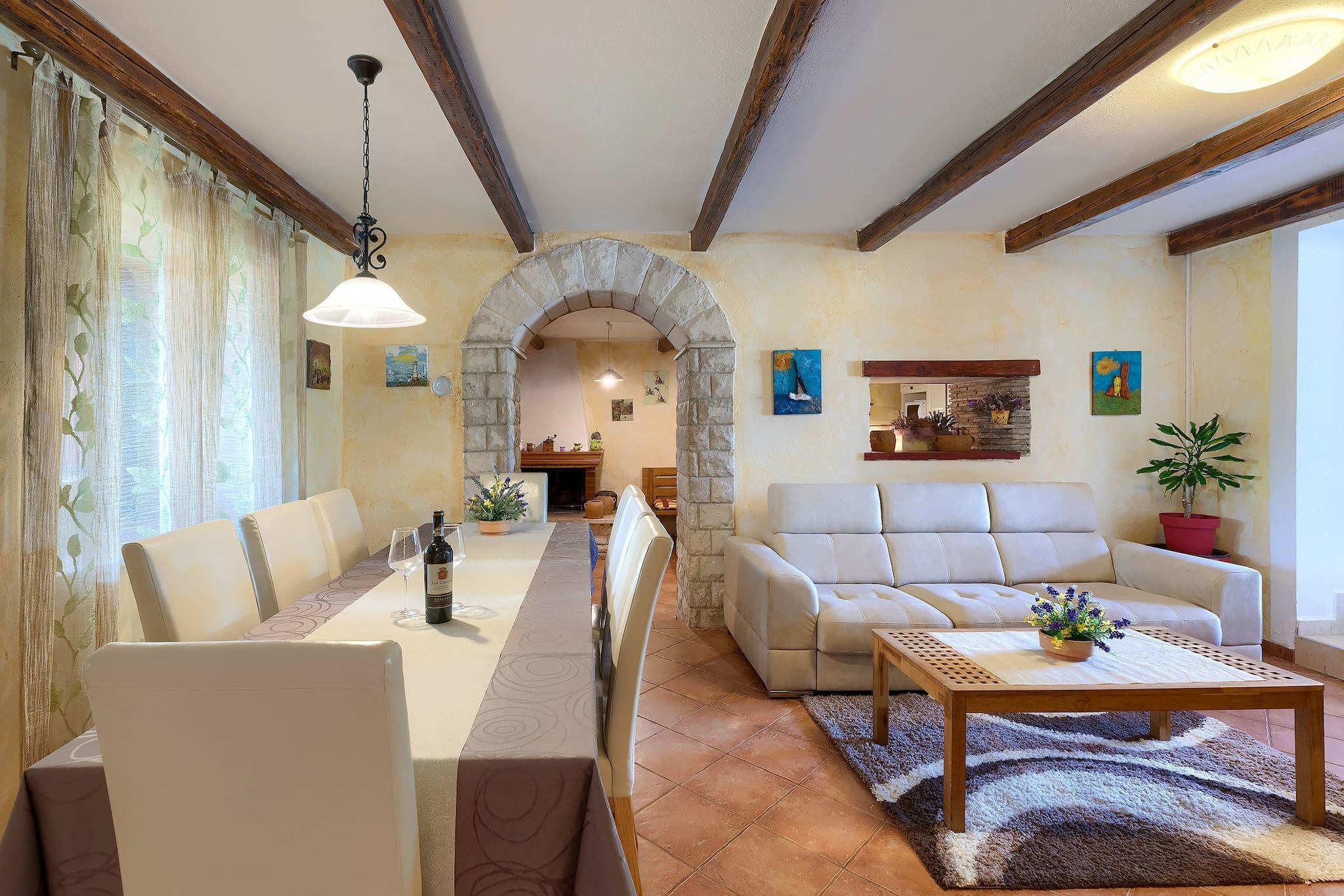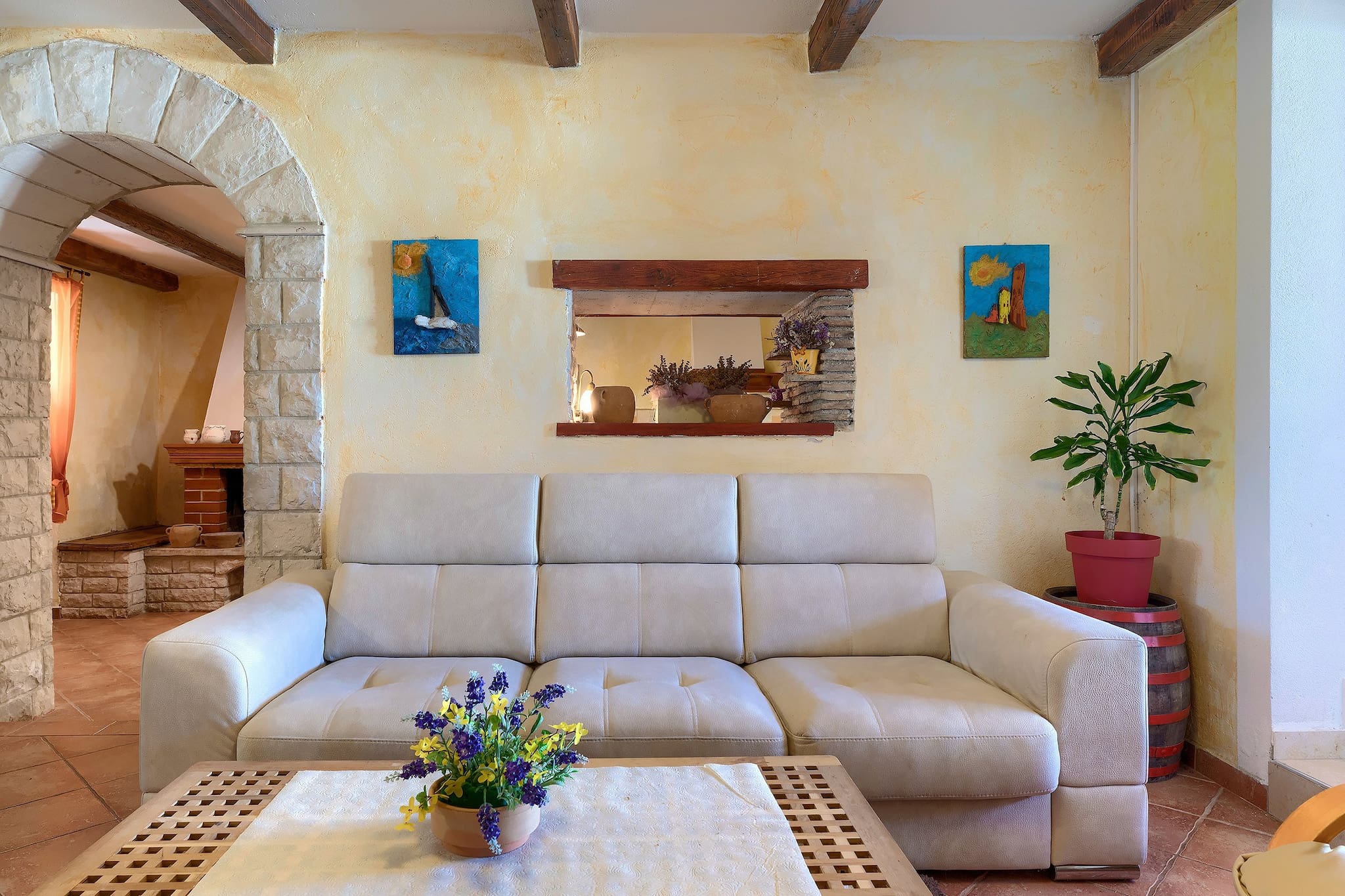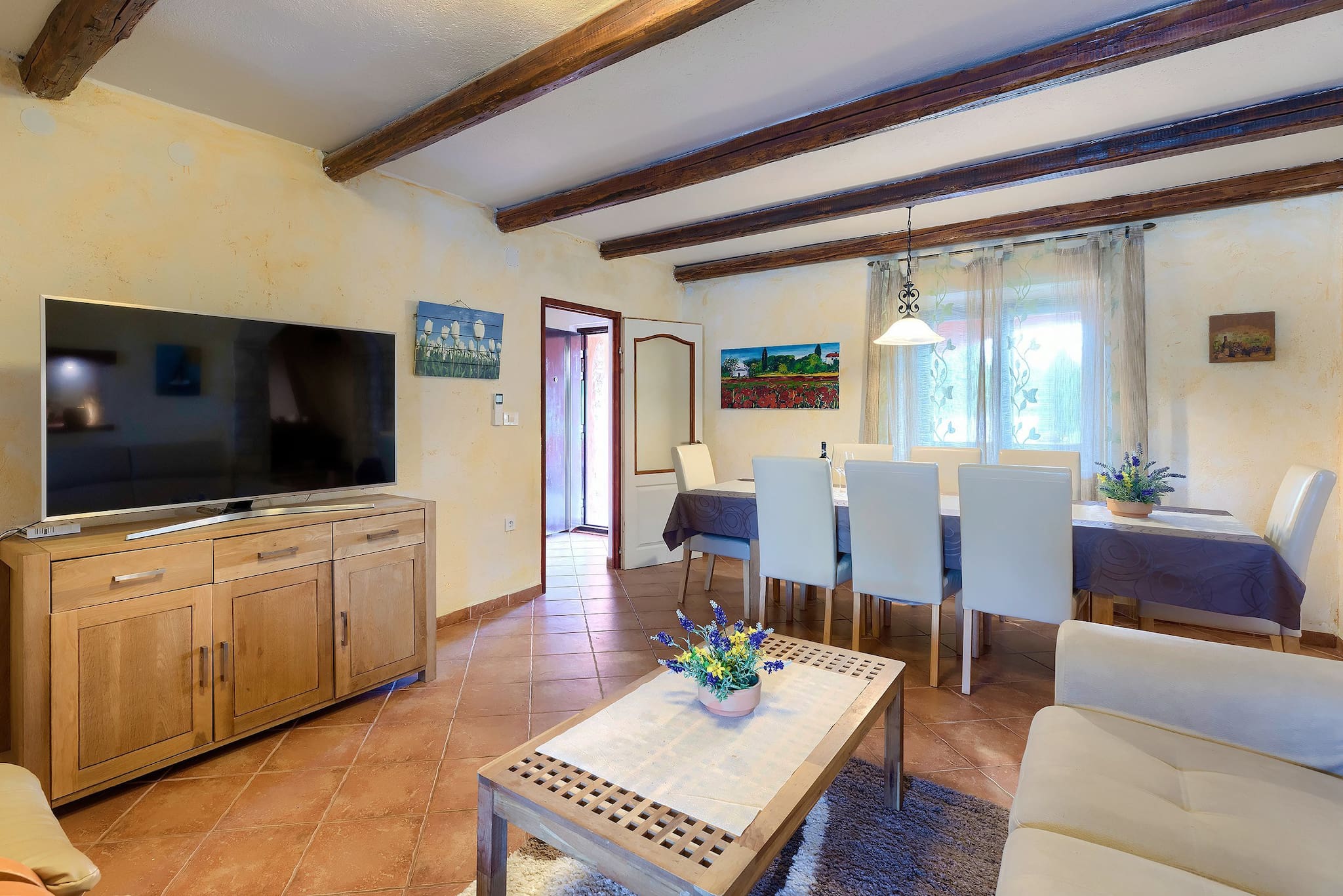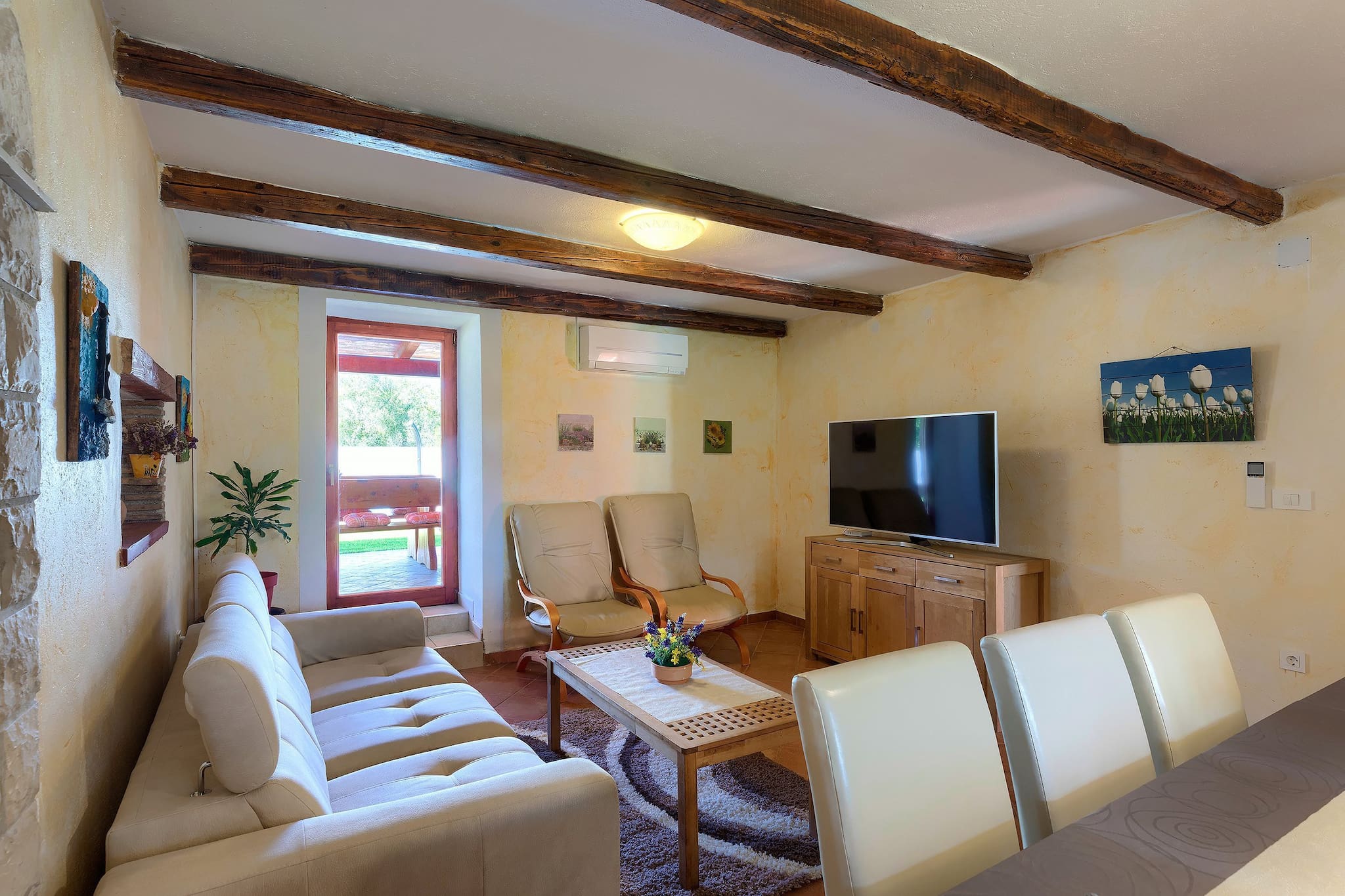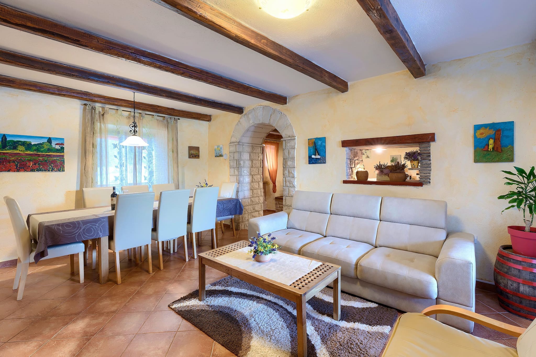 Villa Prisedi, features extremely nice rustic interior and exterior design. Guests can enjoy many additional contents, such as an: outdoor swimming pool, outdoor heated shower, entertainment room with table soccer, darts, PS4 console, fireplace grill on a roofed terrace, free Wi-fi, air-conditioning and free parking for three vehicles. Children's swing and climber are located in the garden.