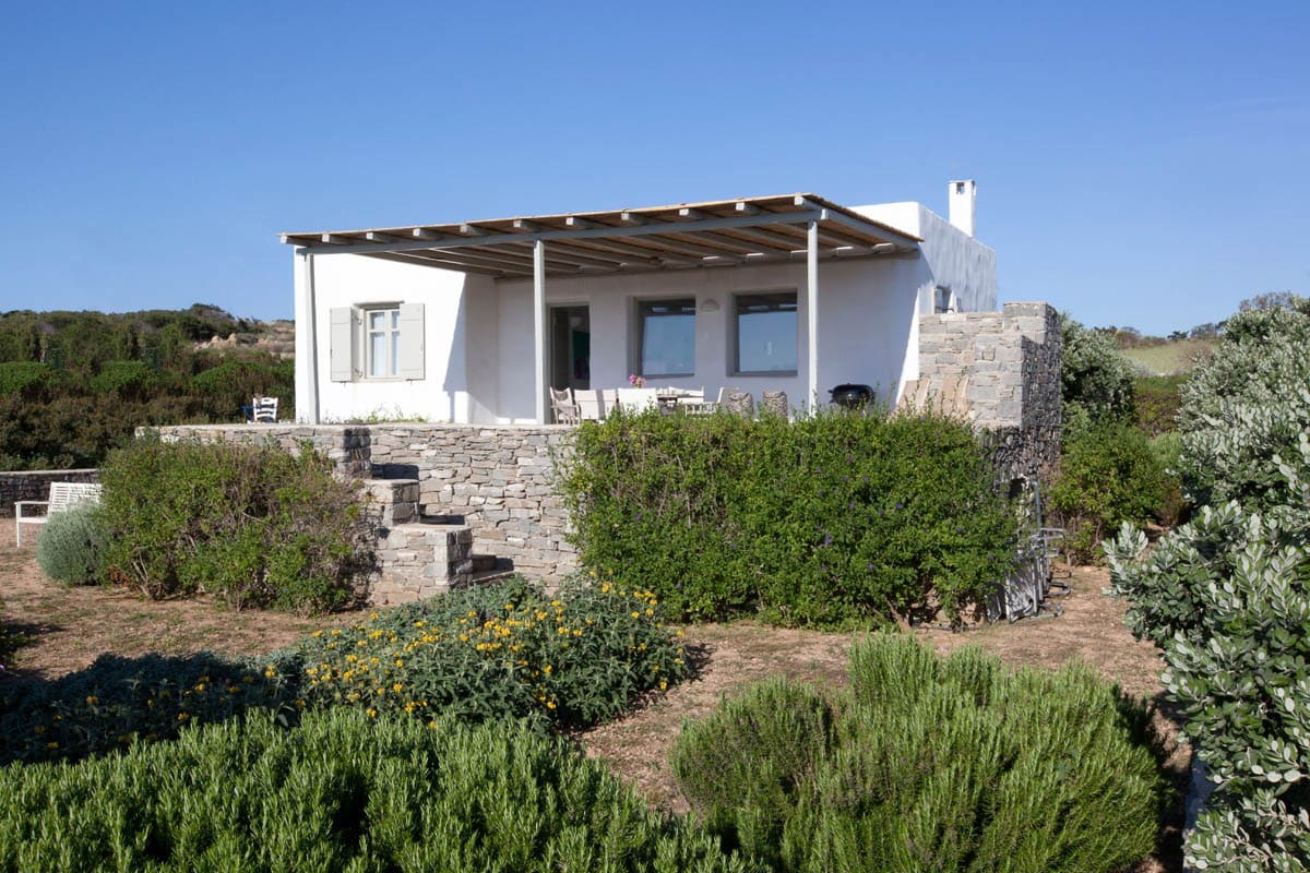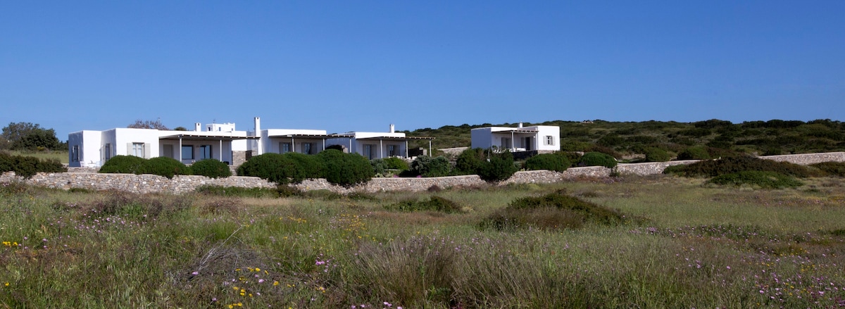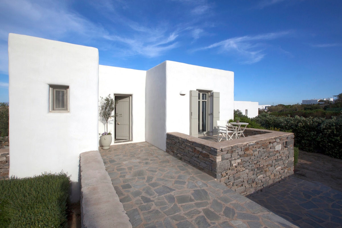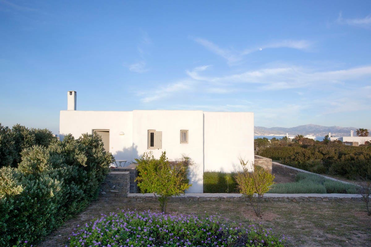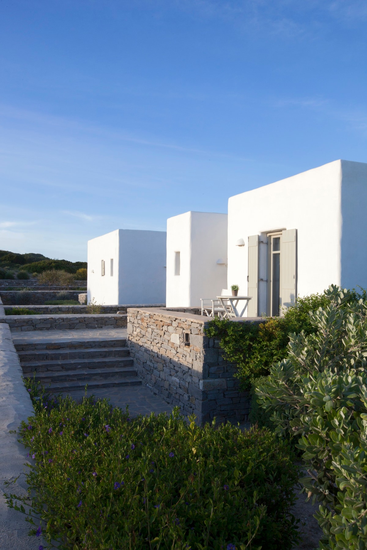 The villas are situated in a 4000 m2 plot of land with olive and fruit trees, aromatic herbs, lavender and wild flowers, which you are free to use . Carefully designed and built following the minimal Cycladic architecture, using local materials of the highest quality, the villas blend harmonically with their natural environment.