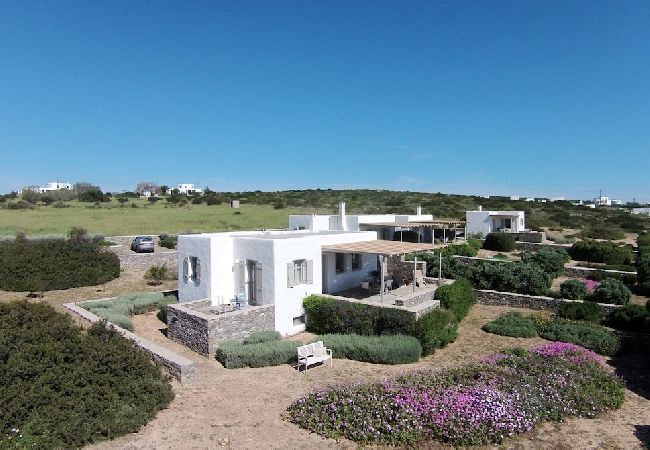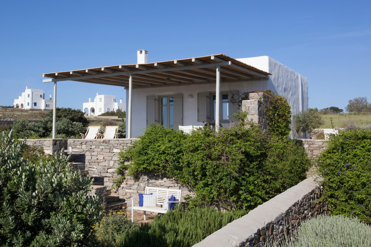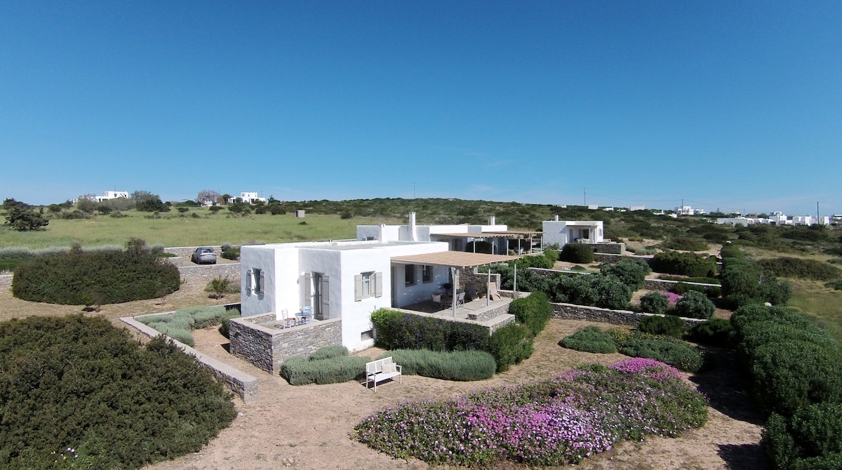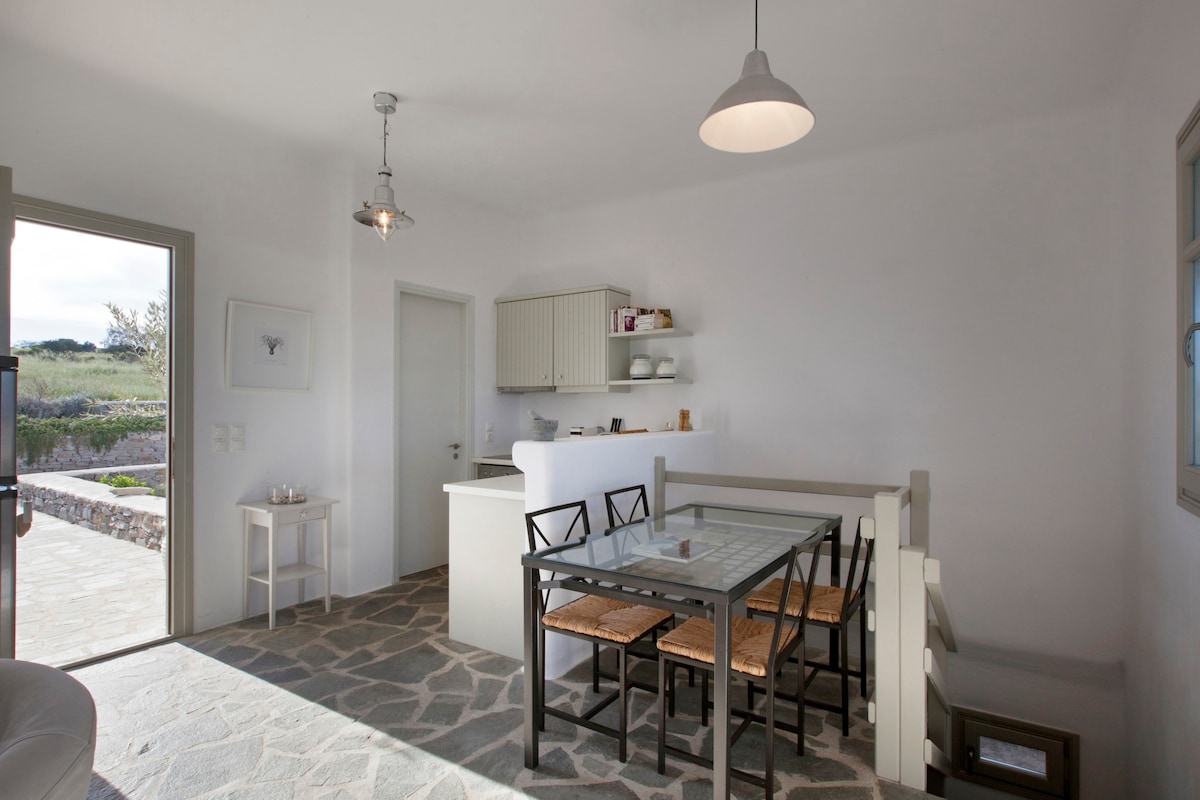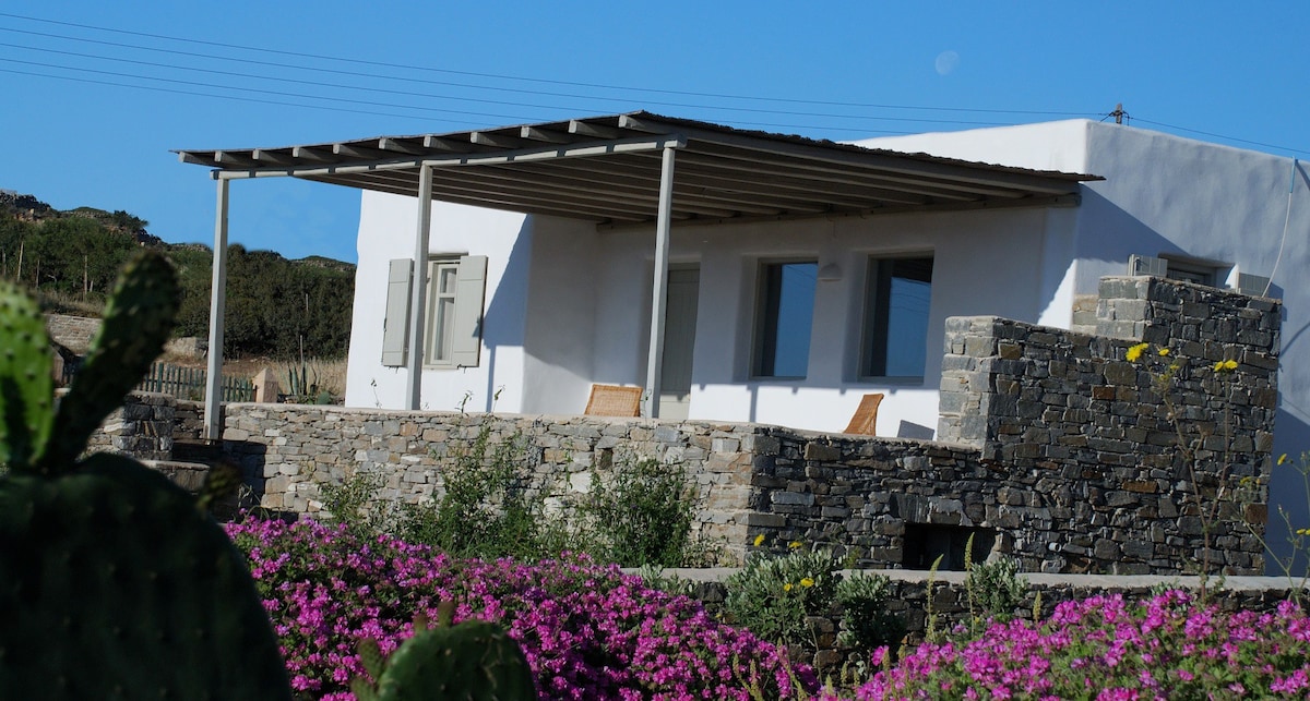 The villas are situated in a 4000 m2 plot of land with olive and fruit trees, aromatic herbs, lavender and wild flowers, which you are free to use . Carefully designed and built following the minimal Cycladic architecture, using local materials of the highest quality, the villas blend harmonically with their natural environment.