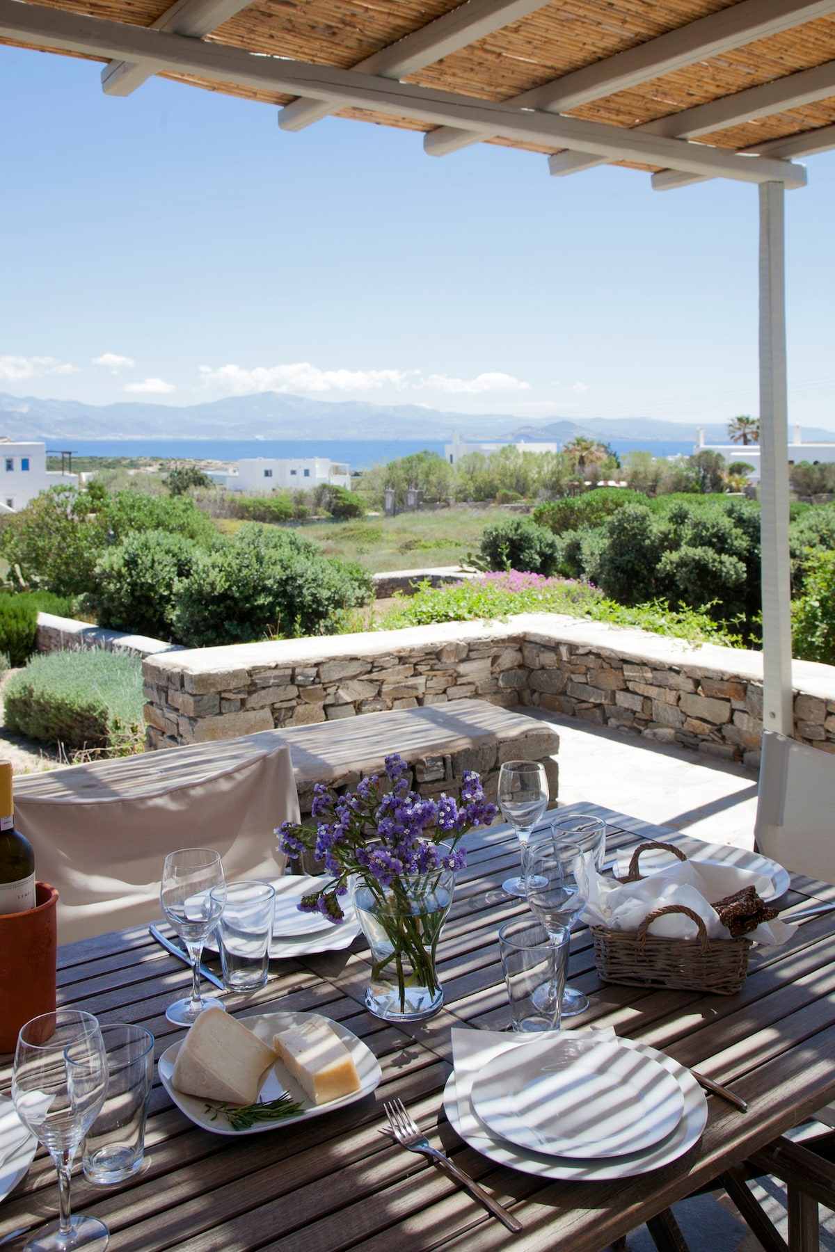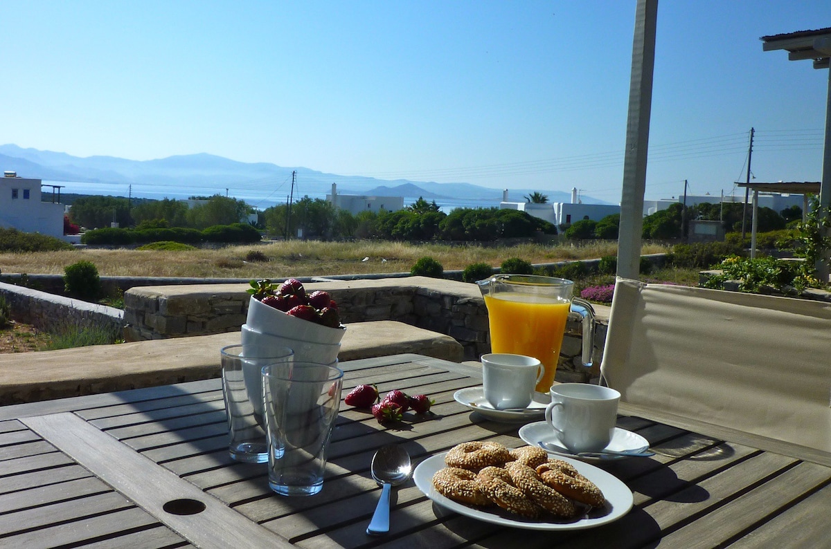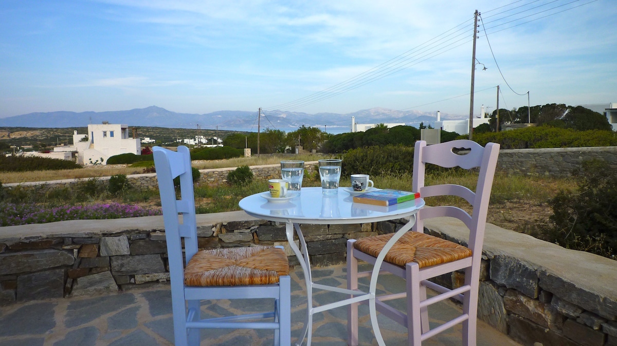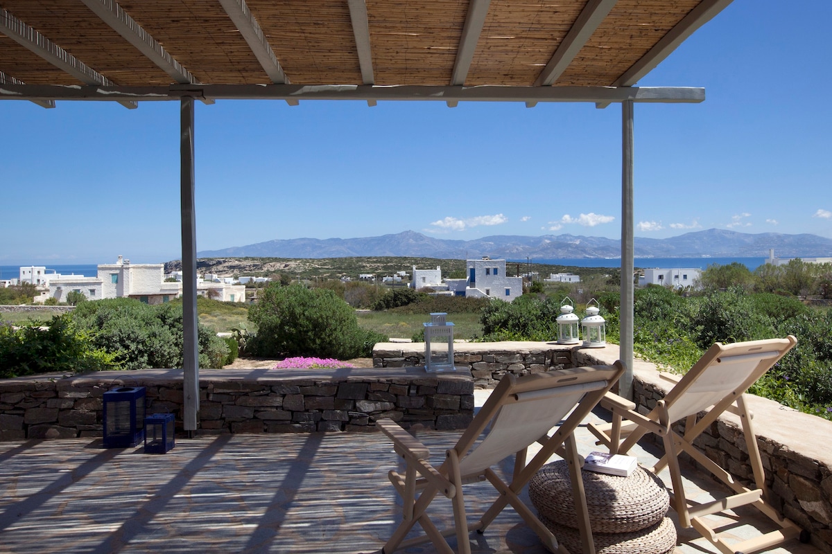 The large shaded terraces, which the villas enjoy, offer fabulous sea views, providing an ideal location for al fresco meals or evening cocktails with the moon and lights of Naxos island flicker across the sea.