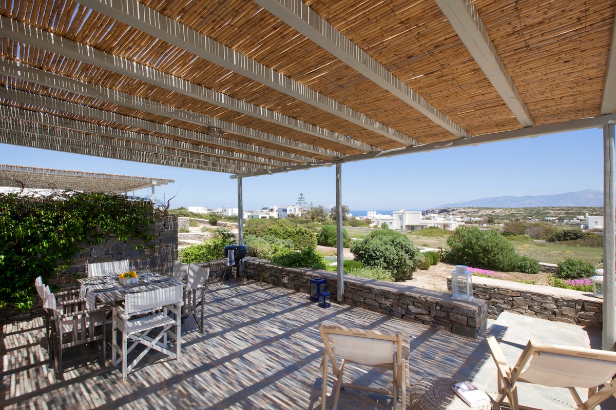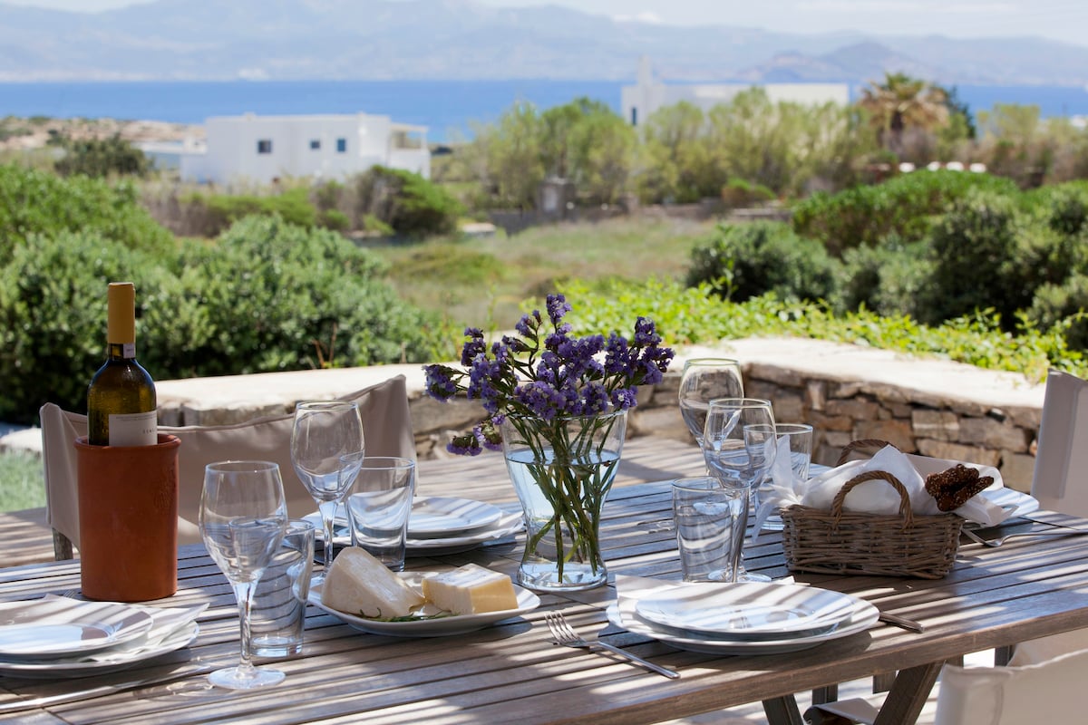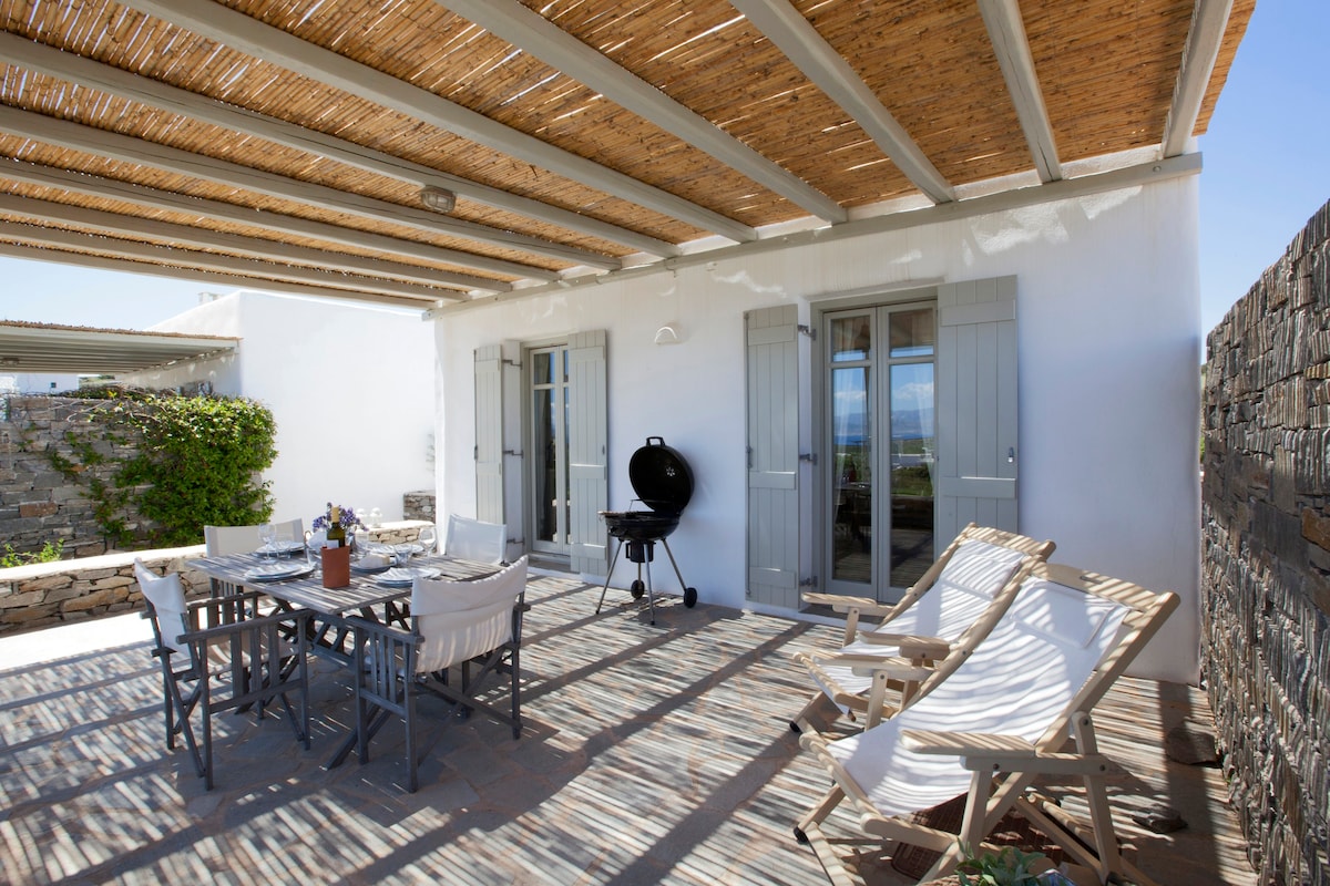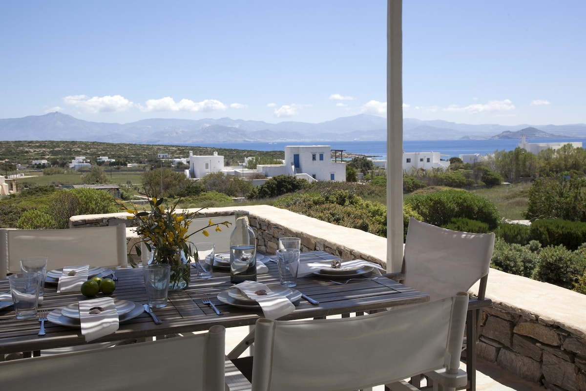 The large shaded terraces, which the villas enjoy, offer fabulous sea views, providing an ideal location for al fresco meals or evening cocktails with the moon and lights of Naxos island flicker across the sea.