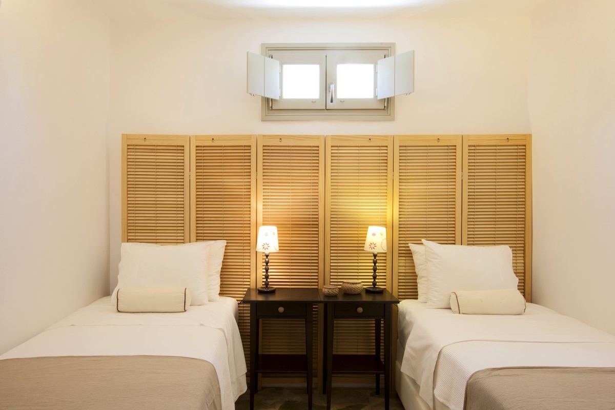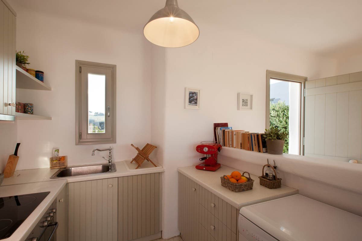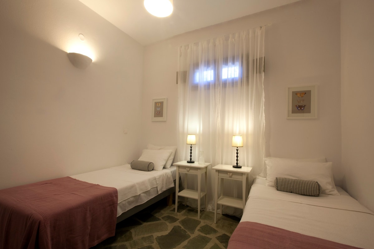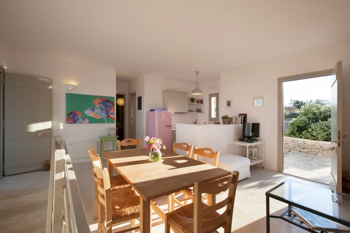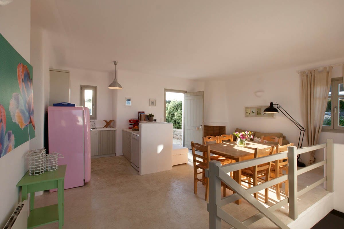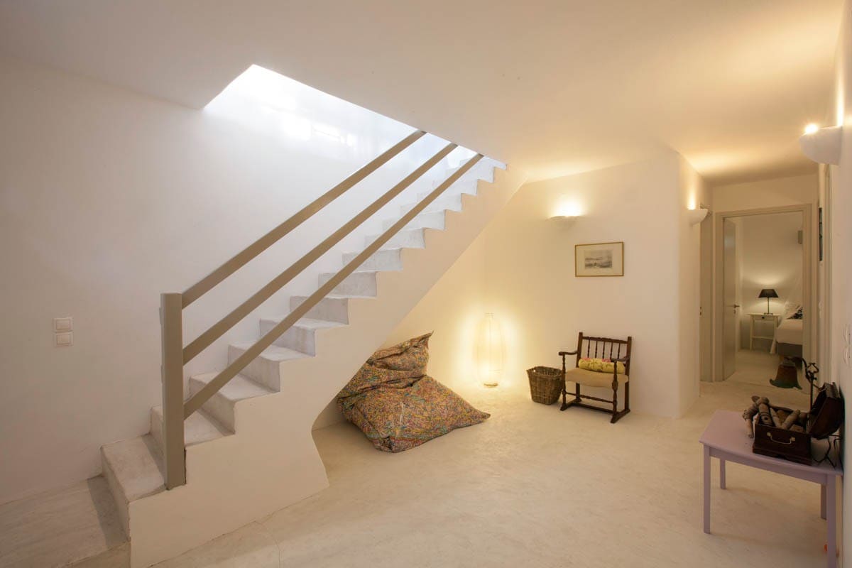 The interior spaces are bright, nicely decorated in cool tons of white and beige. Simple lines, earth coloured furniture, stone and polished concrete floors and Aegean white walls bring out a laid-back feeling. The layout or the rooms offers the best possible privacy for everyone living in it.