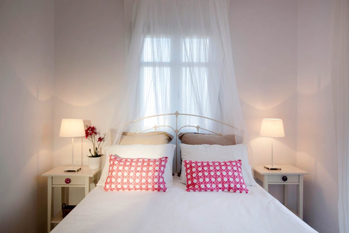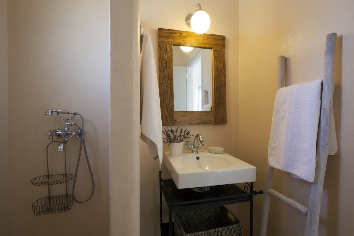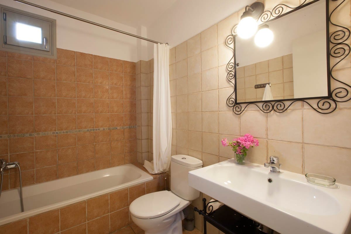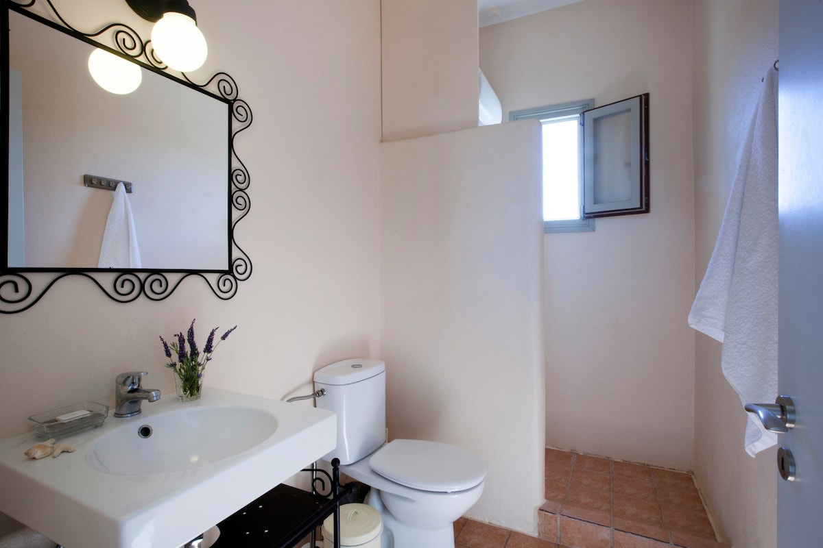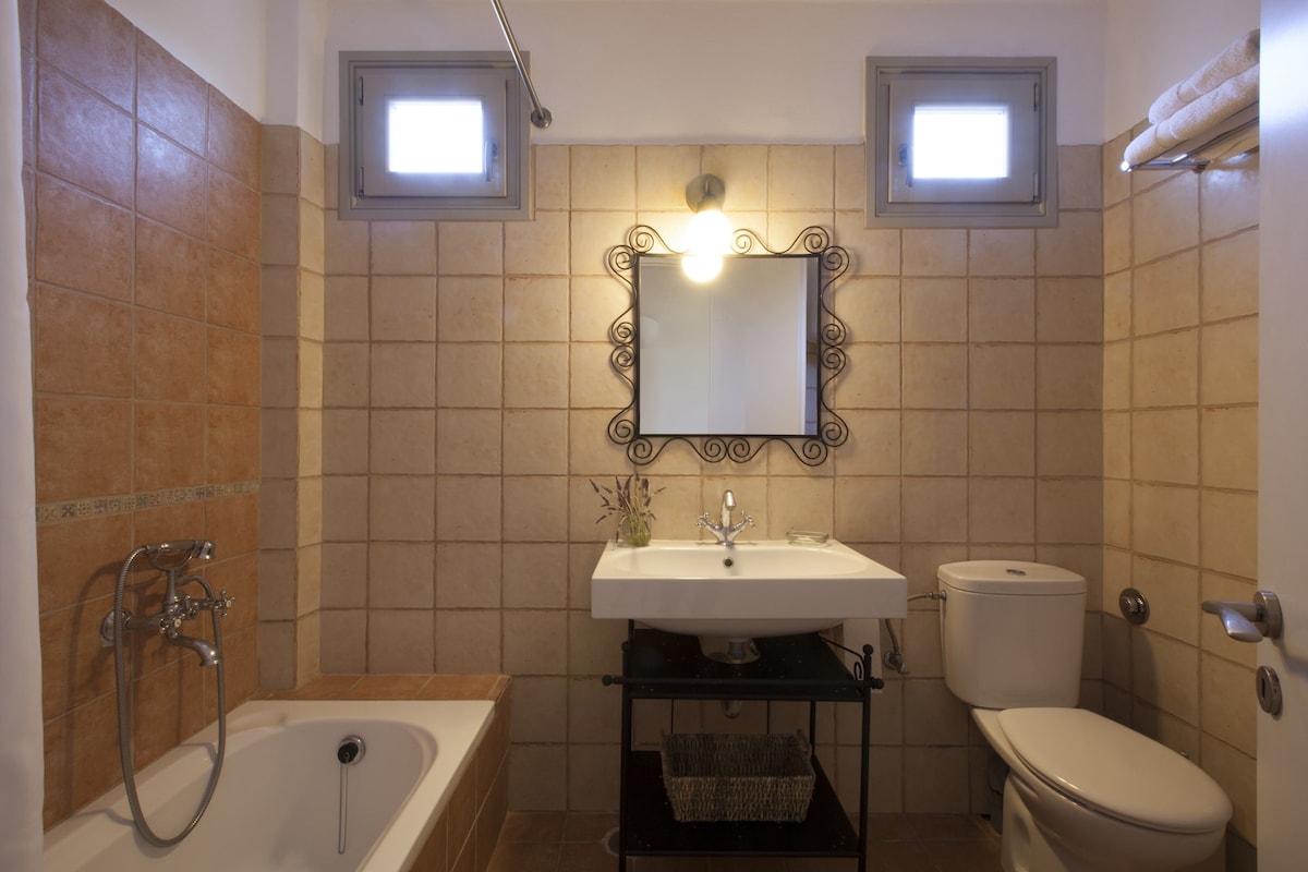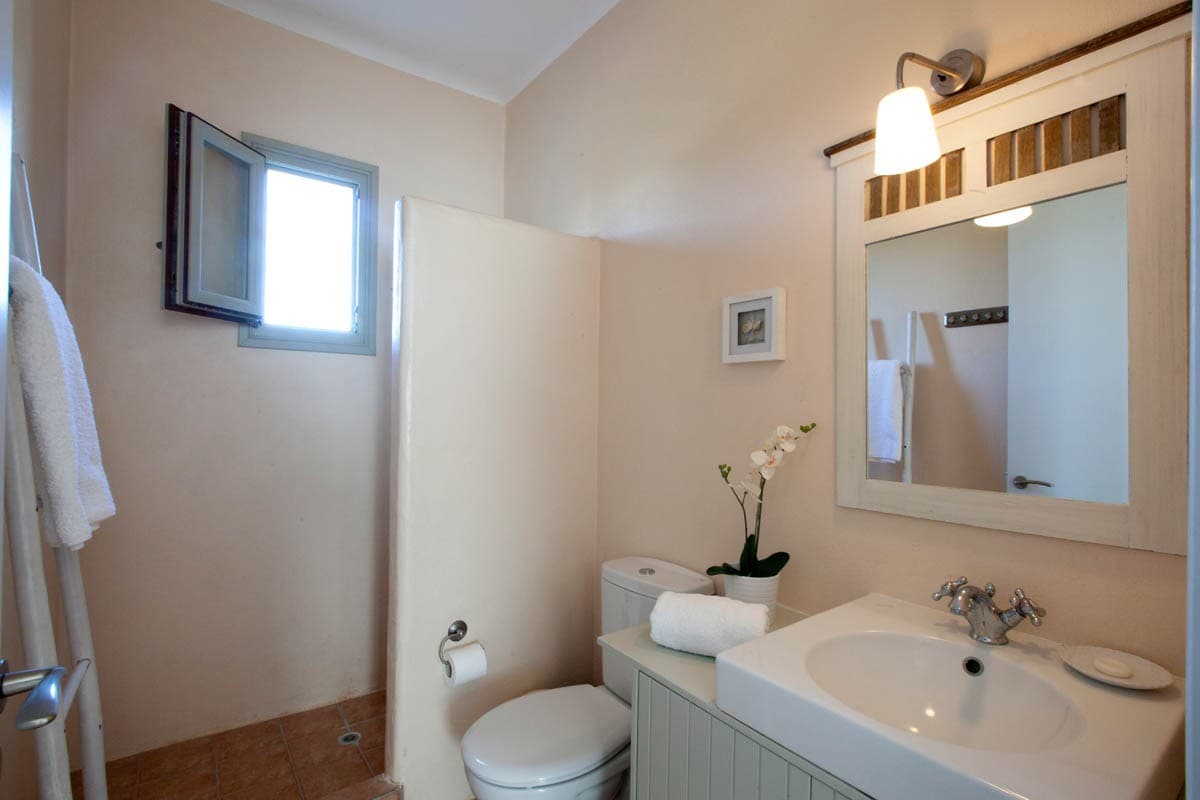 The interior spaces are bright, nicely decorated in cool tons of white and beige. Simple lines, earth coloured furniture, stone and polished concrete floors and Aegean white walls bring out a laid-back feeling. The layout or the rooms offers the best possible privacy for everyone living in it.