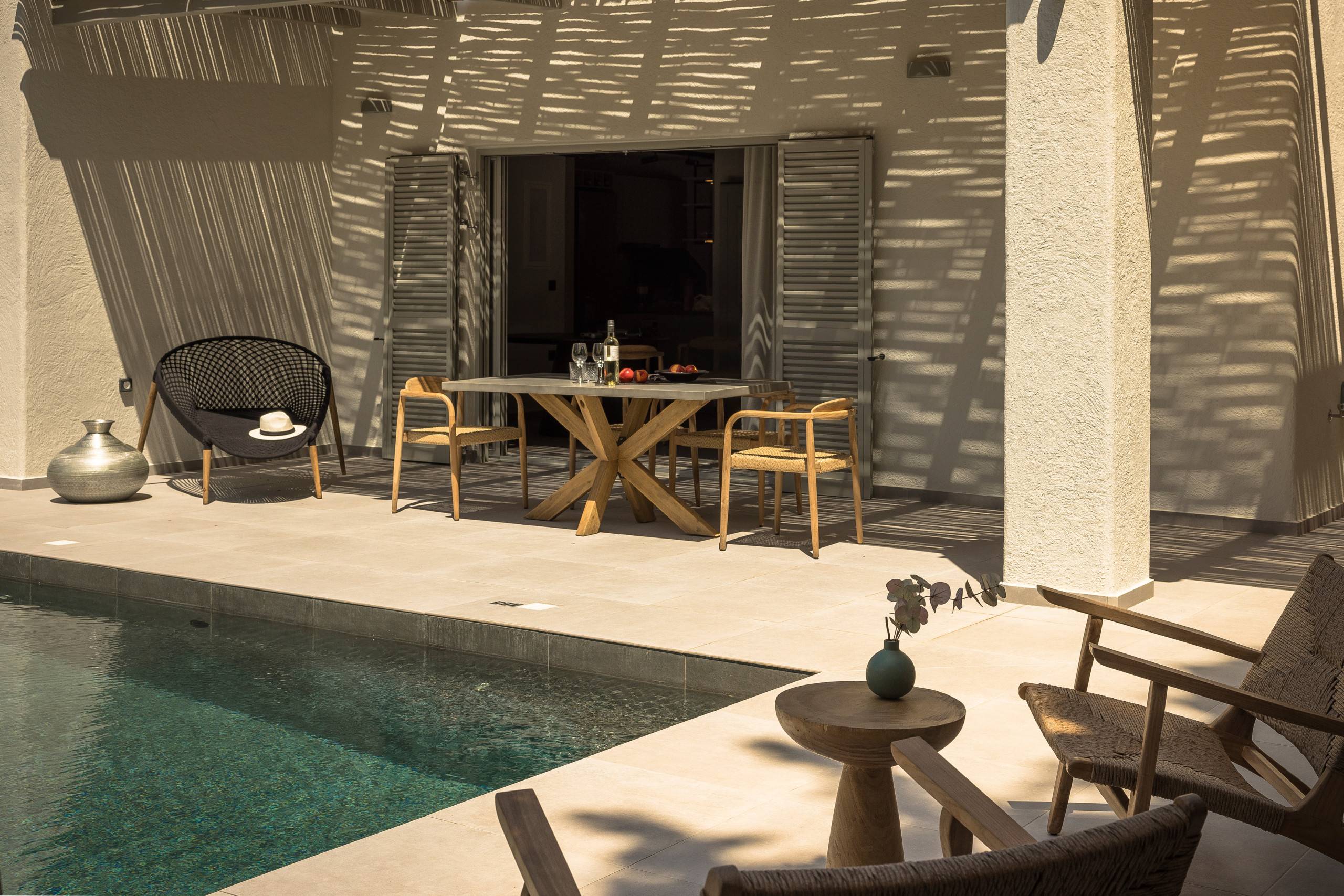 The interiors of the one storey villa are stylish and impressive, with a main living, dining and kitchen area open plan design, boasting patio doors opening onto the swimming pool terrace with stylish outdoor furniture.