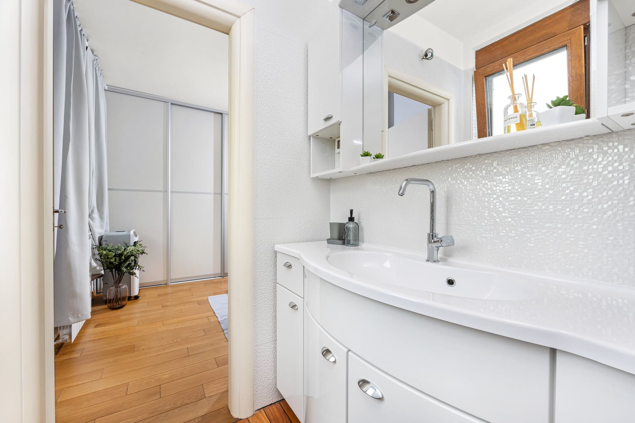 The interior of the house consists of aliving room connected with the kitchen, three bedrooms and two bathrooms. The master bedroom has an en-suite bathroom, while the other one can be accessed from the hallway. All of the bedrooms have air conditioning.
